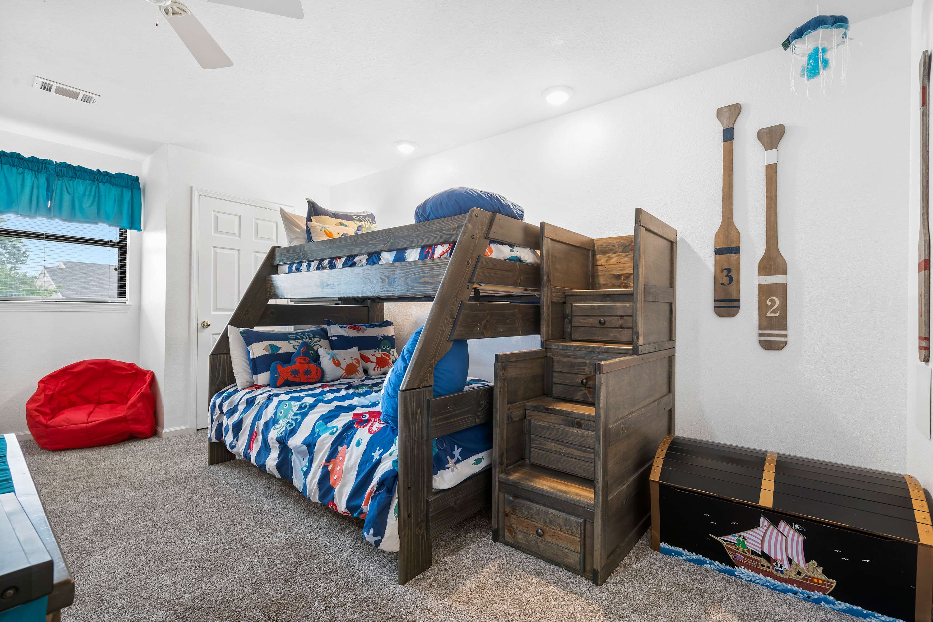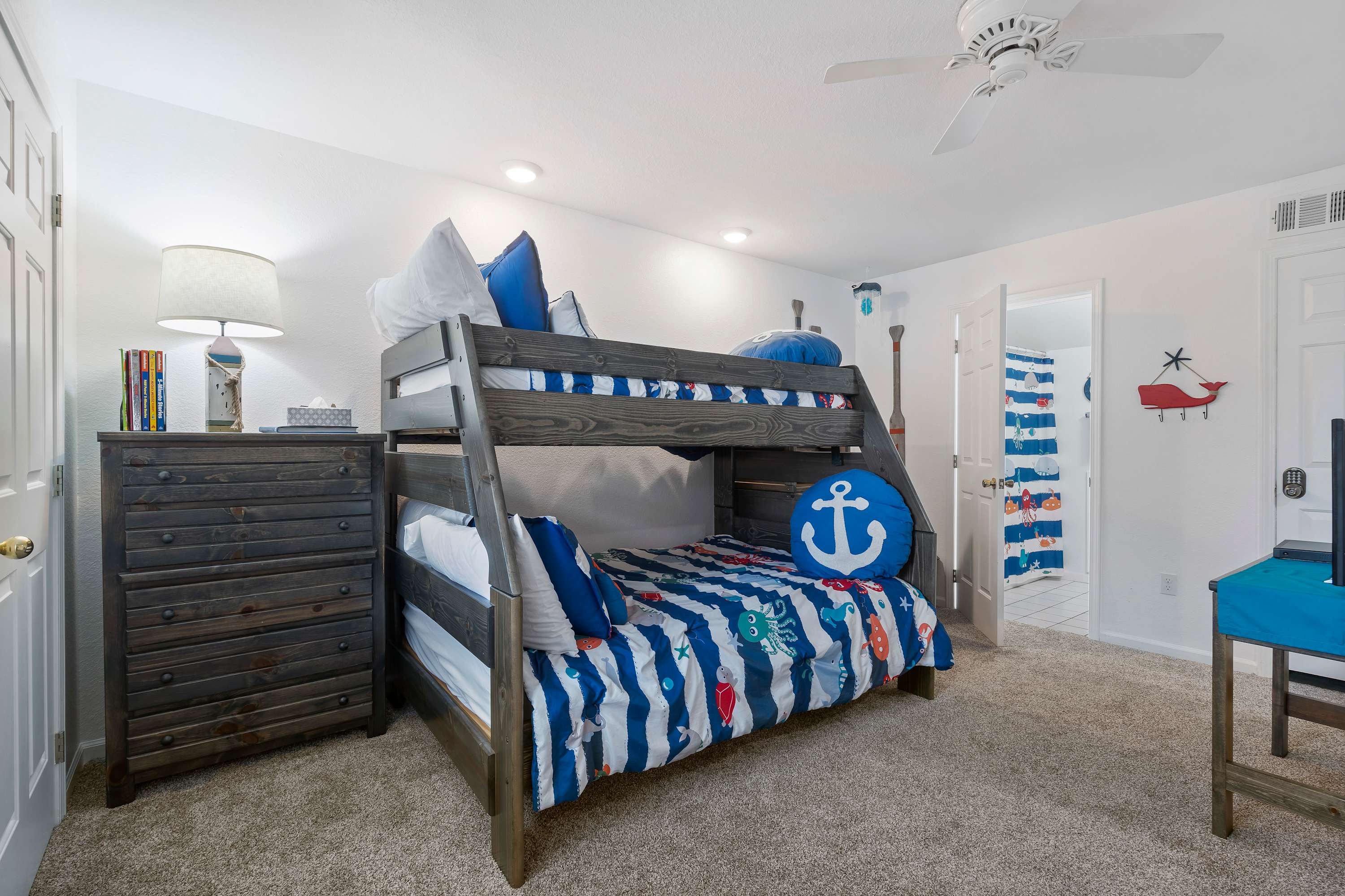 Bedroom #3 is a bunk room with a twin bed on top and a full-size bed on the bottom. This room also has an ensuite bathroom with shower/tub combo.