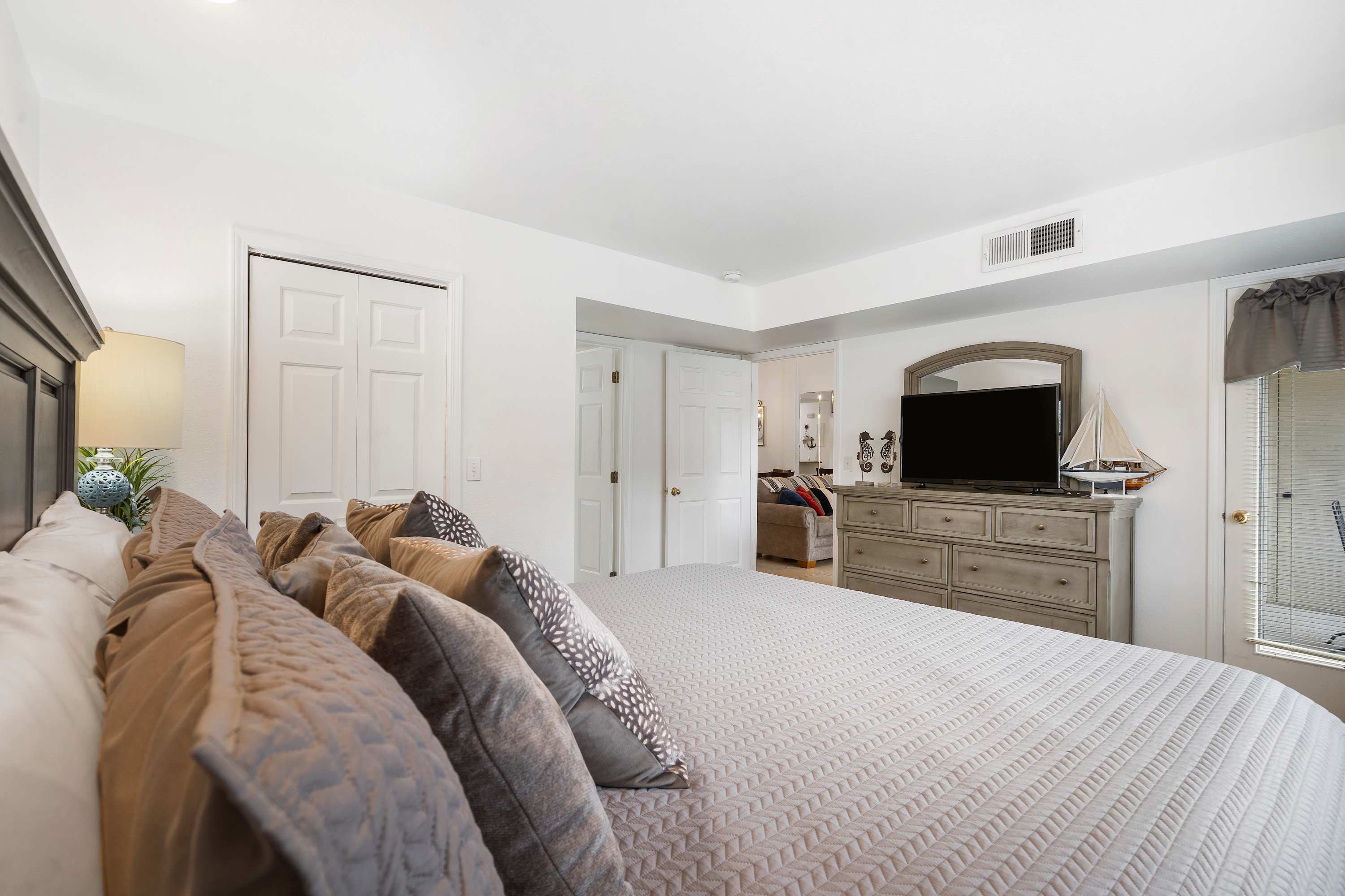 Bedroom #2 is the primary suite with a king-size bed, tv, and ensuite bathroom with a shower/tub combo and double sink vanity. This room also has direct access to the covered balcony space.