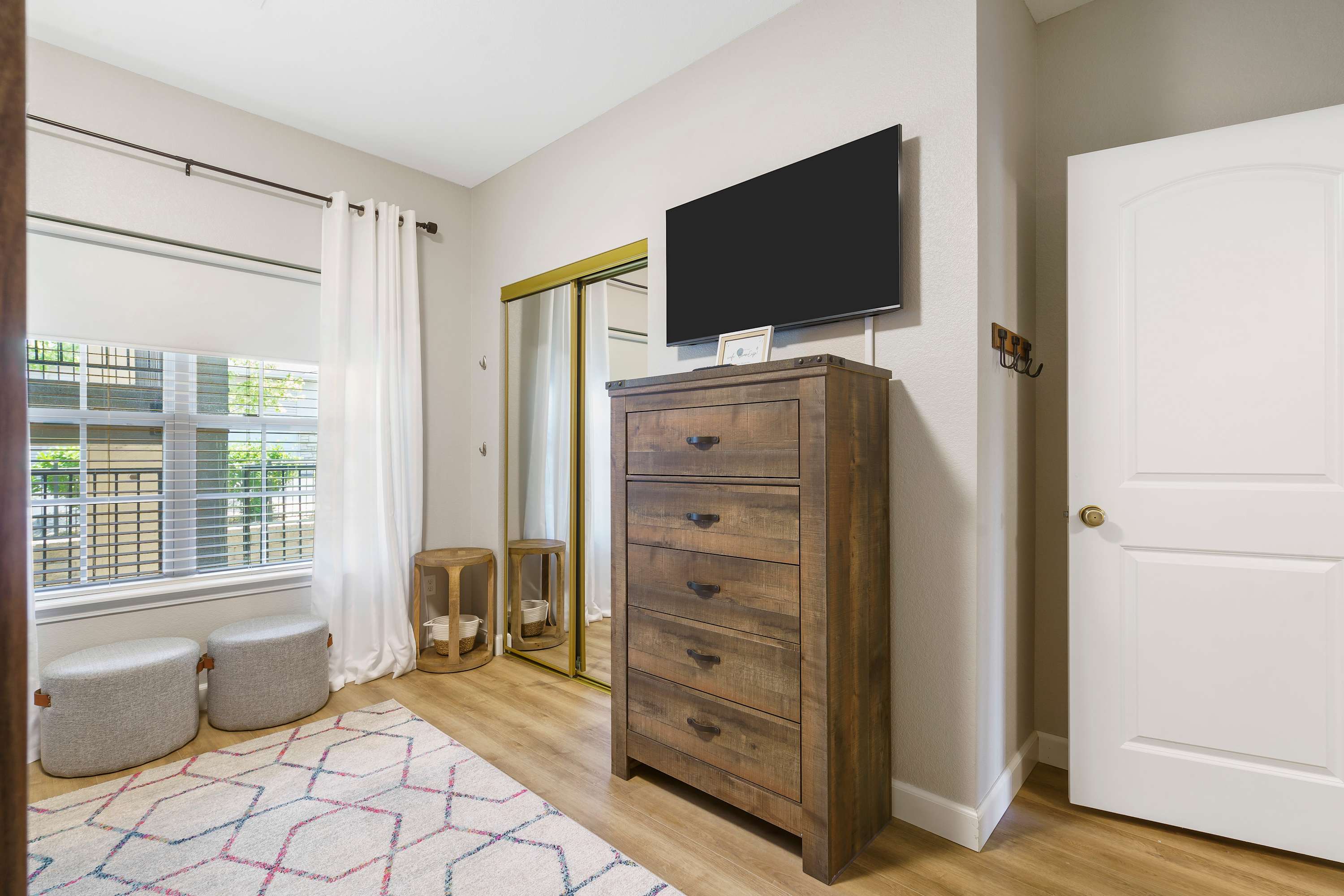 Bright and luscious, the living room is full of charm. Elegant, white interiors blend tastefully with wooden accents and contemporary décor. A large glass door allows plenty of sunlight, elevating the mood of the house, as comfy, plump couches gather around a sleek smart TV.