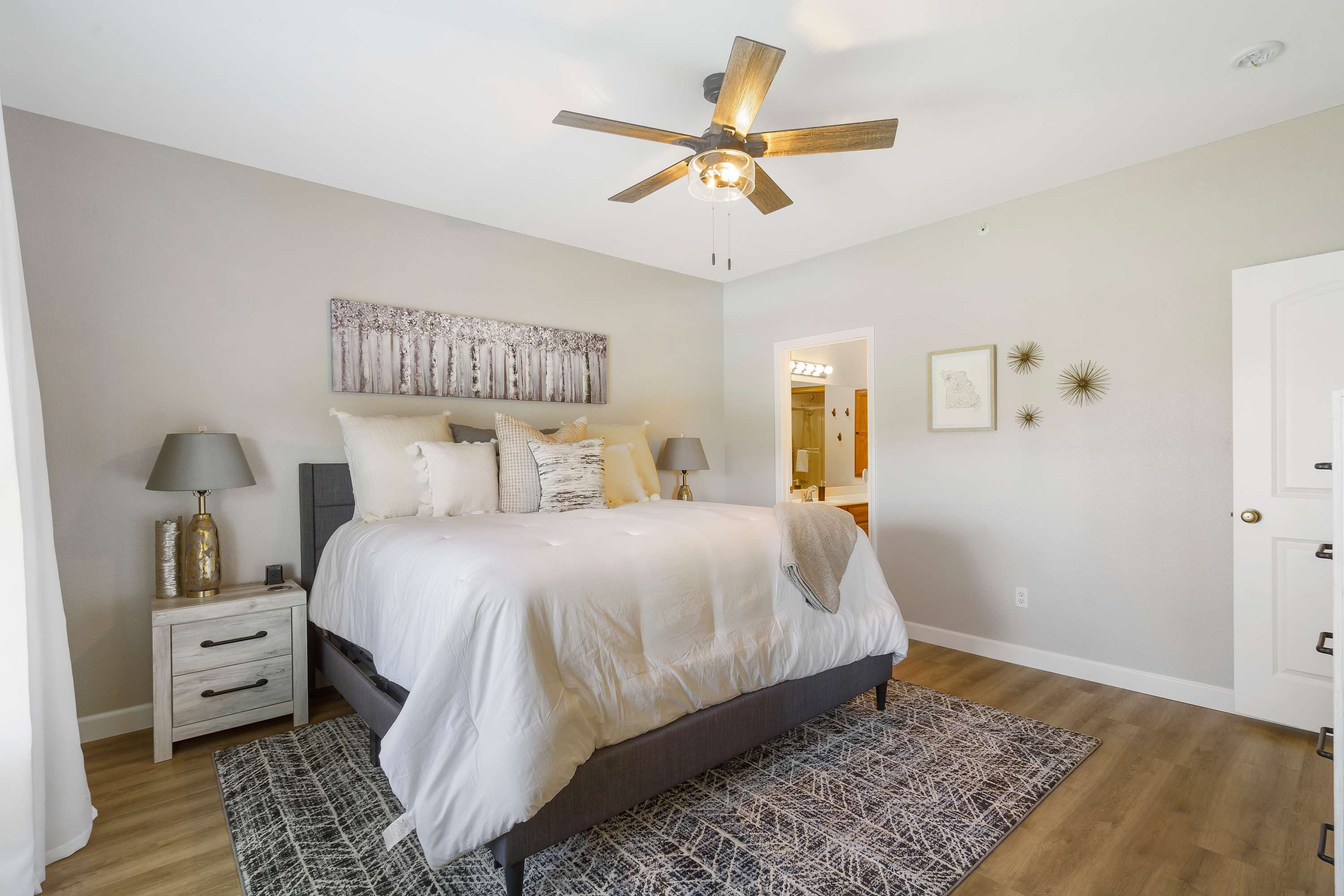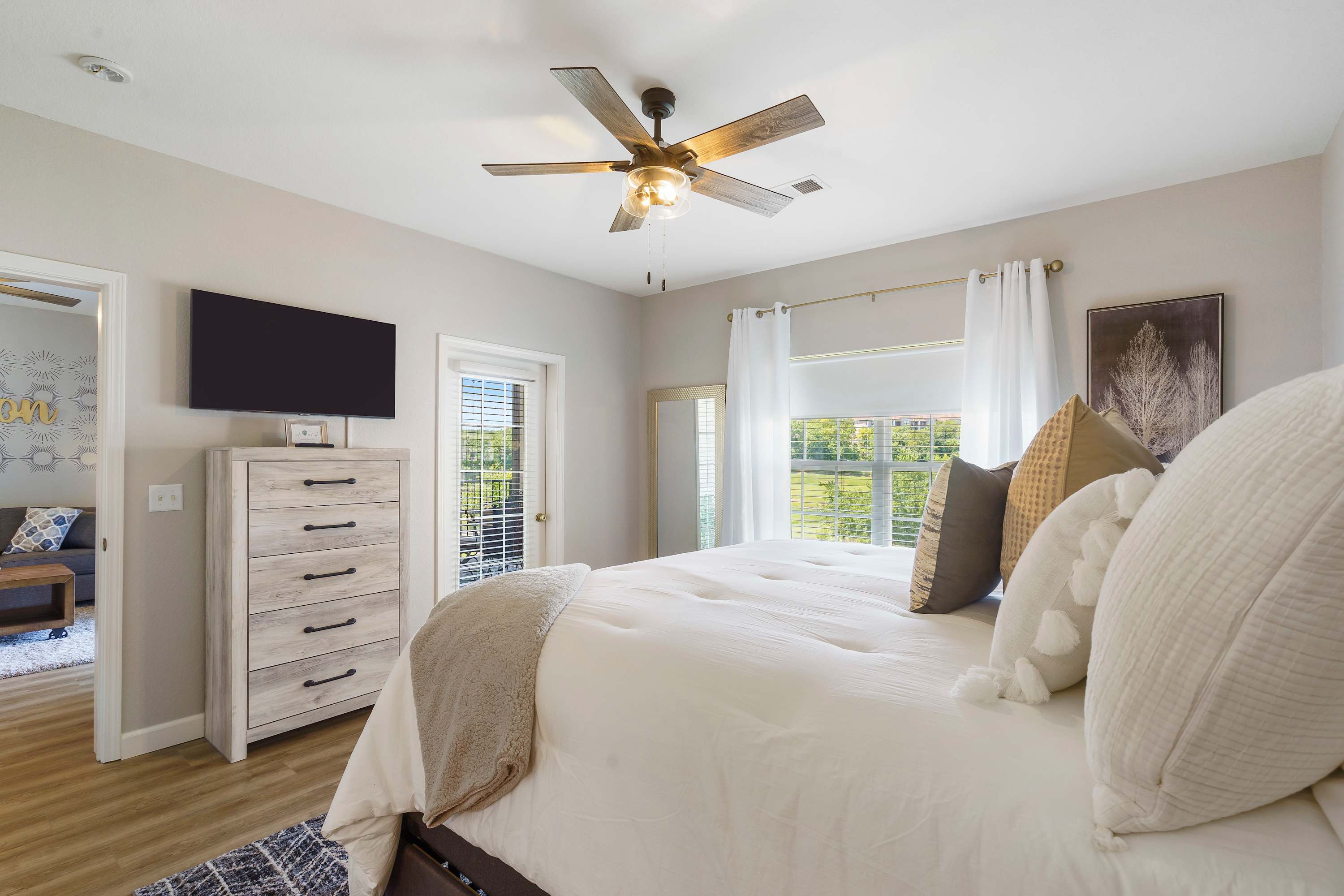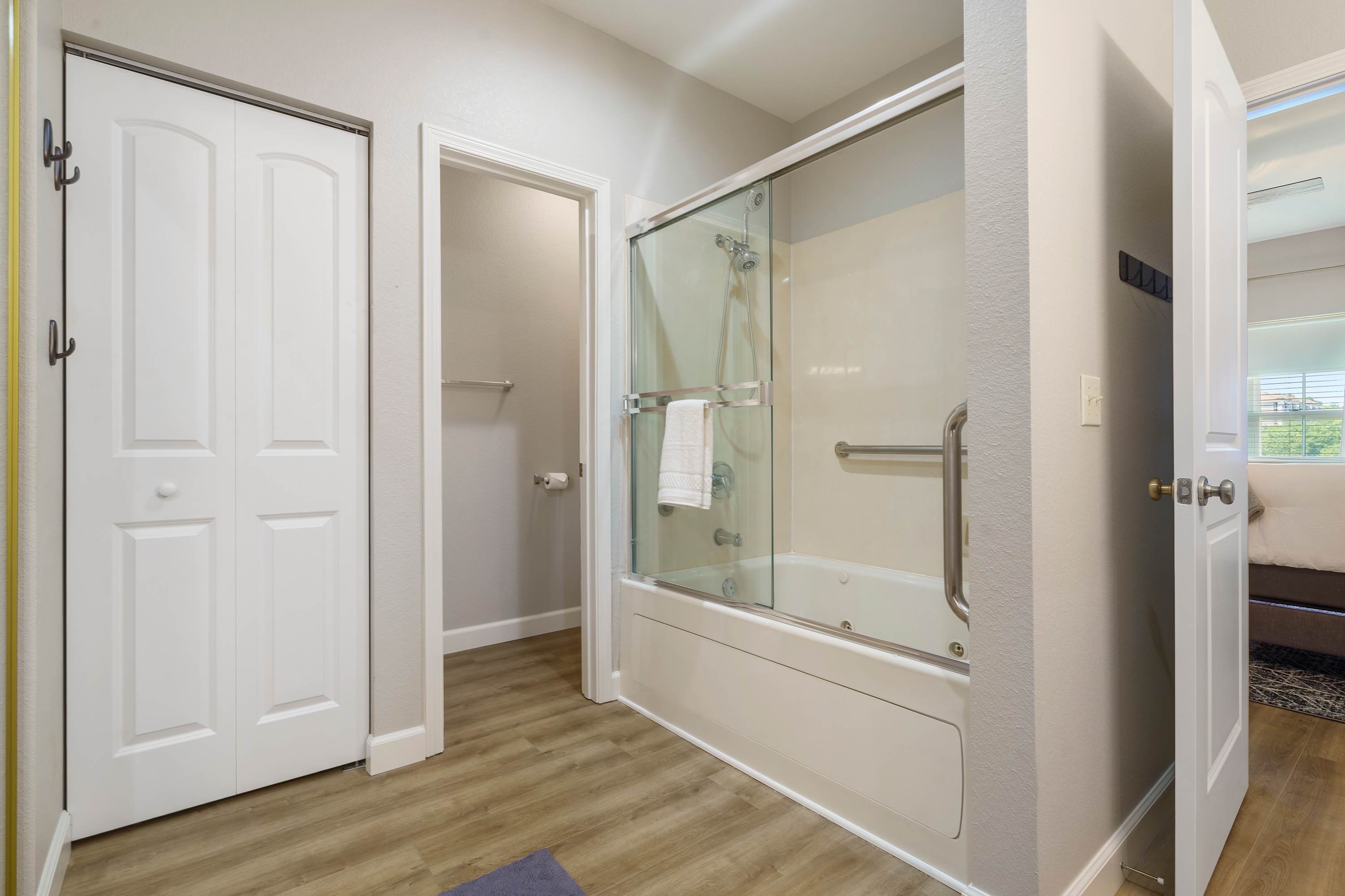 Bedroom #1 is the master. is equipped with a king-size bed, smart TV, and an en-suite bathroom with a jetted tub.