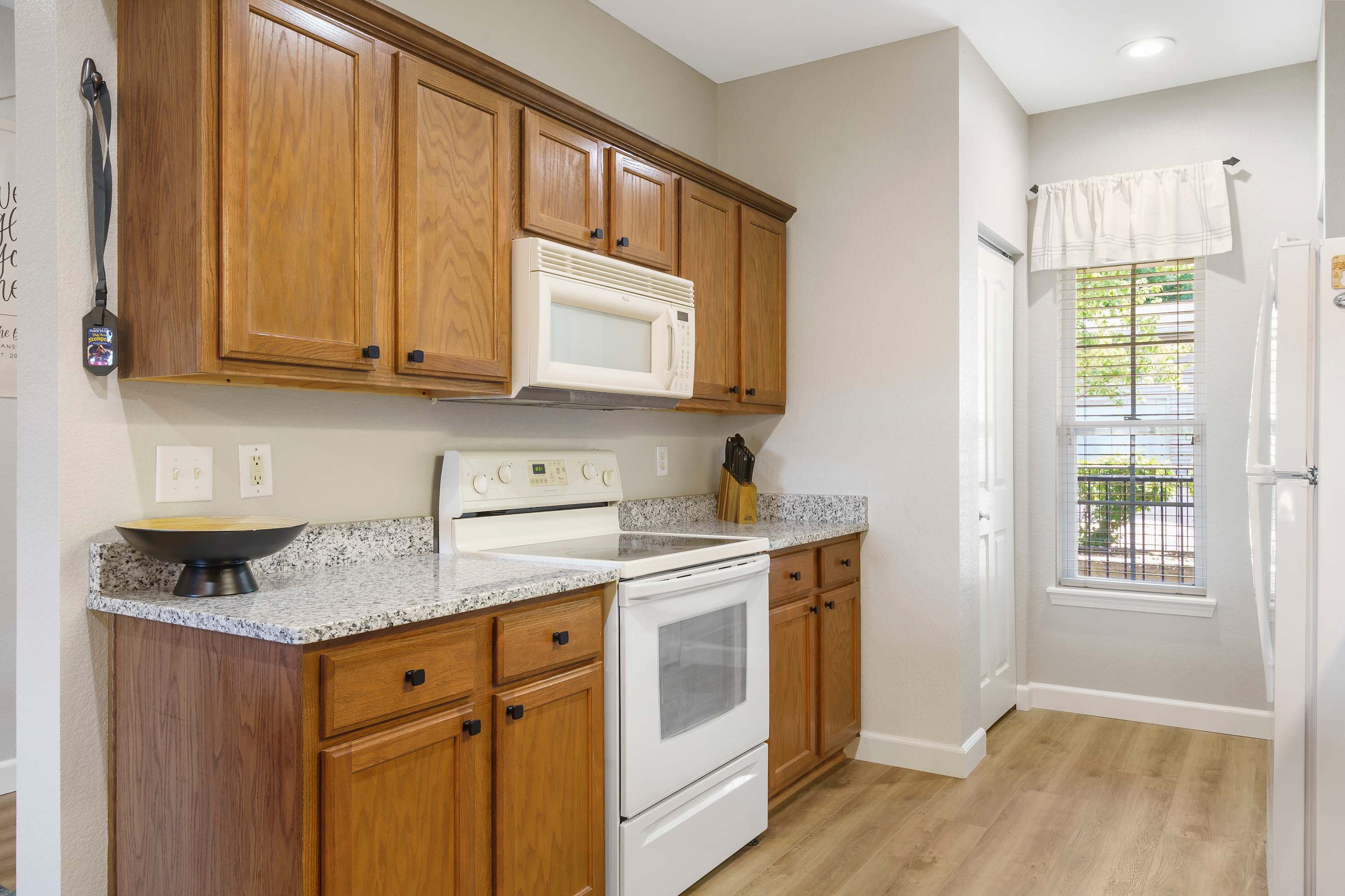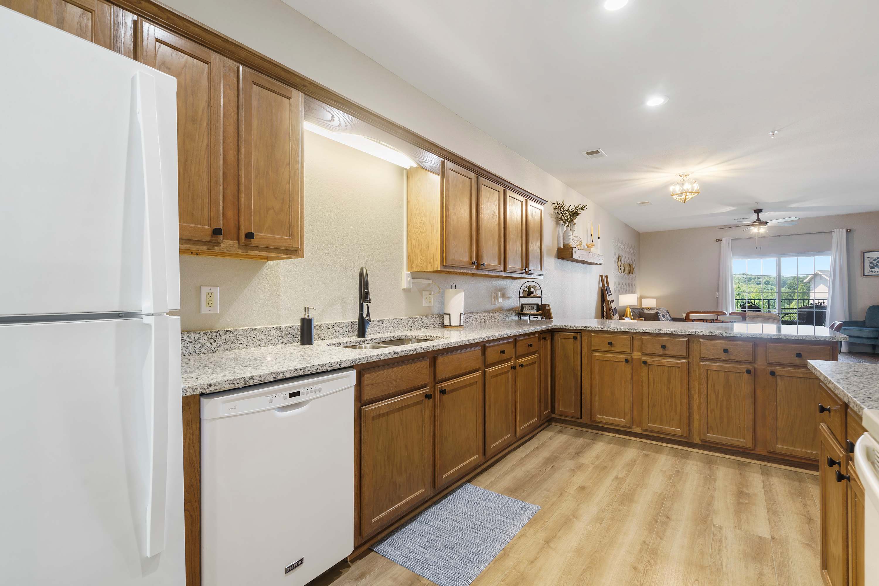 The open-plan kitchen will inspire you to fix a meal even on lazy days. Roomy and well-stocked, here walnut-colored cabinetry complement glossy granite countertops. Whip up homemade recipes using modern, stainless-steel appliances like a coffee machine, dishwasher, oven, toaster, refrigerator and wineware.