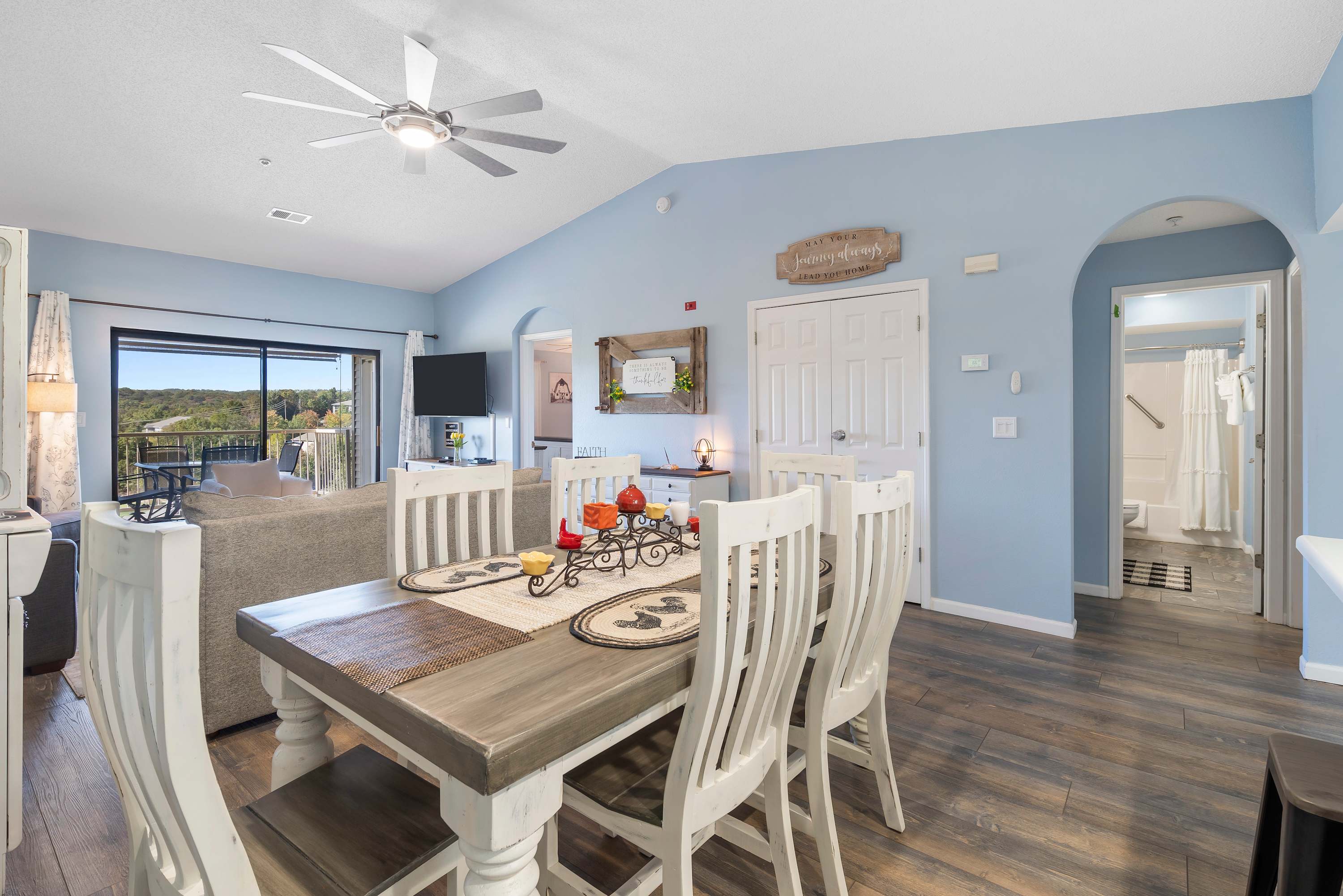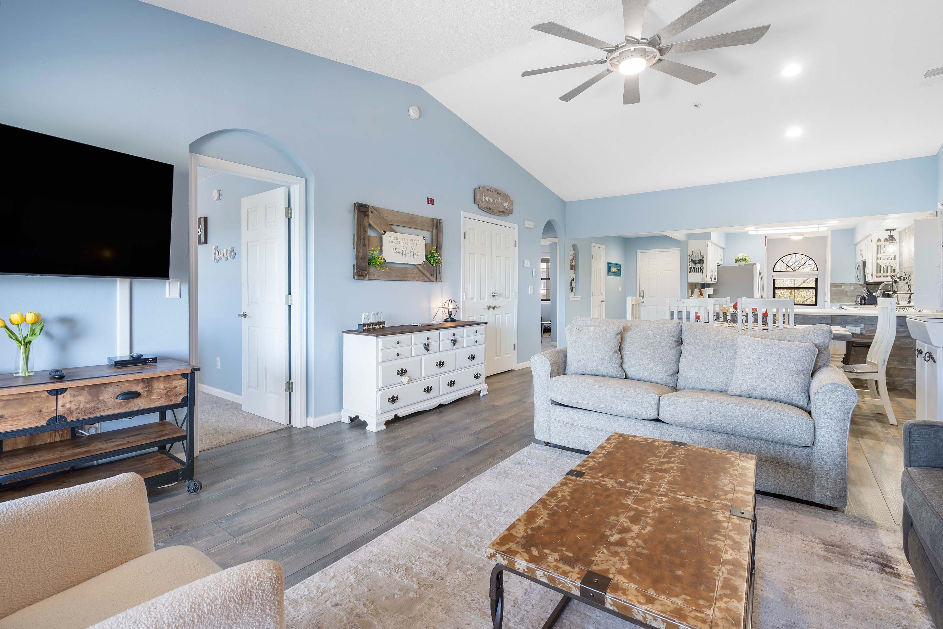 The inviting, elegant living area boasts a gratifying synergy of contemporary design and modern comfort. Lush sky-blue walls, dewy white furniture and rustic wooden fixtures keep the space refreshing throughout the day.