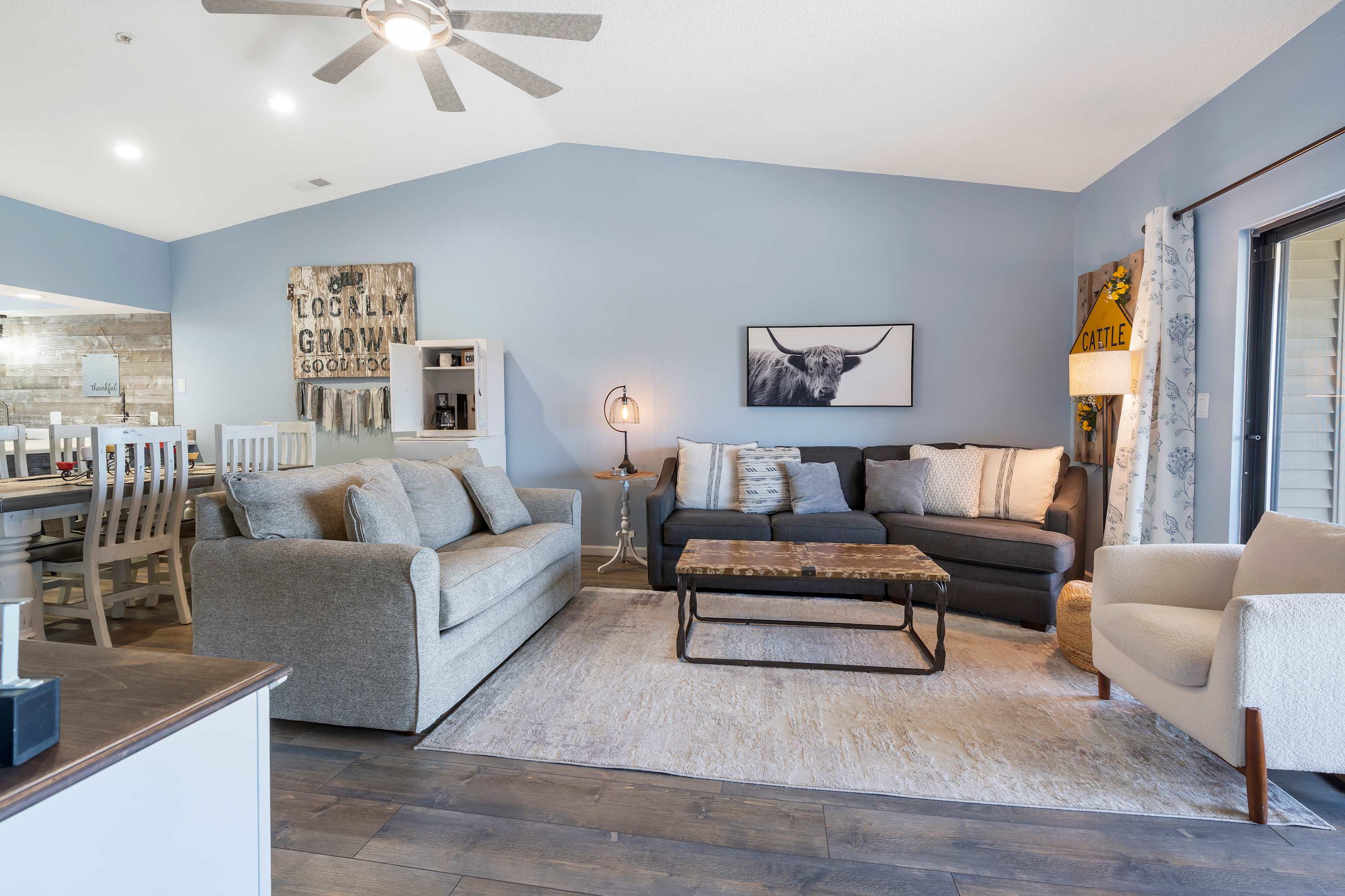 A comfy seating area flanks the smart TV. Large glass sliding allows abundant sunlight.