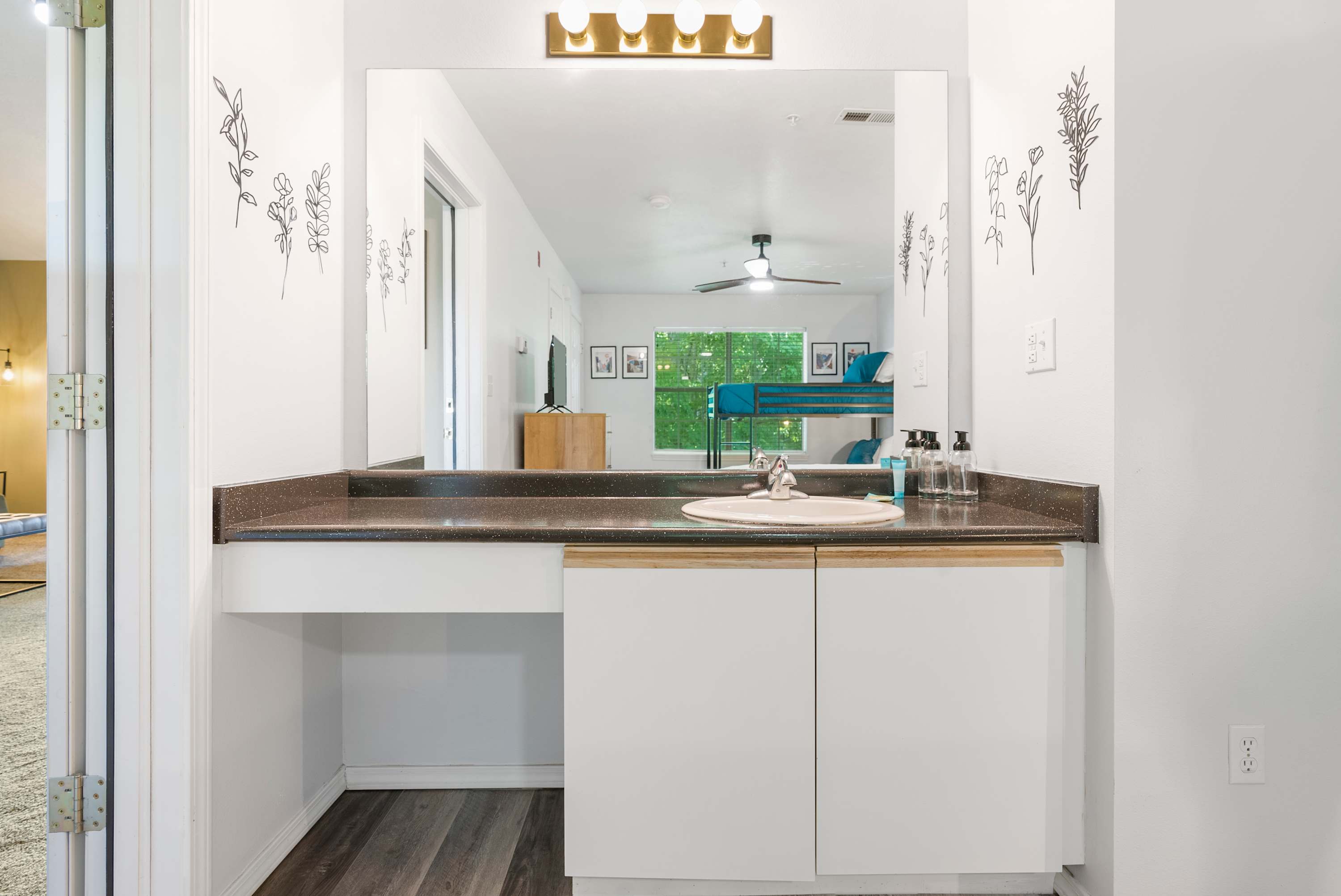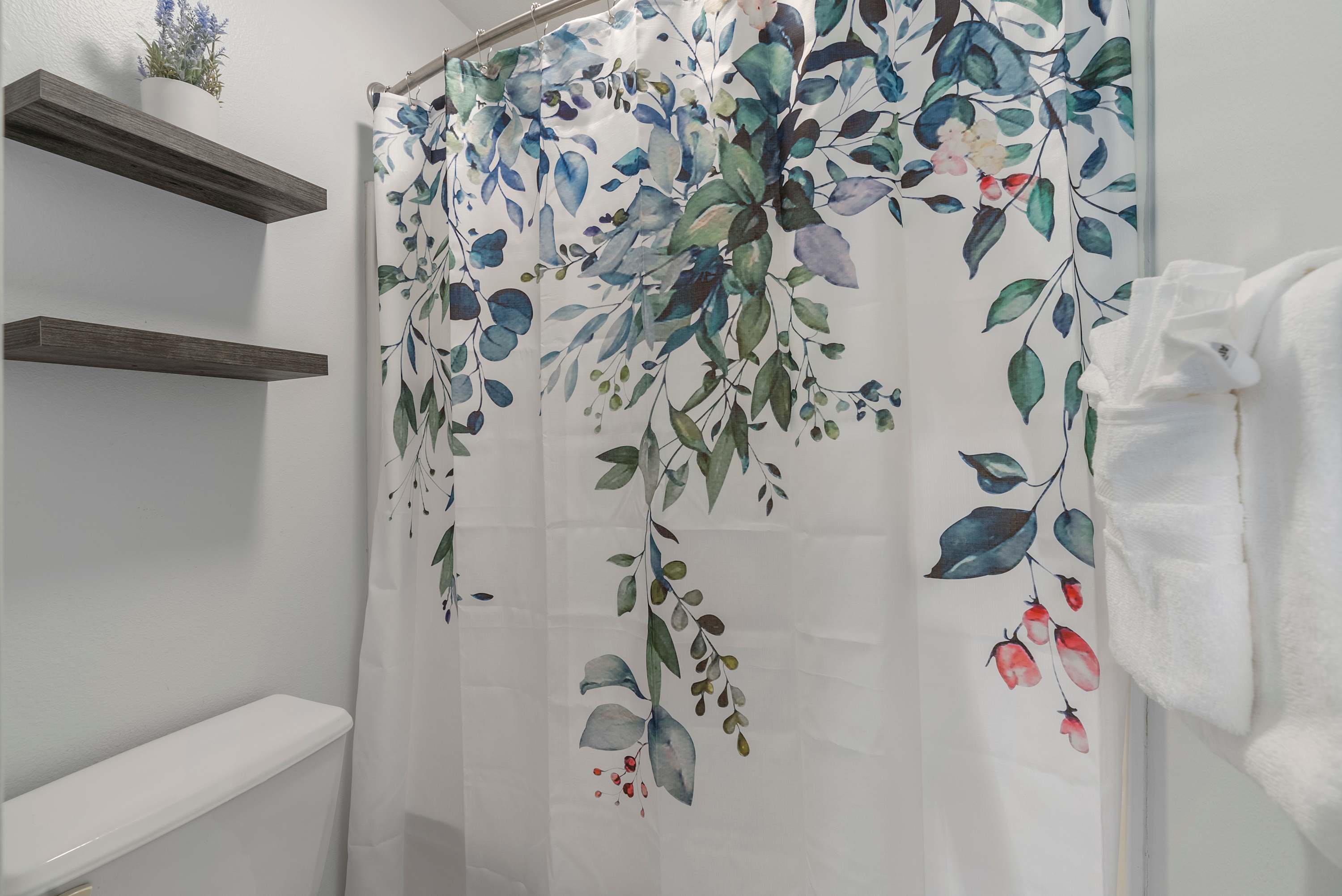 Bedroom #1 comes with a queen-size bed, a bunk bed, a smart TV and en-suite bathroom with a shower/tub combo.
