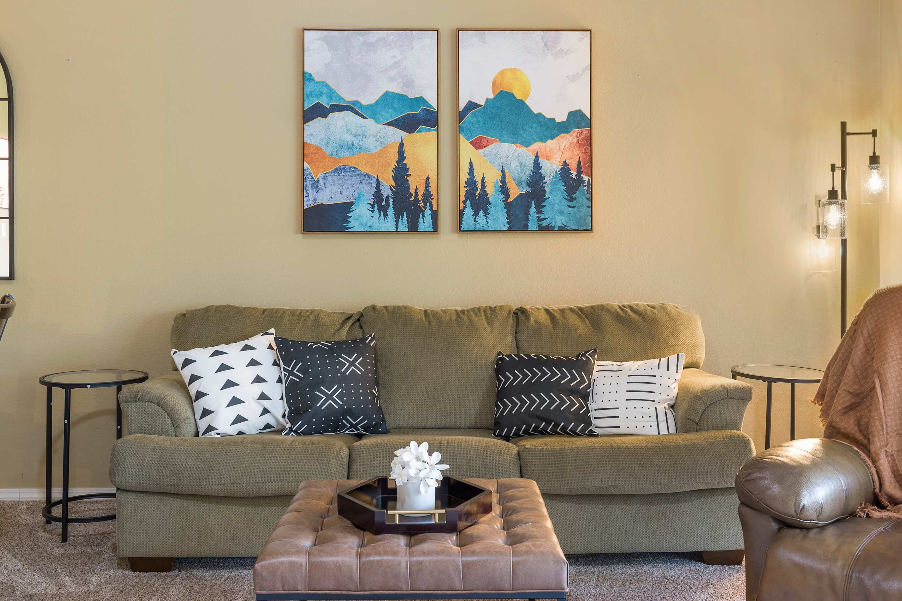 Sweeping trees and tropical foliage envelope the property as well as views of the Branson attractions in the distance. The living room is bright and luscious. A heady mix of white and lemon-yellow décor match with high ceilings, comfy furniture, and rustic wooden accents. Large sliders open onto a sun-kissed balcony with views of the teeming outdoors. Savor al-fresco meals at the 2-seater coffee table or head indoors to curl up on puffy sofas that surround a smart TV.