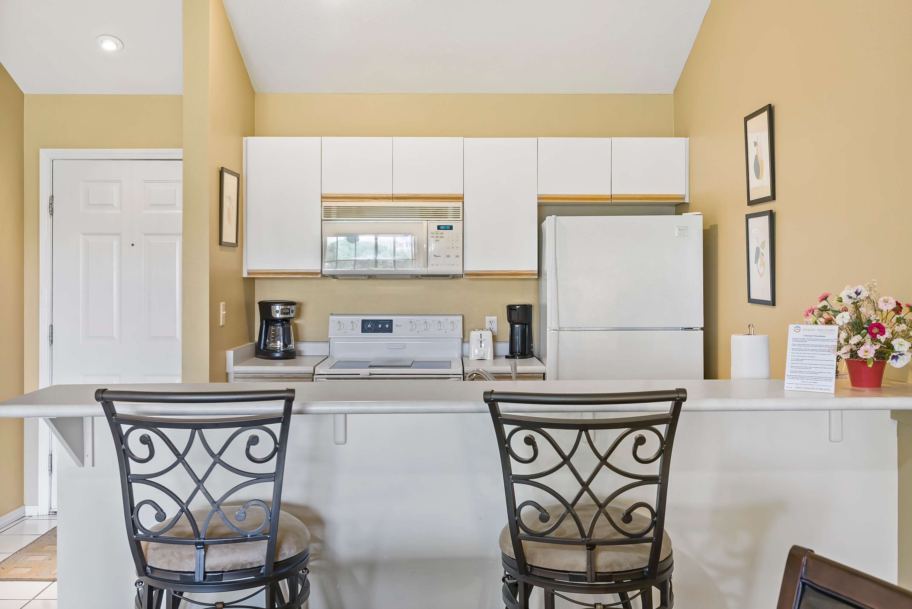The open-plan kitchen is fitted with modern cabinetry and stainless-steel appliances. A coffee maker, blender, dishwasher, oven, toaster, refrigerator and wine-ware are on stock to whip up your favorite treats. 2 adjoining high chairs make for an ideal evening of cocktails, while the 4-seater indoor dining table is great for family time.