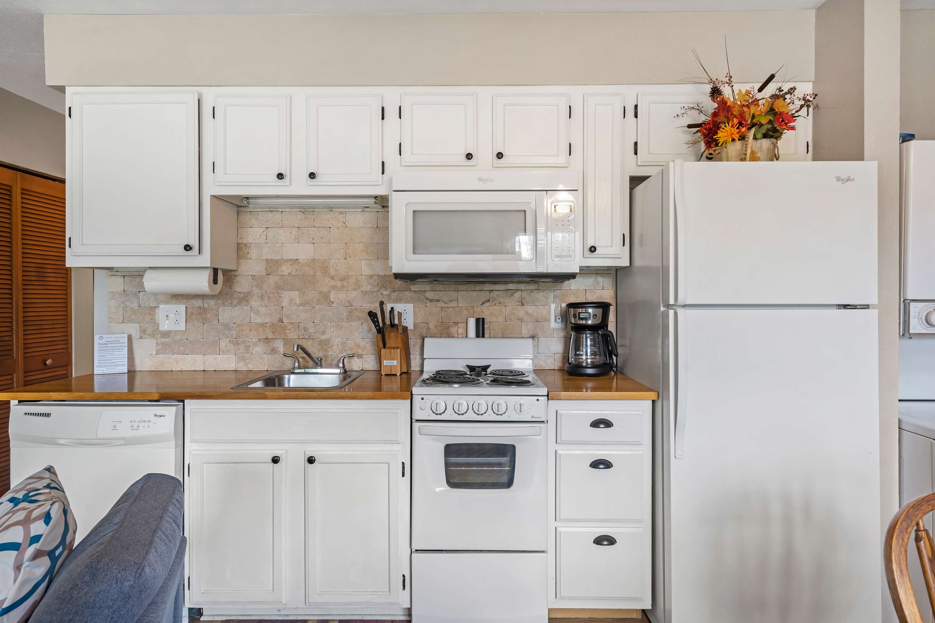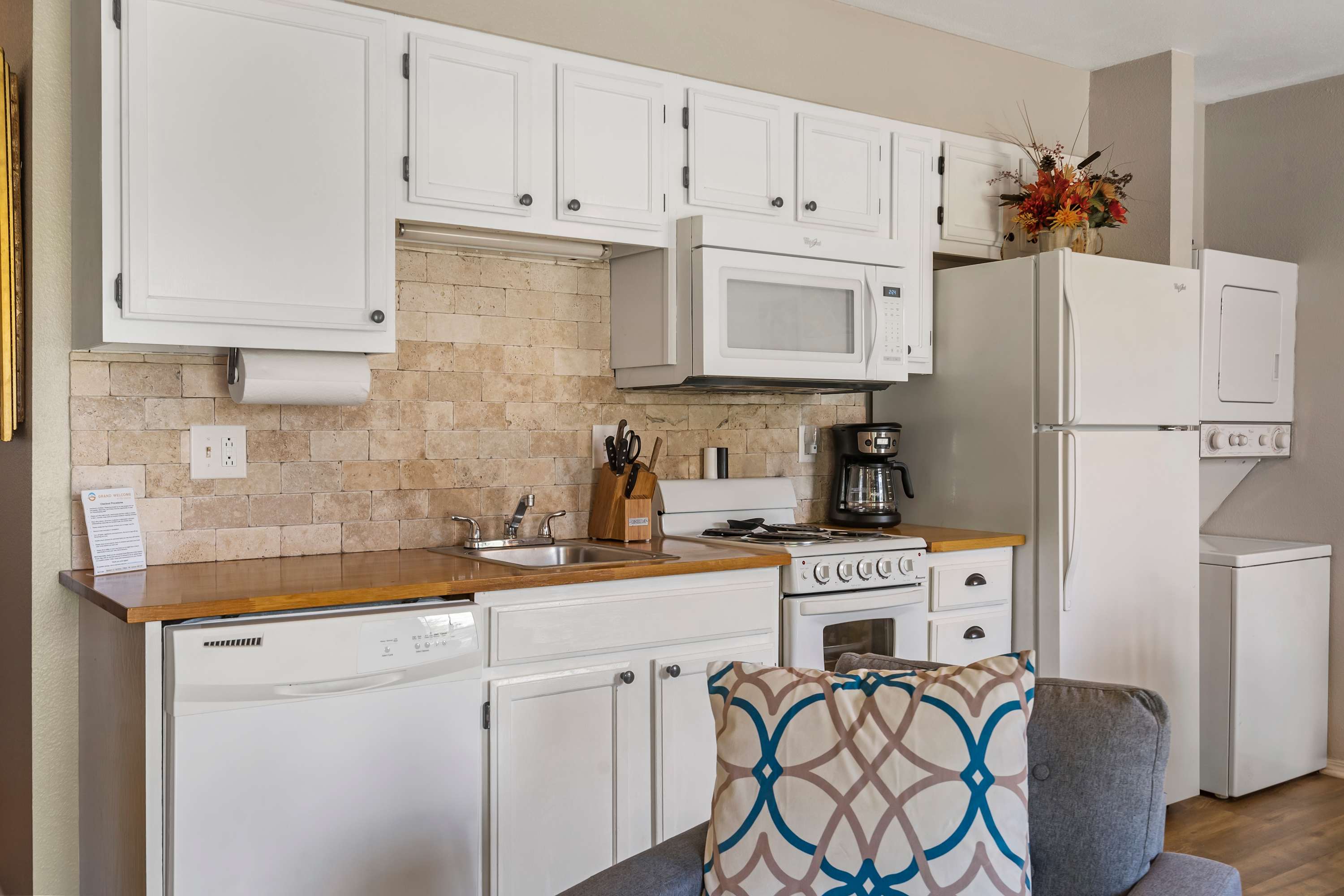 The adjoining open-plan kitchen is complete with stainless-steel appliances and modern cabinetry for you to whip up your favorite recipes. A coffee maker, toaster, blender, refrigerator, oven and cookware are available for your convenience.