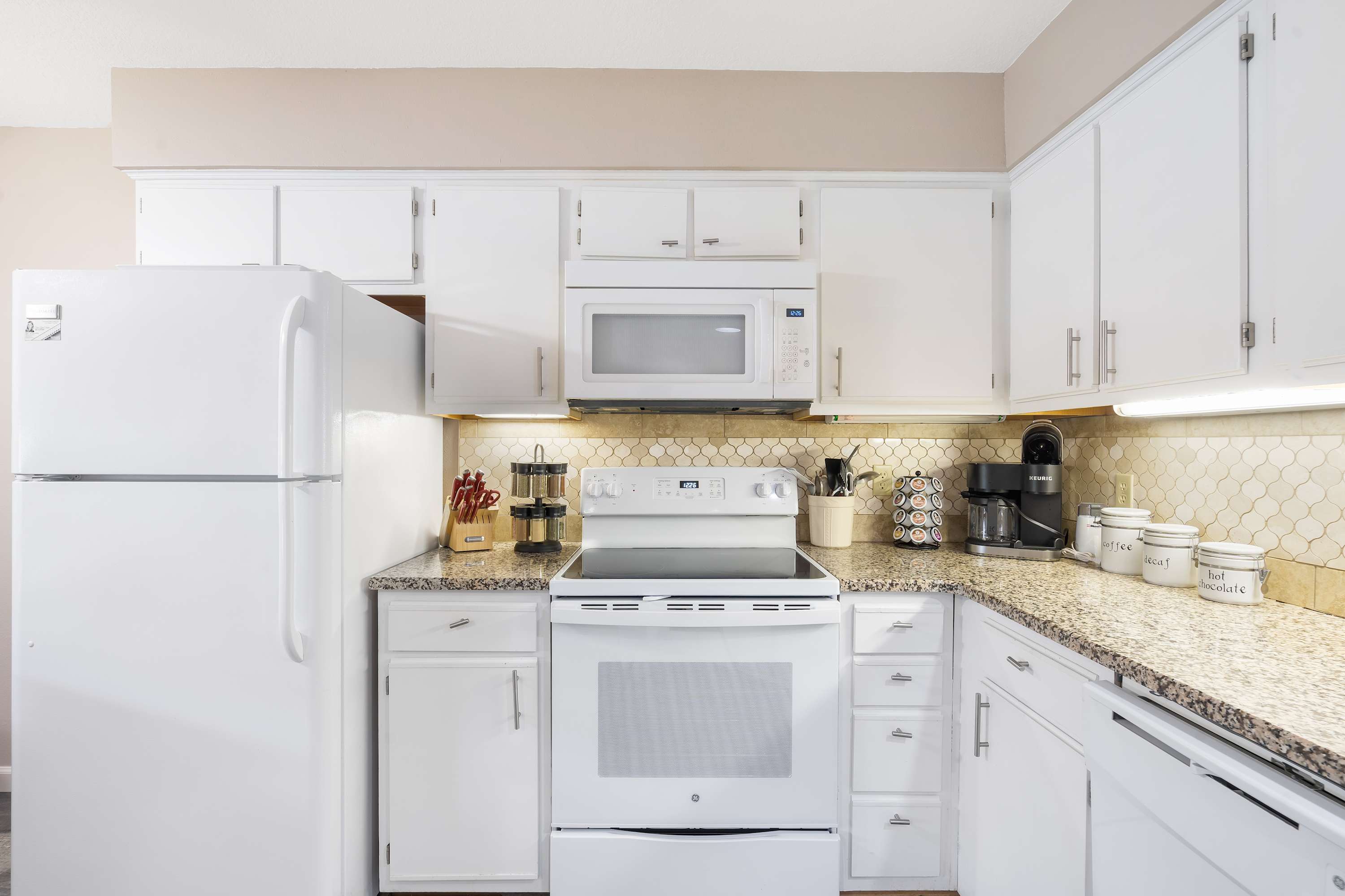 Show off your cooking skills in the kitchen. Spacious and roomy, it is fitted with glossy granite countertops and dewy white cabinetry. Stainless-steel appliances are available for guest use, including a coffee maker, blender, dishwasher, microwave, toaster, oven and refrigerator. Enjoy a casual round of drinks on the 2 bar stools available or tuck in for intimate family gatherings at the 2 6-seater indoor dining tables.