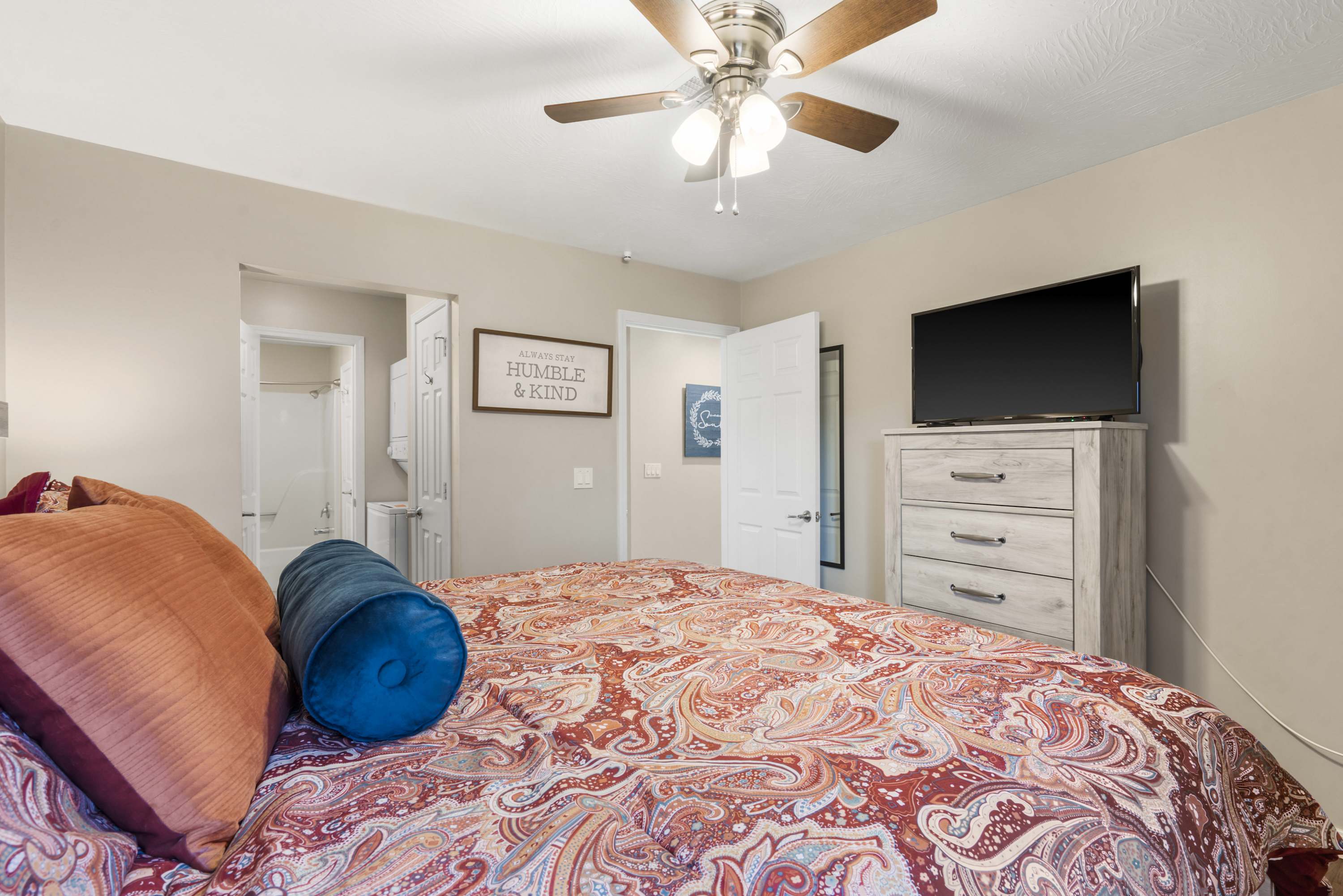 The bedroom has a king-bed, TV, and access to the bathroom, with laundry room in between.