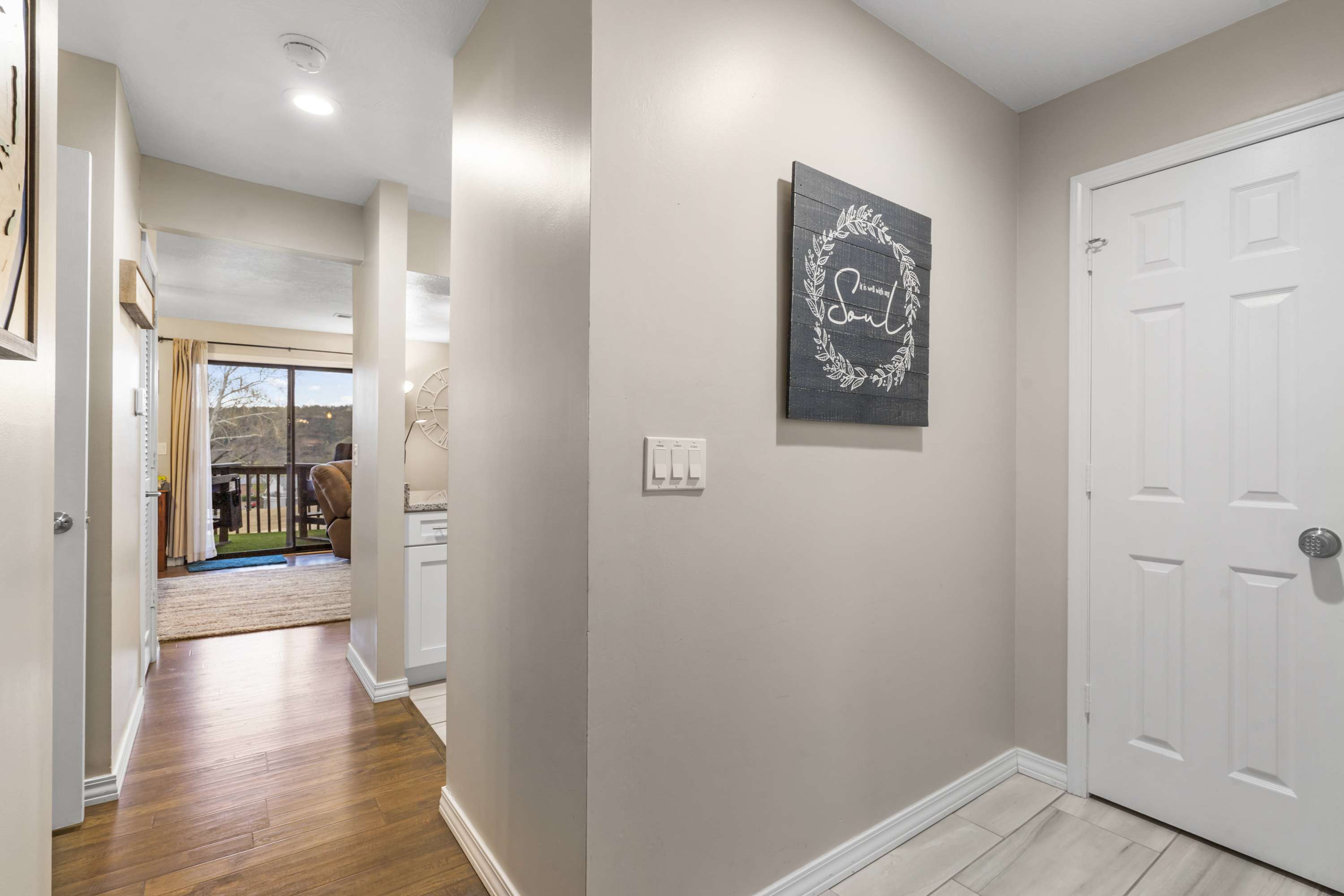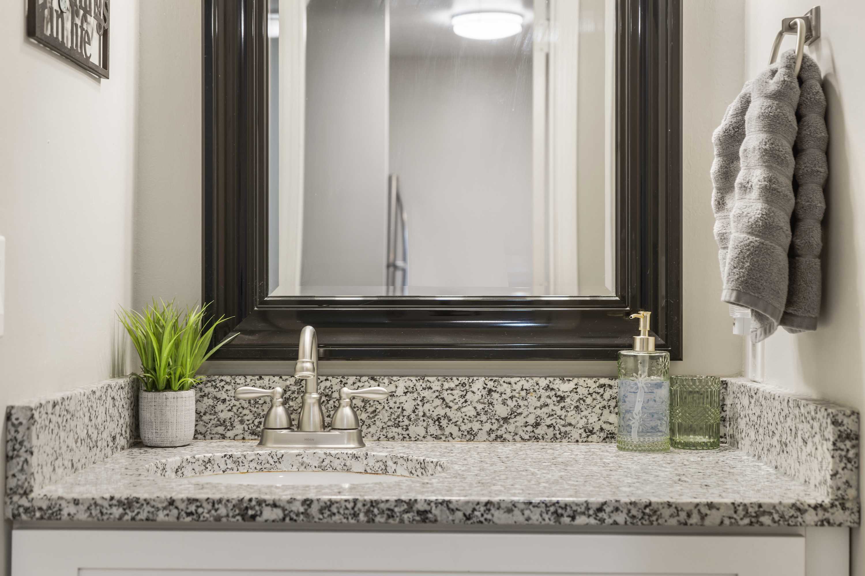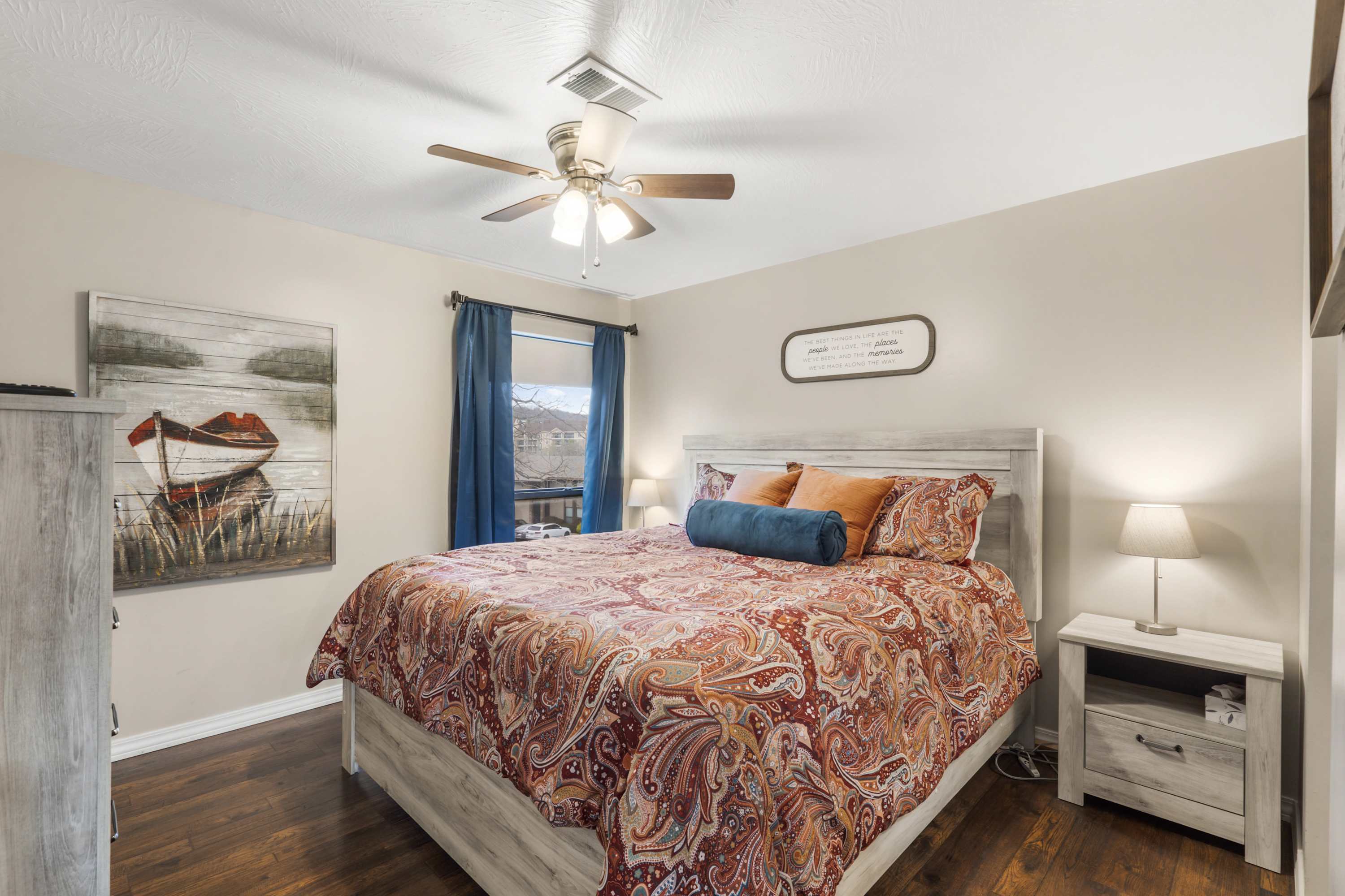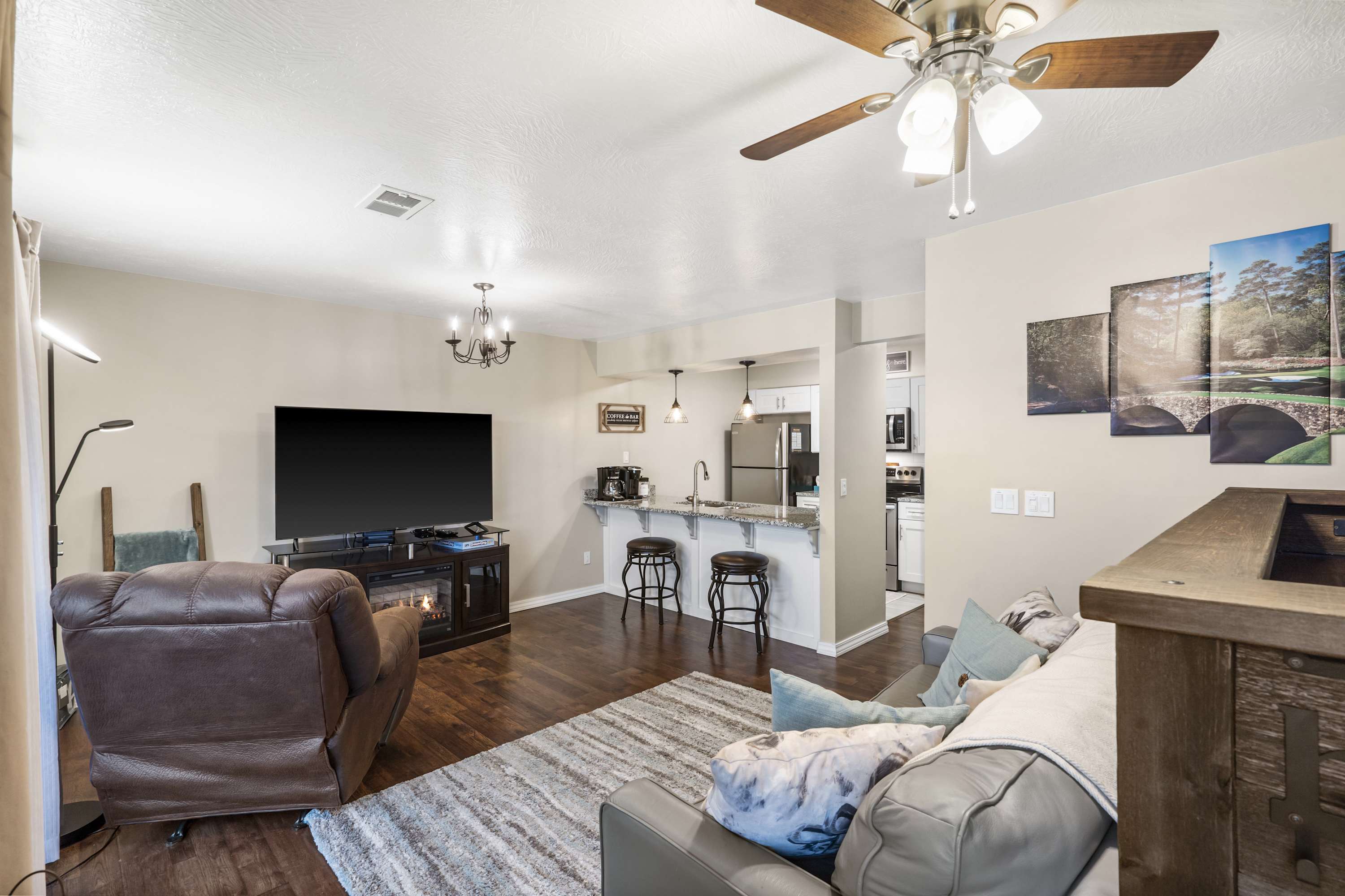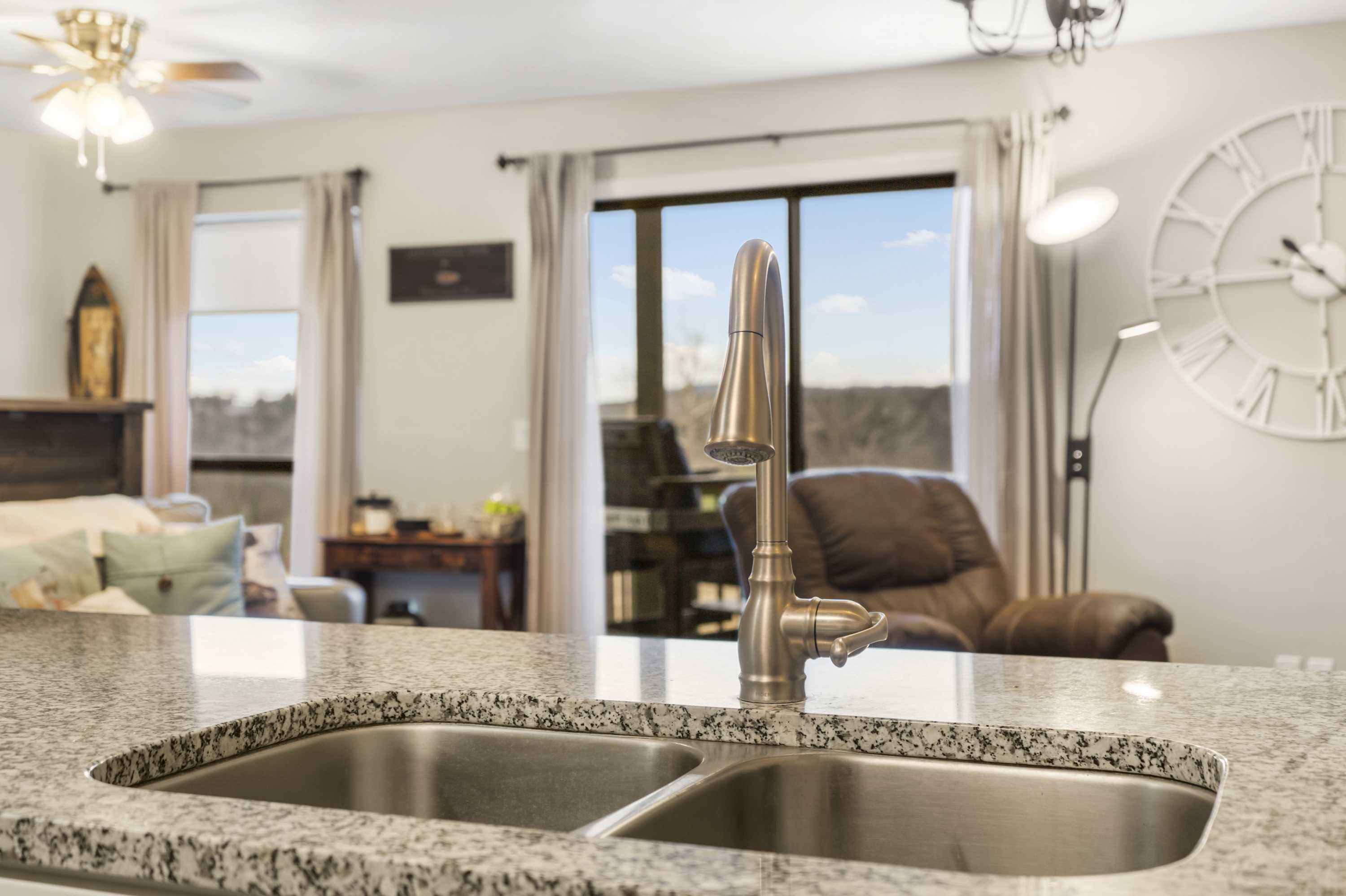 The home has been tastefully decorated with decor and accents that complement the space. The open-concept layout allows everyone to join in on the conversation and is ideal for entertaining. The living space features a TV, a queen-size sofa sleeper, and access to the outside balcony. Enjoy peaceful mornings on the covered patio with your morning brew in hand.