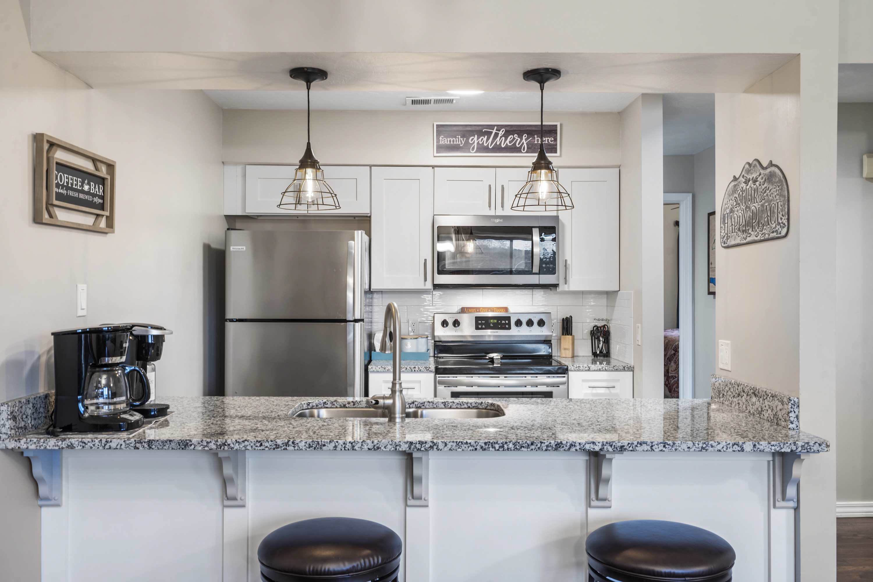 Back inside, the kitchen is equipped with everything you need to cook up some signature dishes from home. A toaster and a coffee maker are just a couple of the extra items available for your convenience. There is a small table for 2 and additional counter seating.