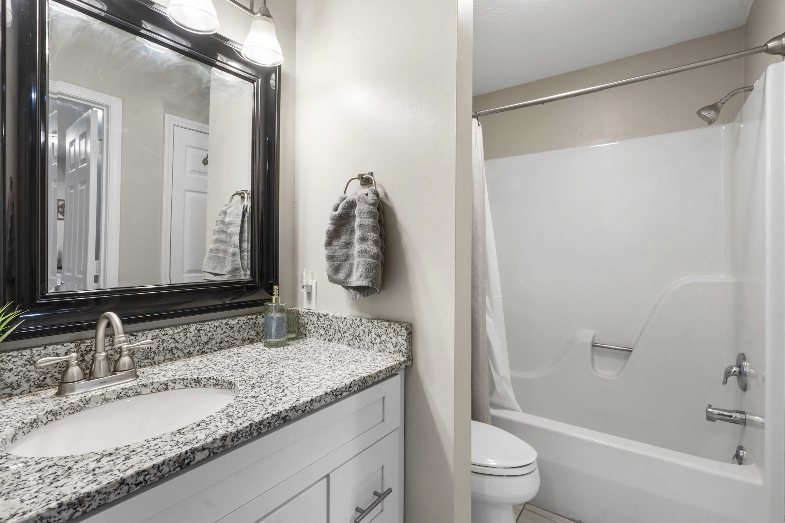 The bathroom has a shower/tub combo.