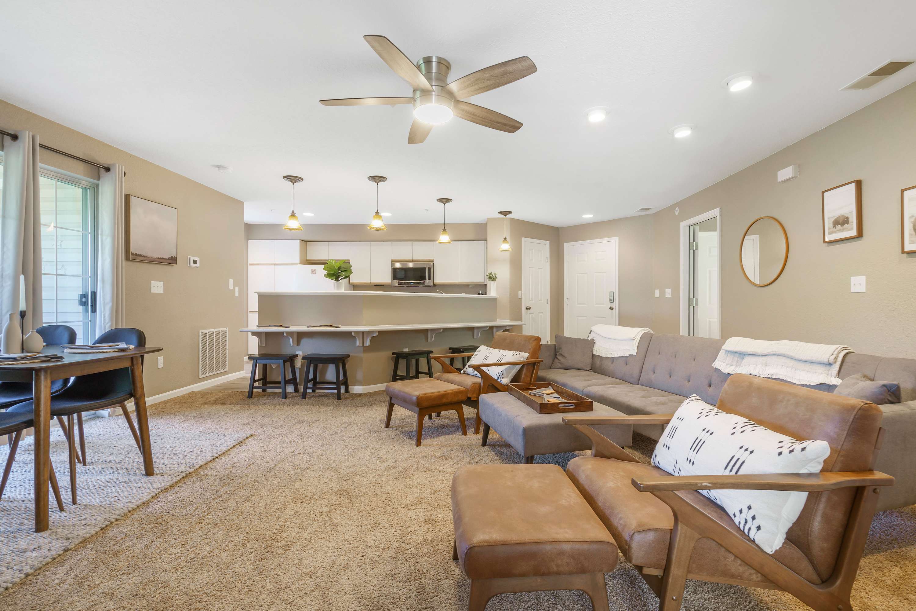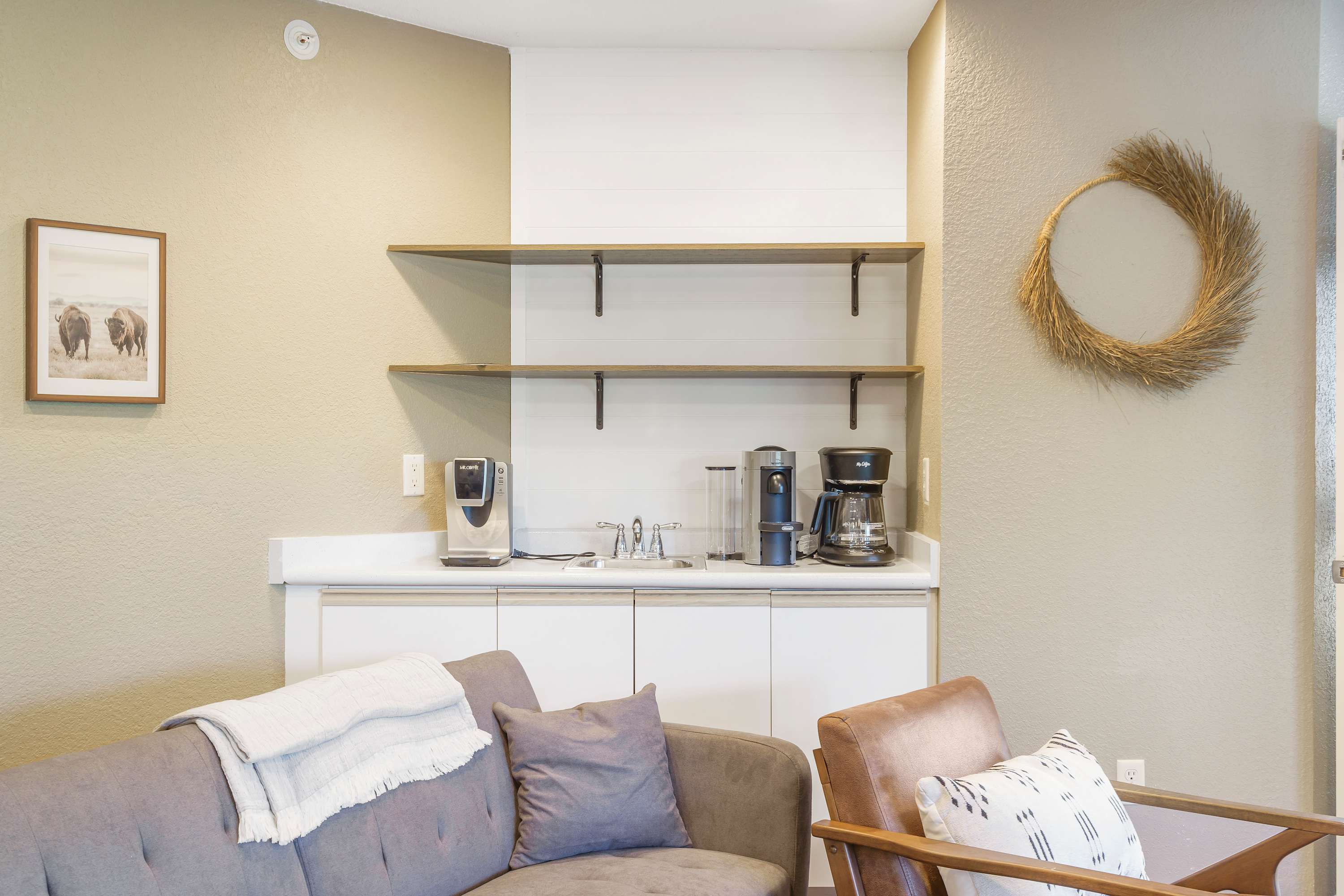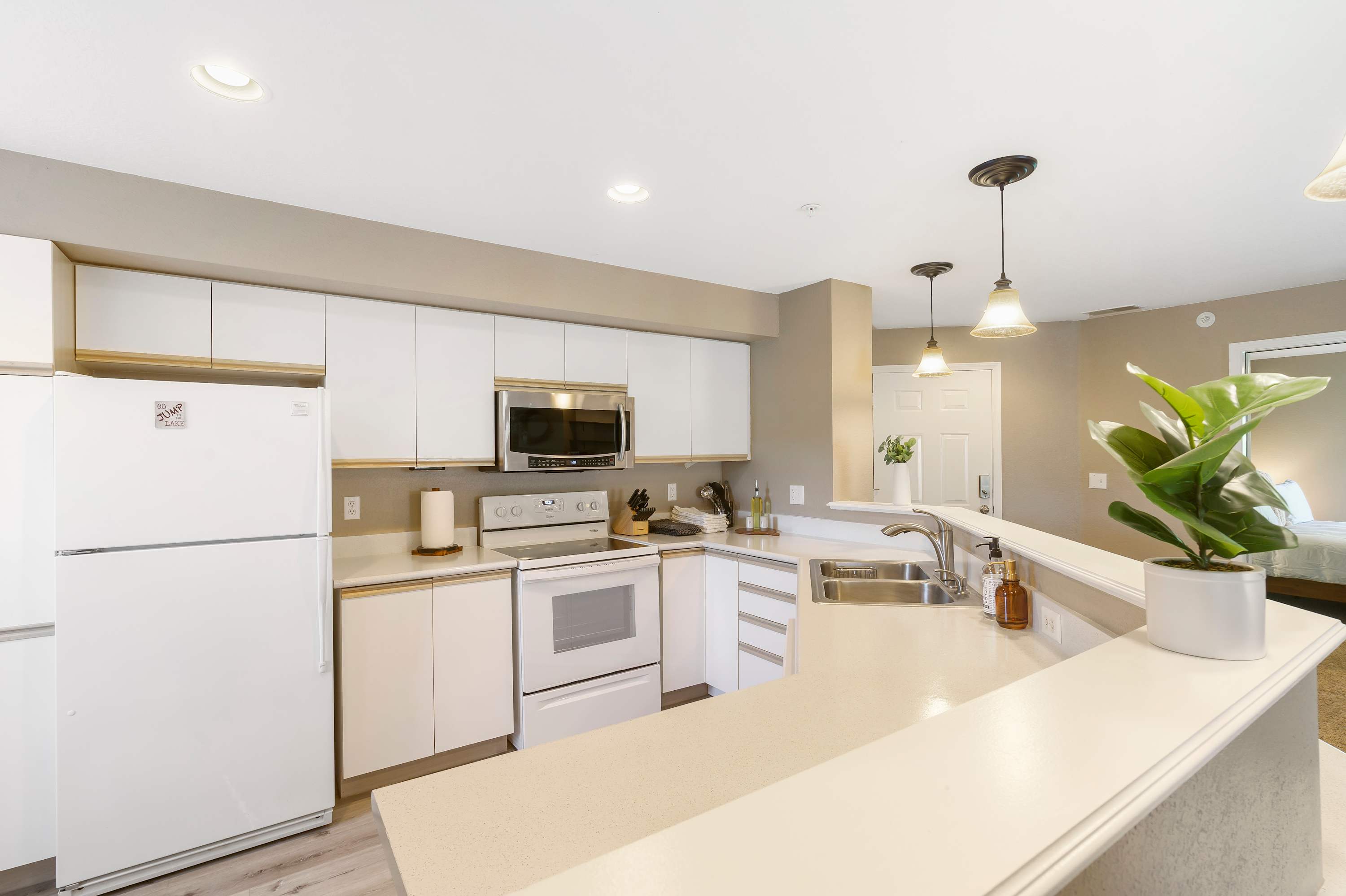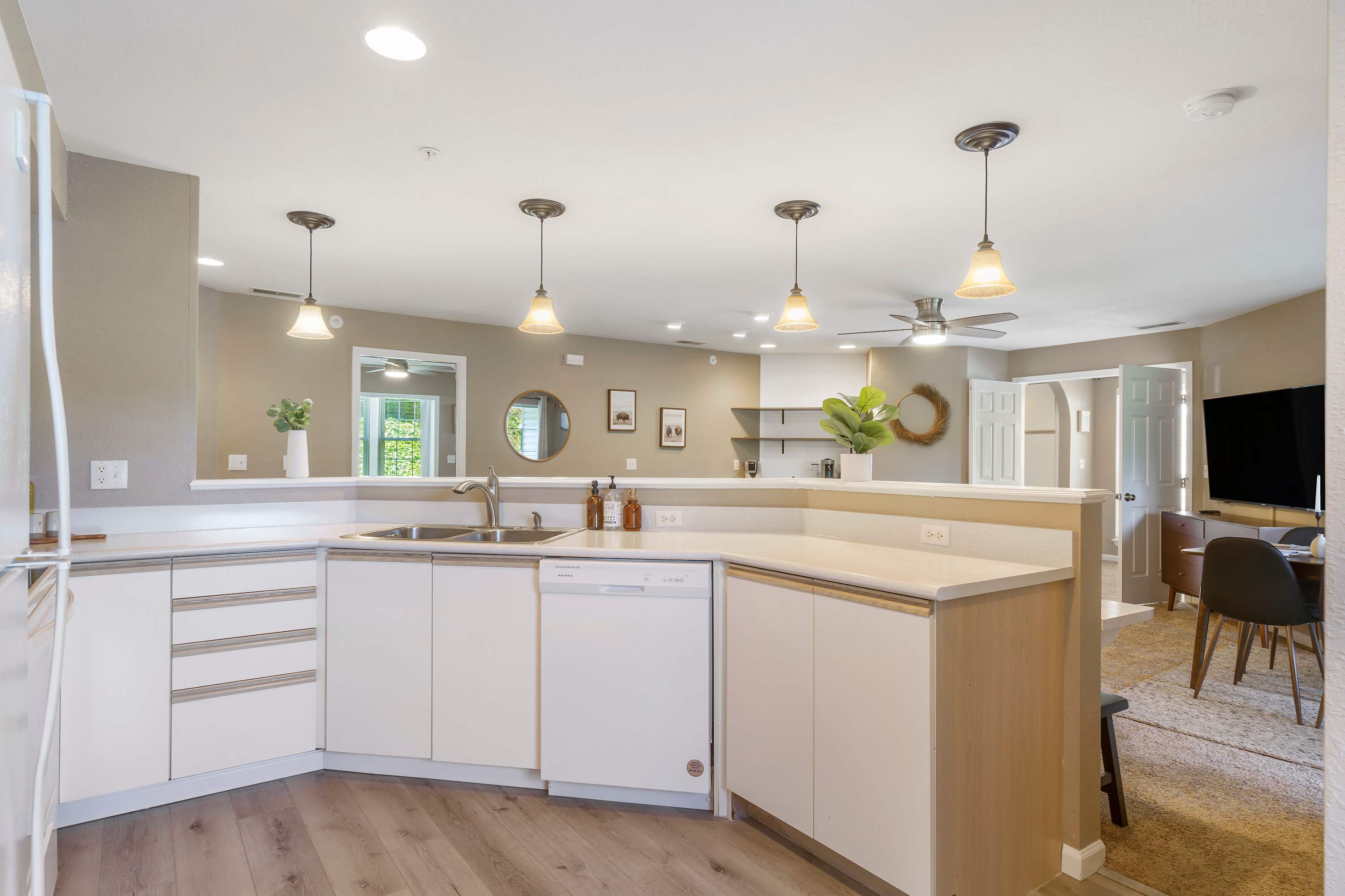Back inside, the home is decorated with modern, and neutral decor. The living room has a comfy oversized sofa that doubles as a sleeper, a smart TV and a spacious private deck with gorgeous lake views.