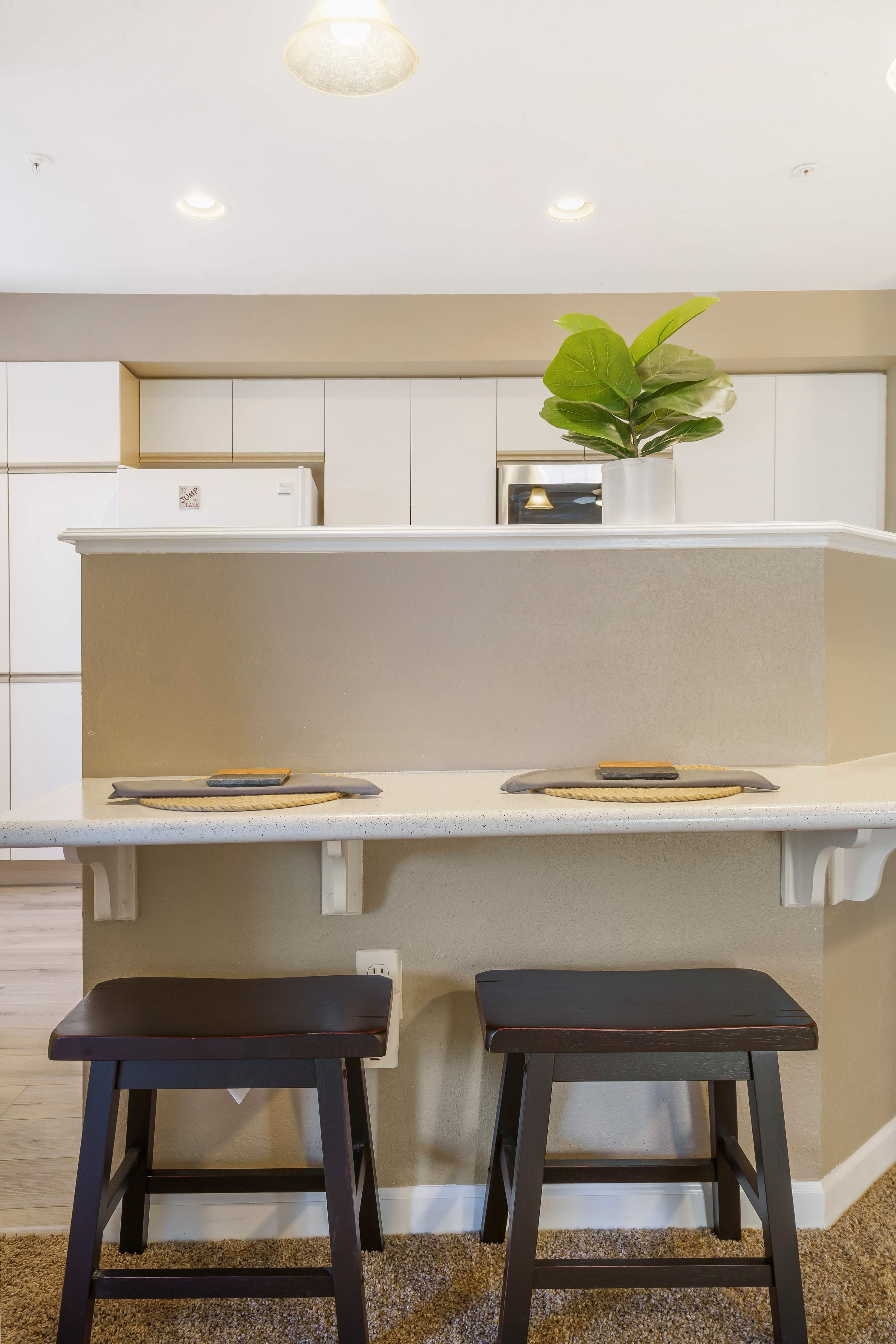 The adjoining open-plan kitchen is bright and roomy, stocked with cabinetry and appliances. These include a coffee maker, blender, dishwasher, microwave, toaster, oven, refrigerator and wineware. The counter provides an extra seating for 4, while the 4-seater dining table is perfect for hearty family meals.