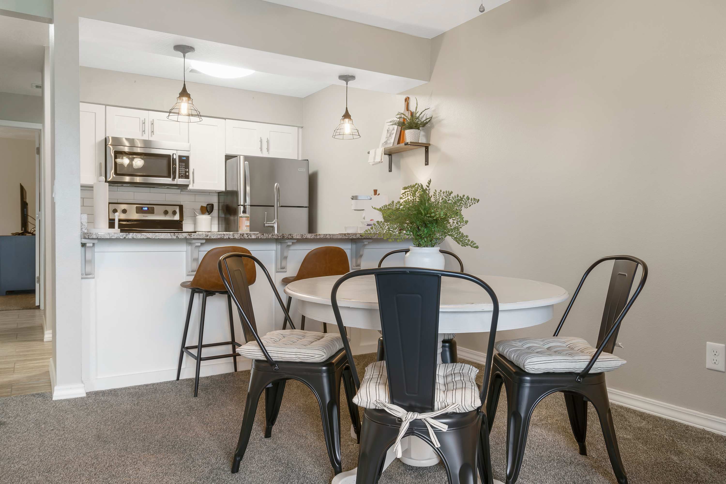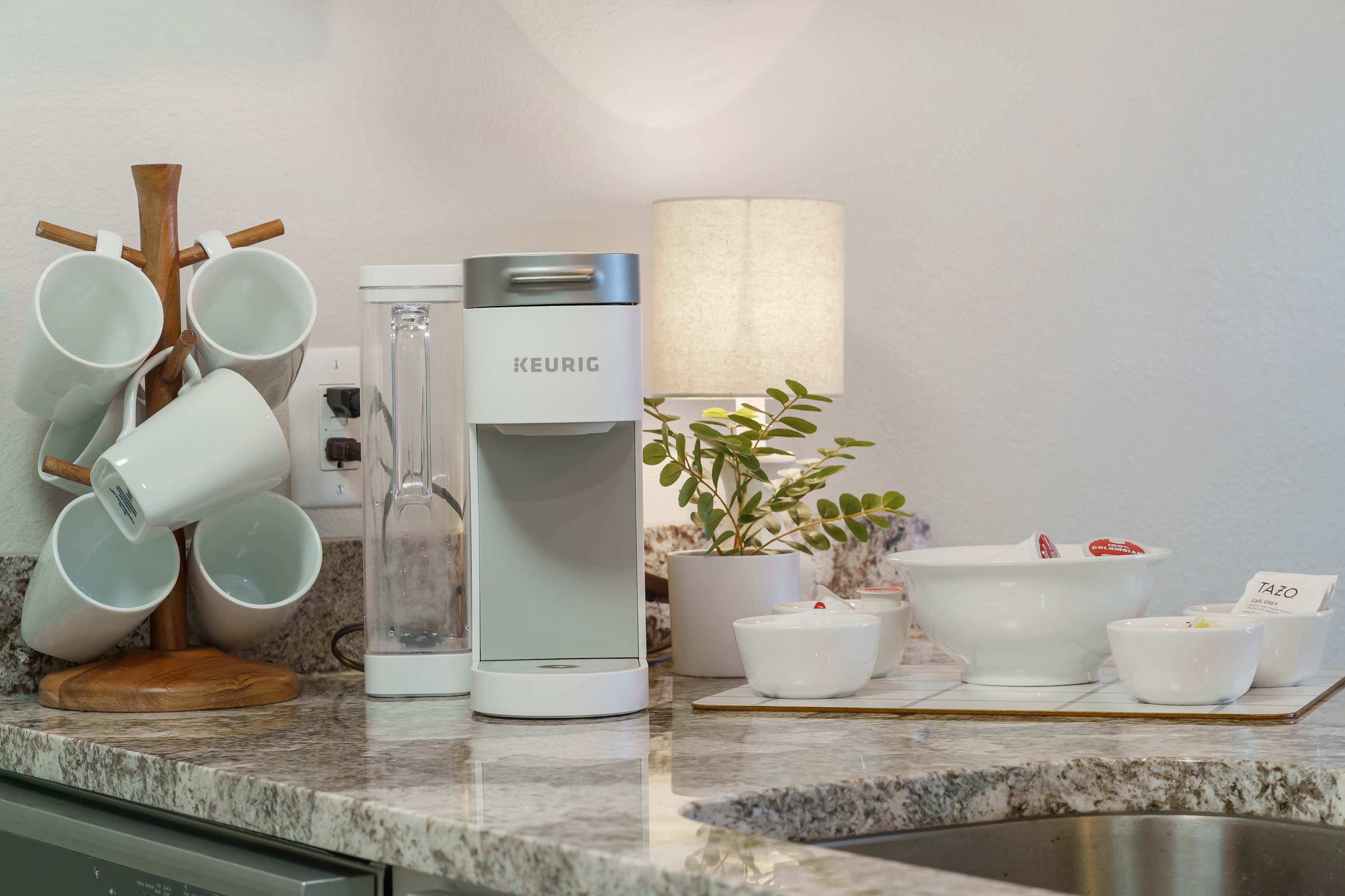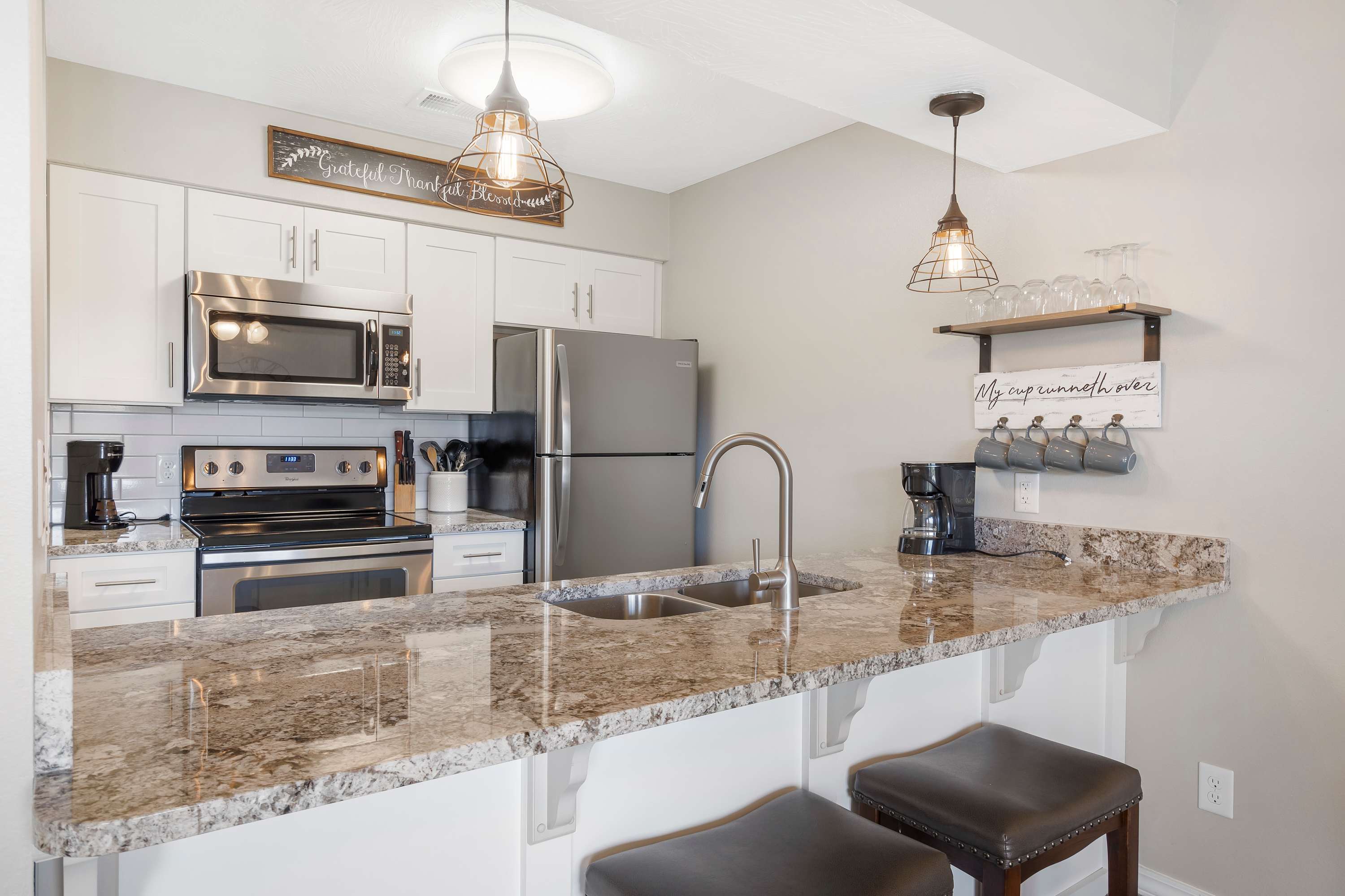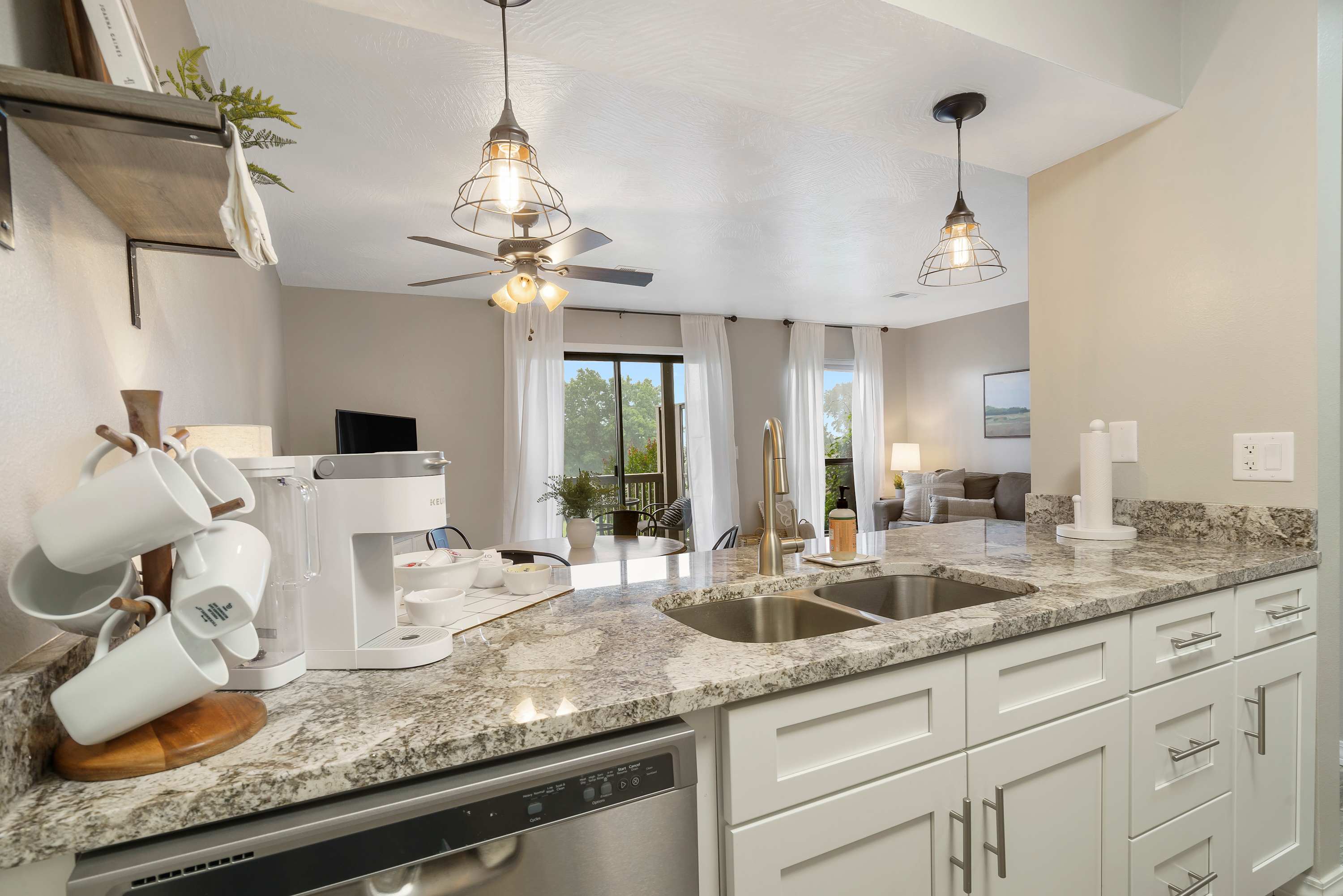 Back inside, the kitchen is equipped with everything you need to cook up some signature dishes from home. A toaster, blender, and coffee maker are just a few of the extra items available for your convenience. There is a small table for 2 and additional counter seating.