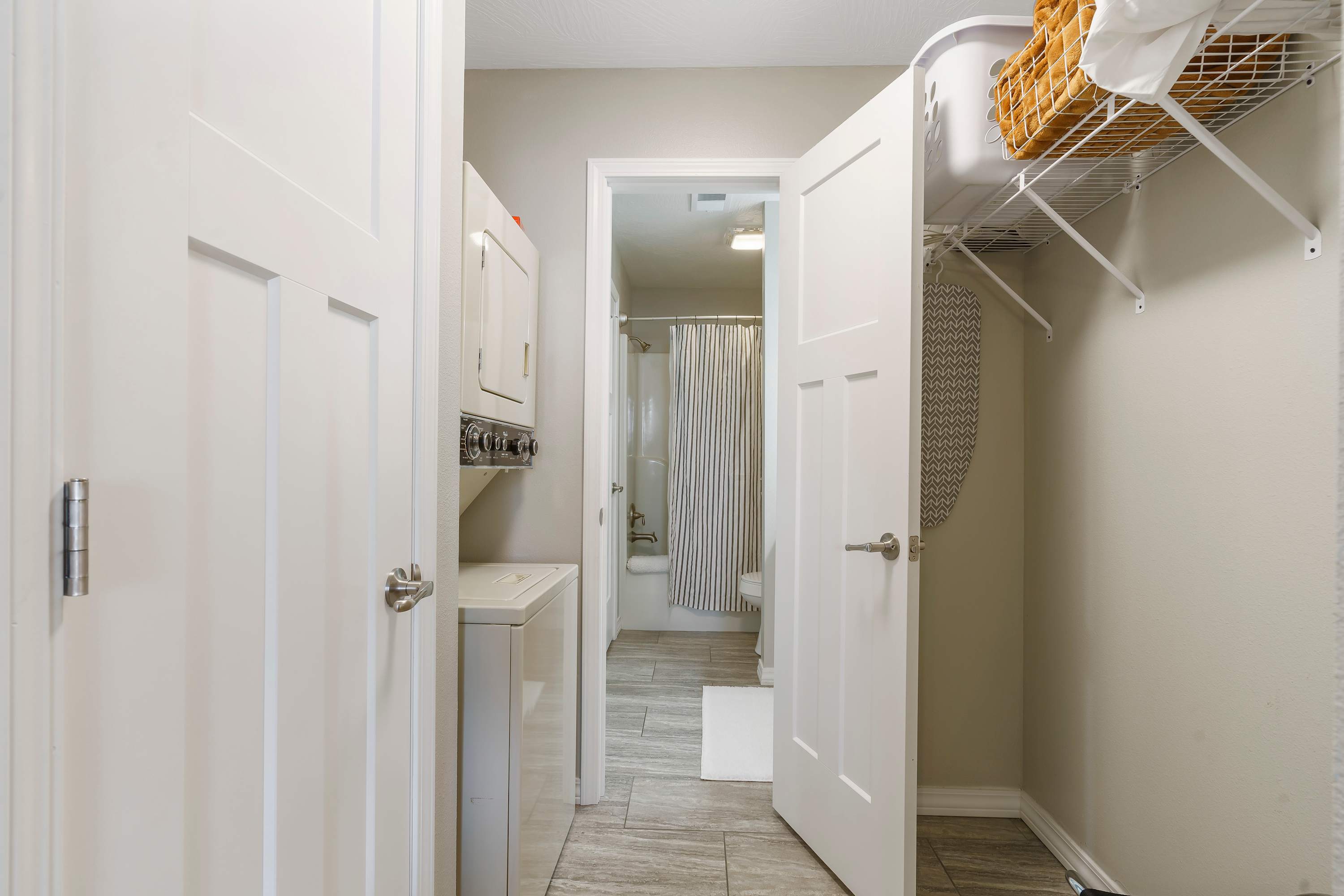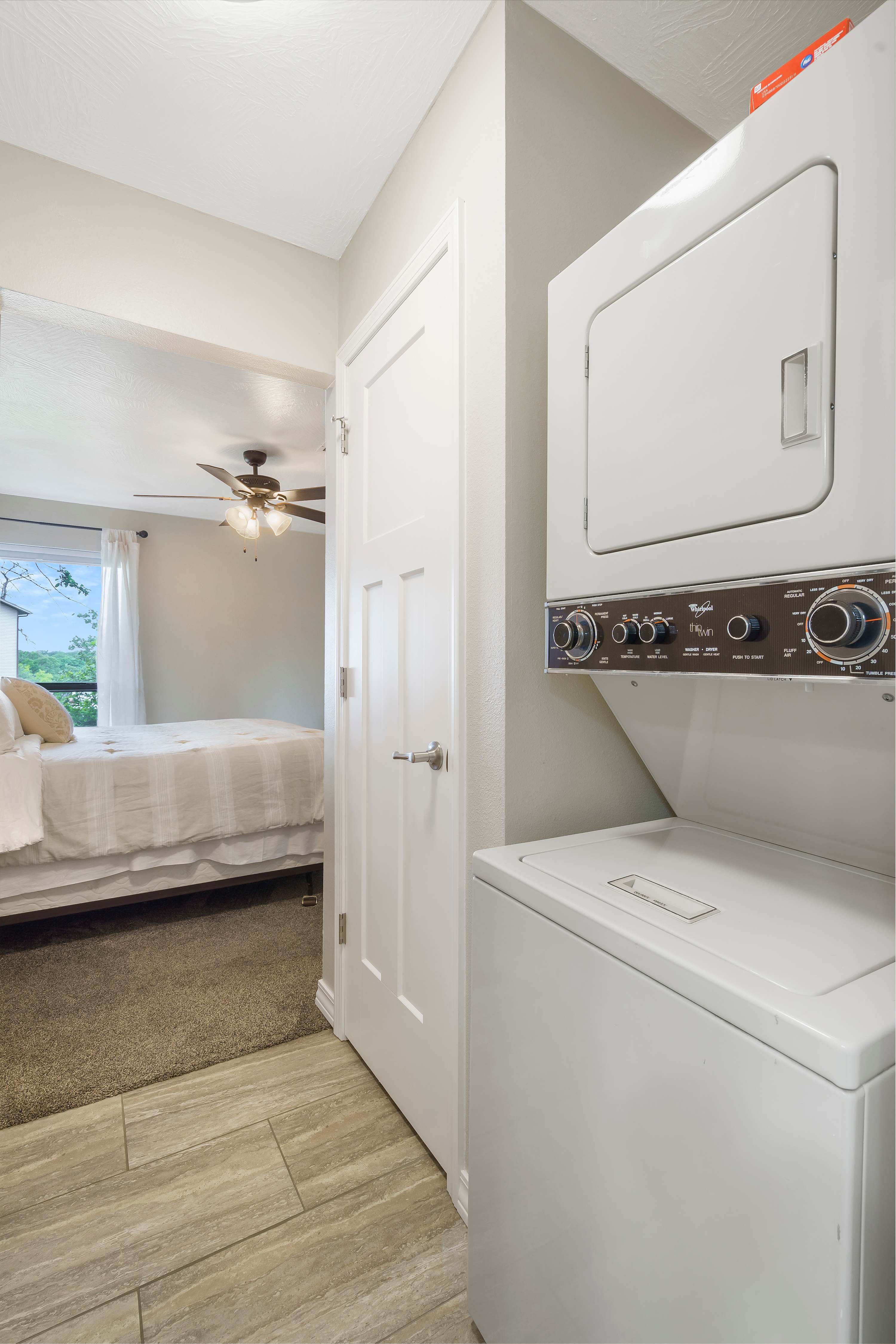 The bedroom has a king-size bed, TV, and access to the bathroom, with laundry room in between.