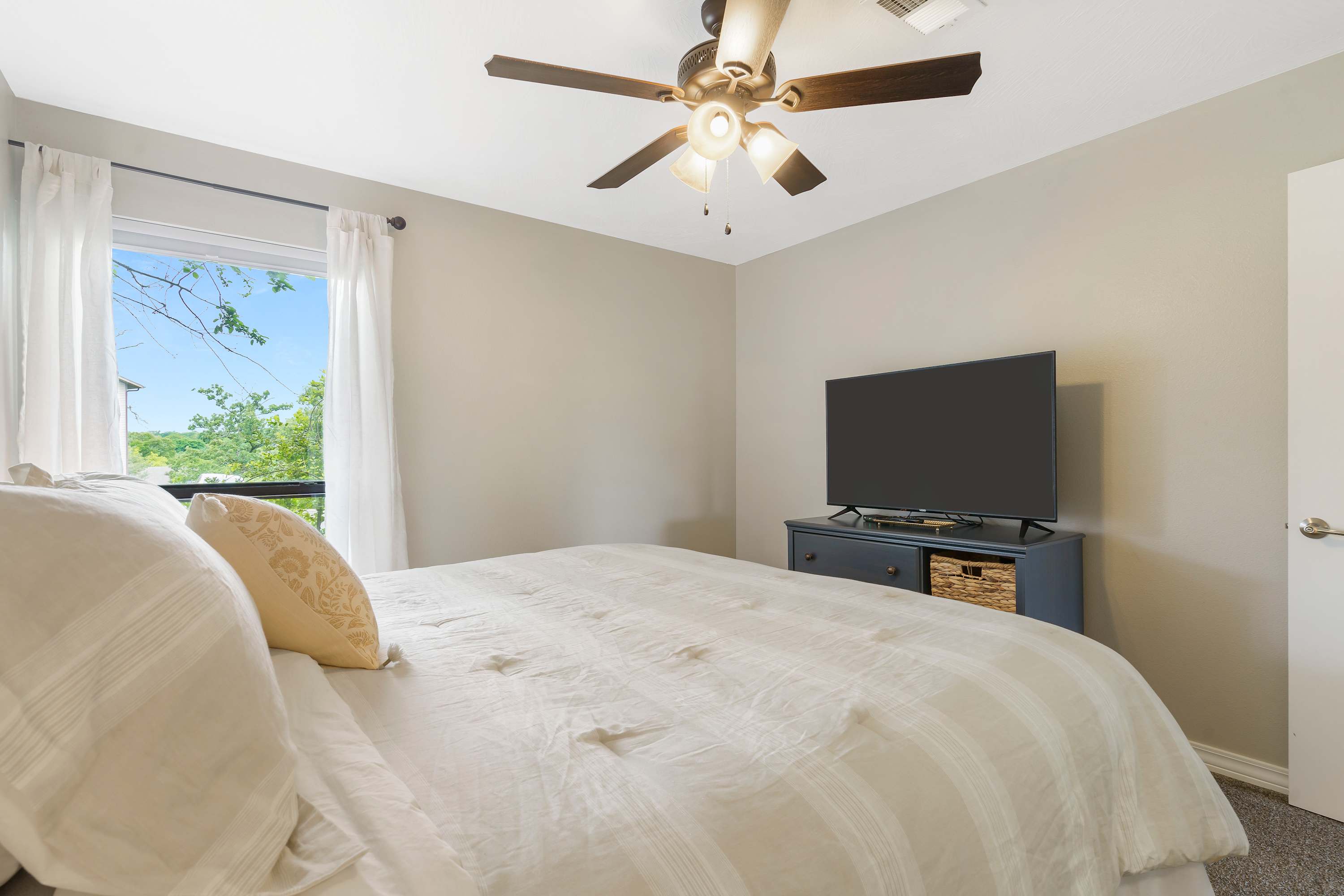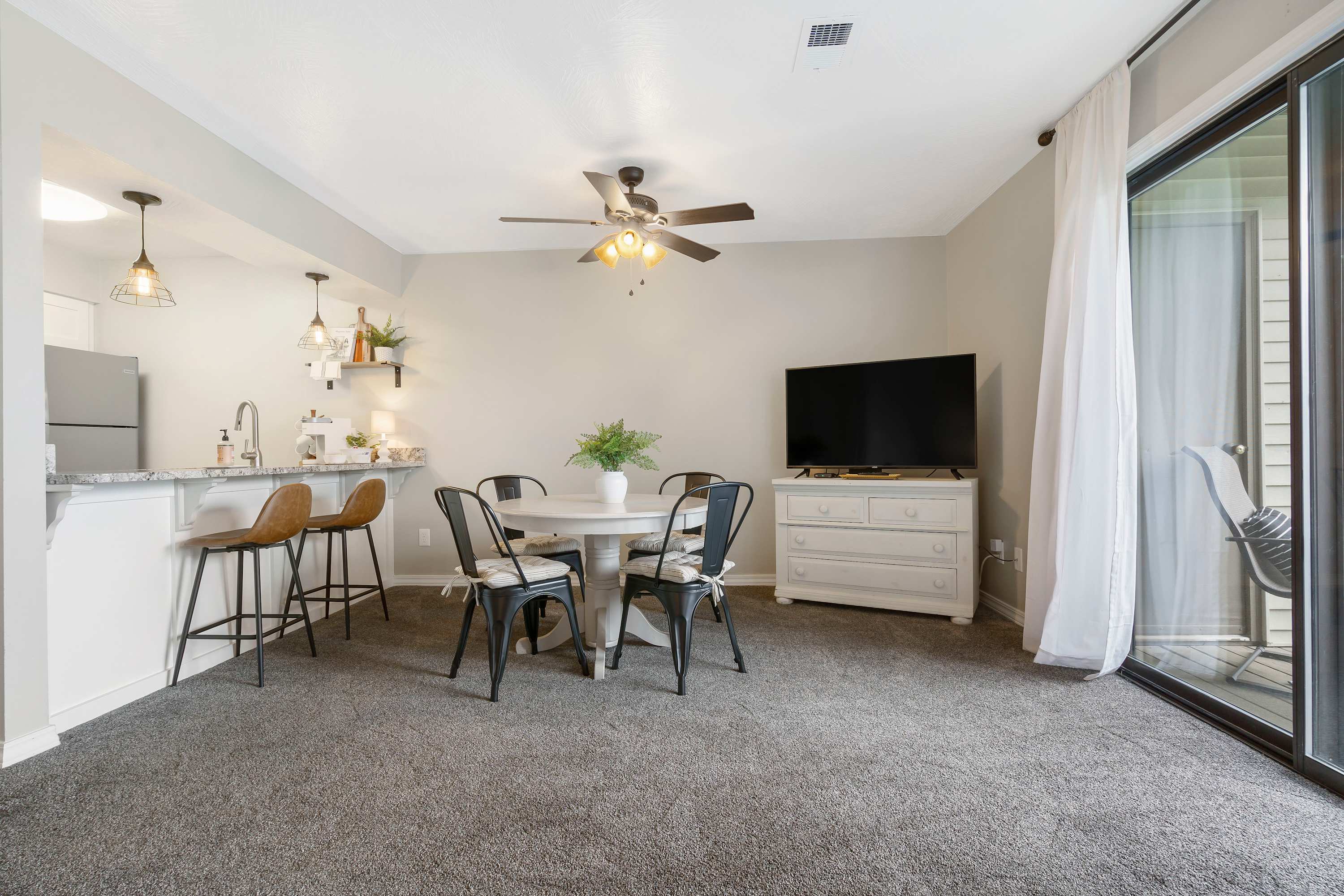 The home has been tastefully decorated with decor and accents that complement the space. The open-concept layout allows everyone to join in on the conversation and is ideal for entertaining. The living space features a TV, a queen-size sofa sleeper, and access to the outside balcony. Enjoy peaceful mornings on the covered patio with your morning brew in hand.