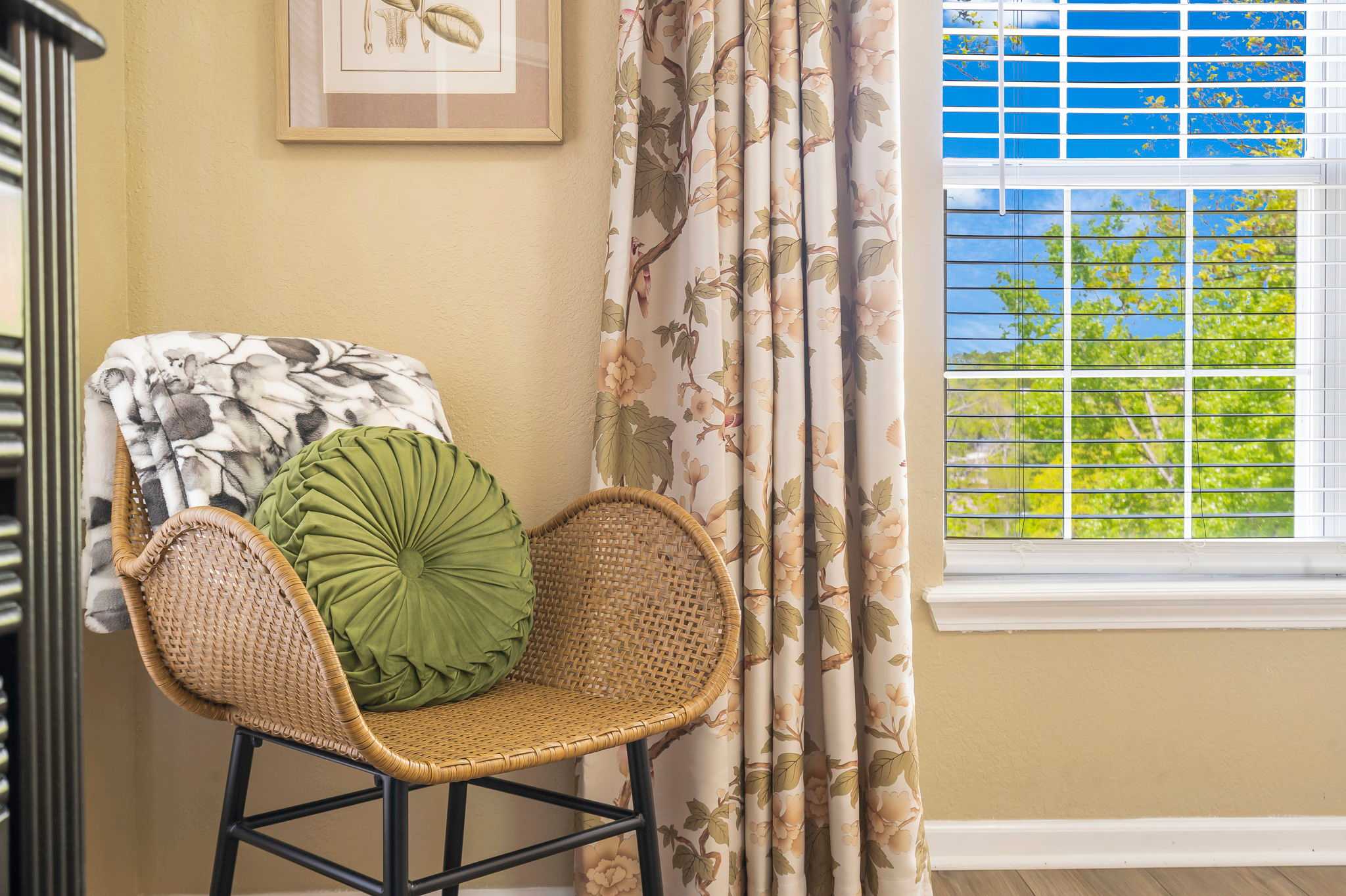 Back inside, the living room welcomes you with cozy interiors, cream-colored walls, wooden flooring and puffy seating areas, perfect to unwind before the smart TV. A roomy balcony offers seating for 4, with views of lush trees and a sweeping 18-hole golf course that engulfs the property.