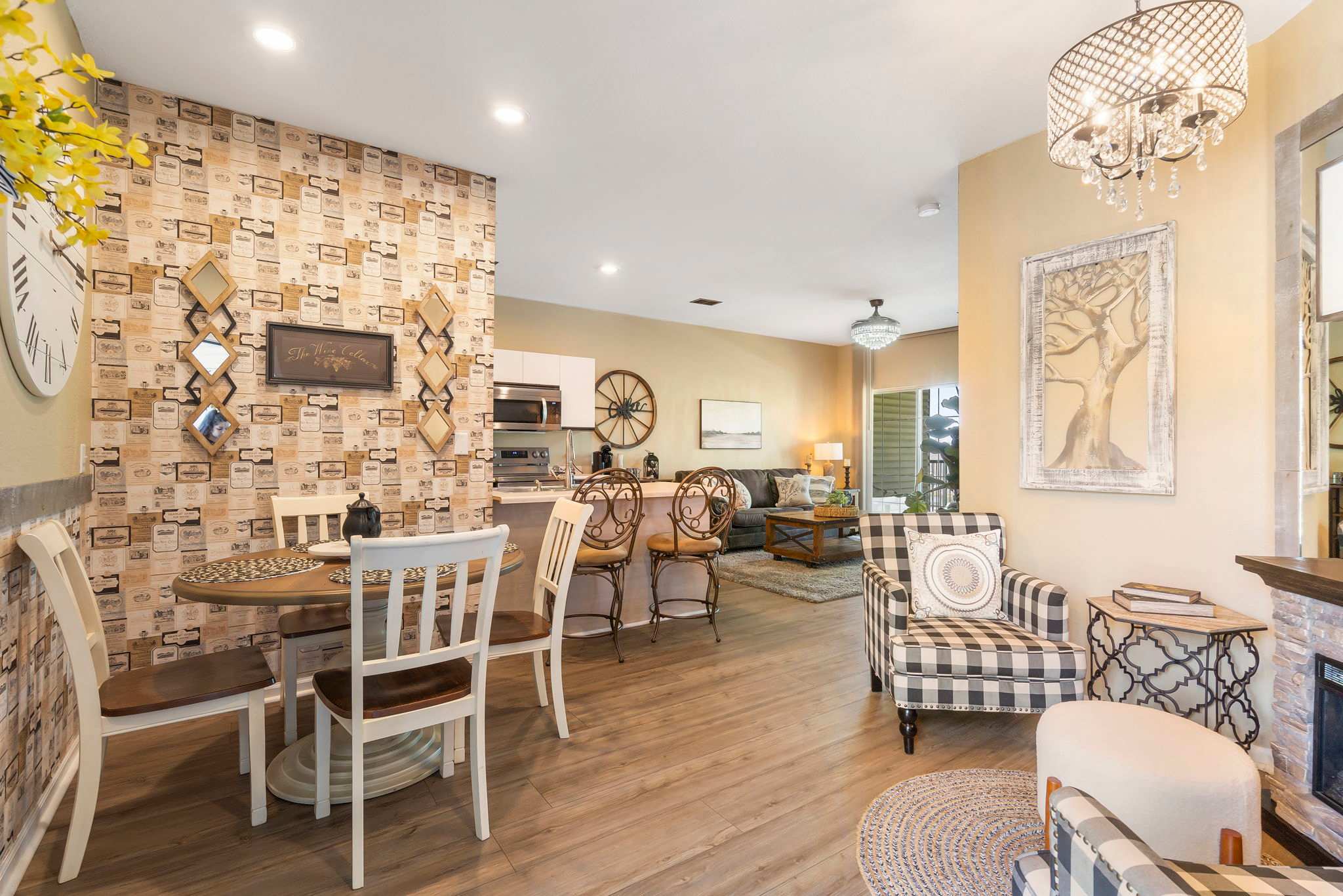 The open-plan kitchen is complete with modern cabinetry and stainless-steel appliances for you to whip up meals at home. Additional items including a coffee machine, toaster, oven, refrigerator, and cookware are available for your convenience. The extended counter with barstools accommodates 3, and is ideal for evening cocktails, while the indoor dining area for 4 is perfect for intimate family meals.