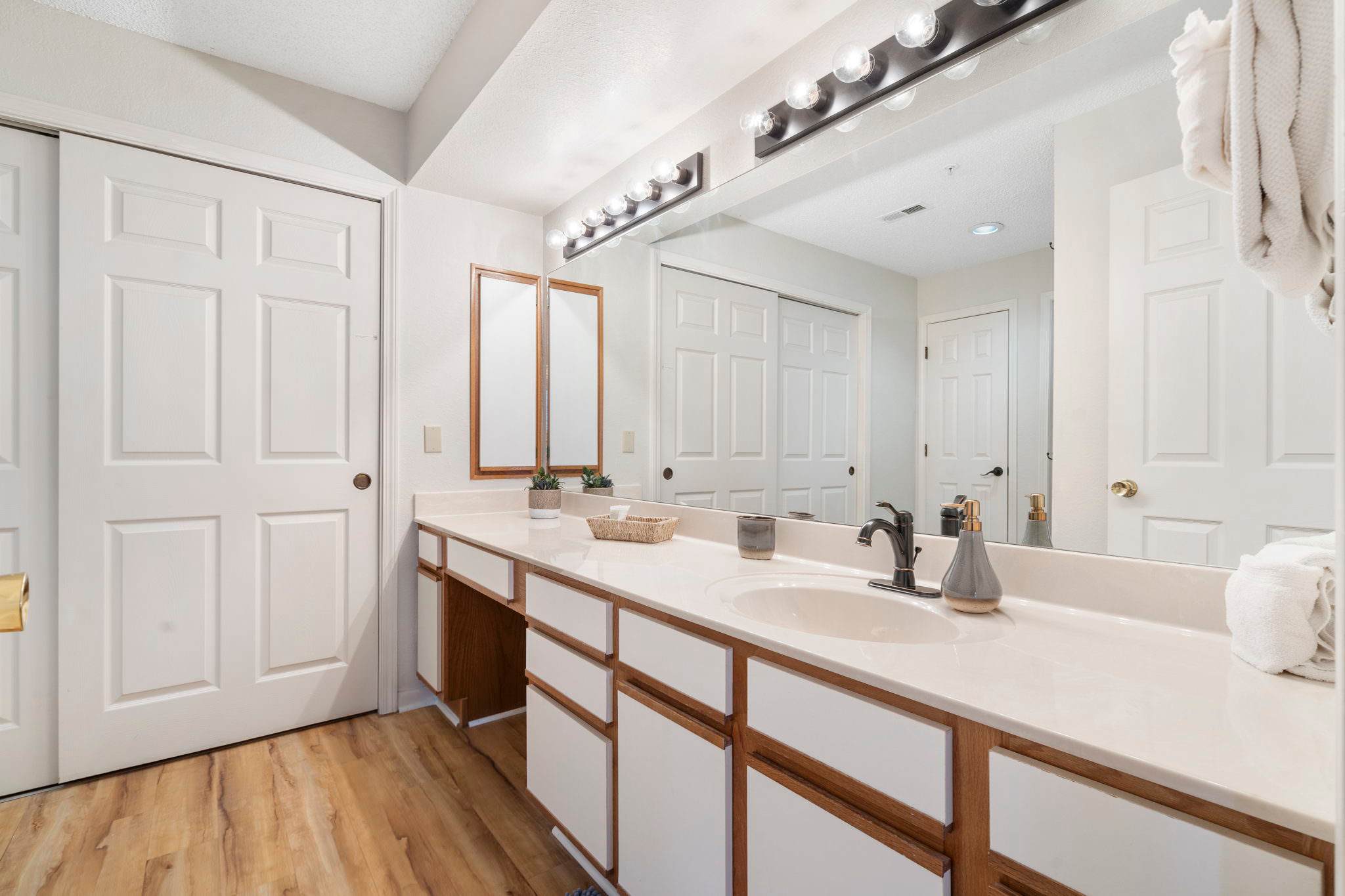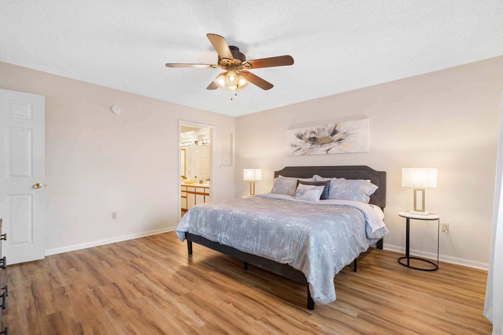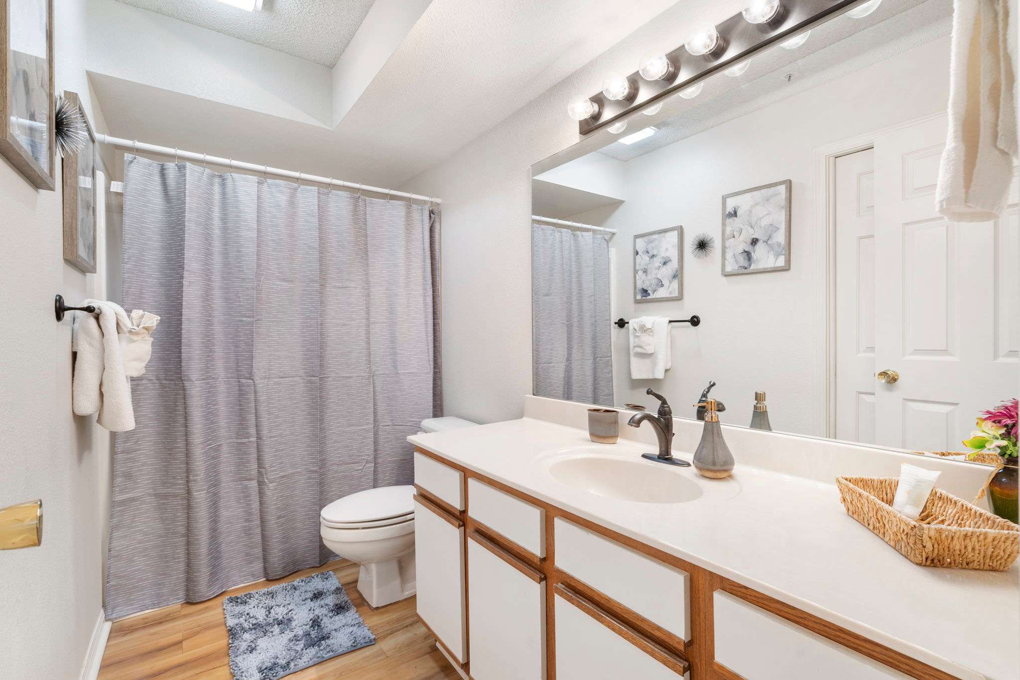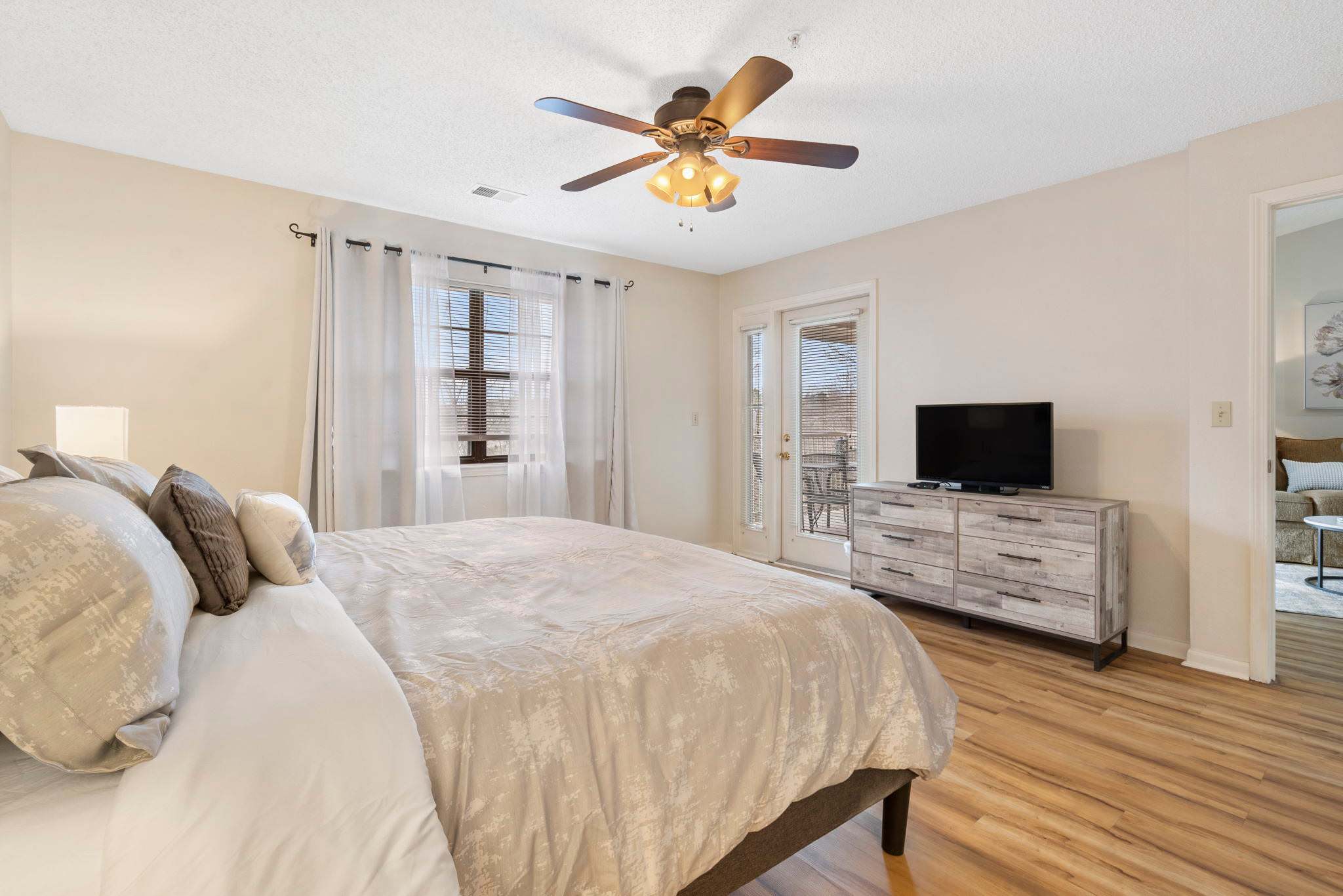 Bedroom #1 is decked out with a King bed, TV, patio access, and private en-suite. The en-suite features a shower/jetted tub combo.