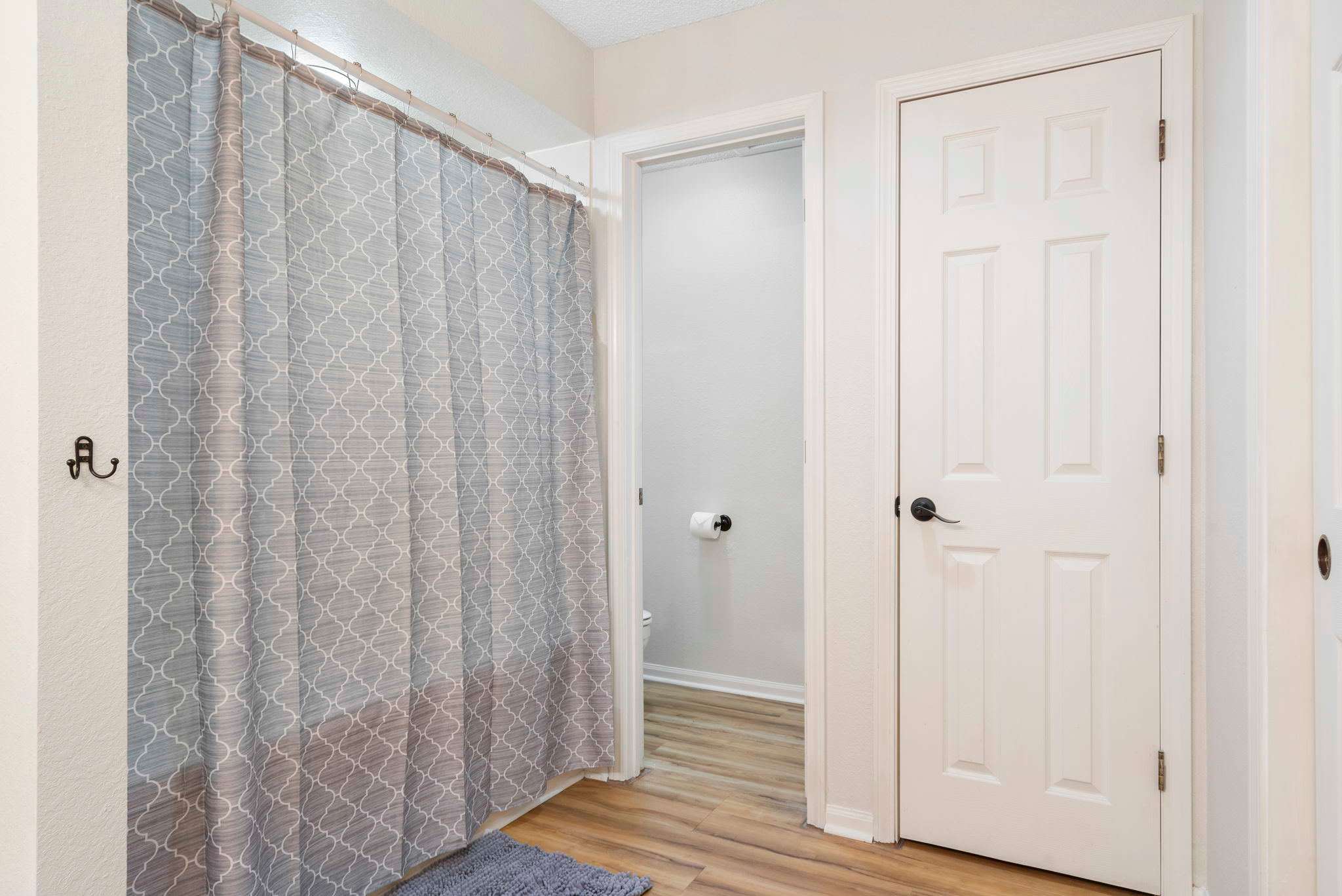 Bedroom #2 is outfitted with a King bed, TV, and shared en-suite. The en-suite highlights a shower/tub combo.