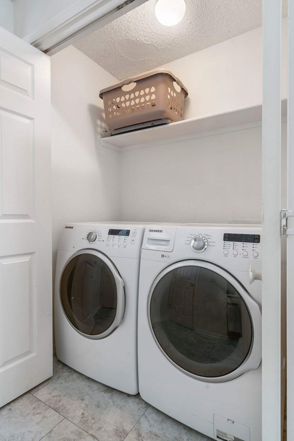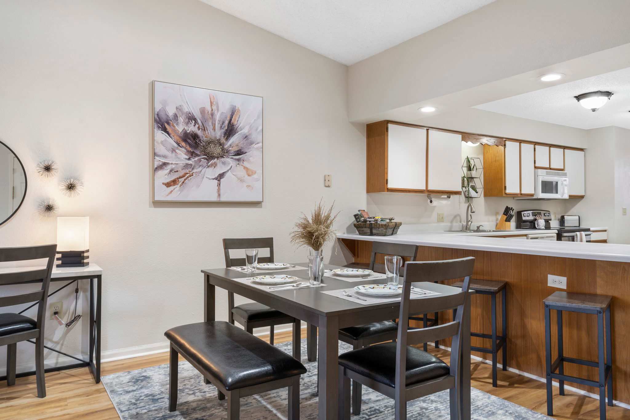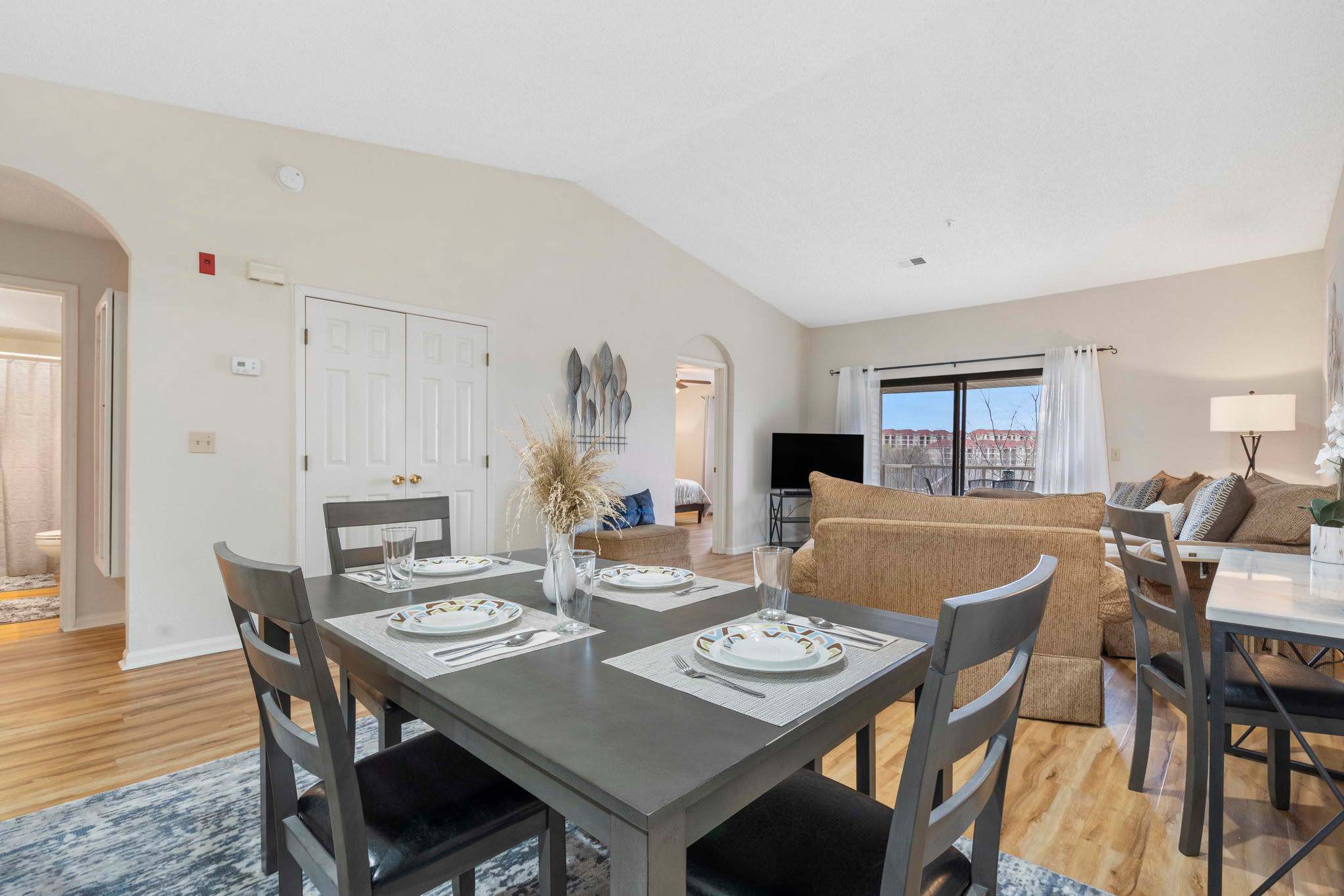 Back inside, the kitchen is equipped with everything you need to whip up scrumptious meals from home. Additional kitchenware such as a coffee maker, toaster, and more are available for your convenience. The extended counter is perfect for extra prep space with help from fellow guests or day-to-day casual dining with the counter seating. To enjoy more formal meals together, a dining table for 6 is steps away.