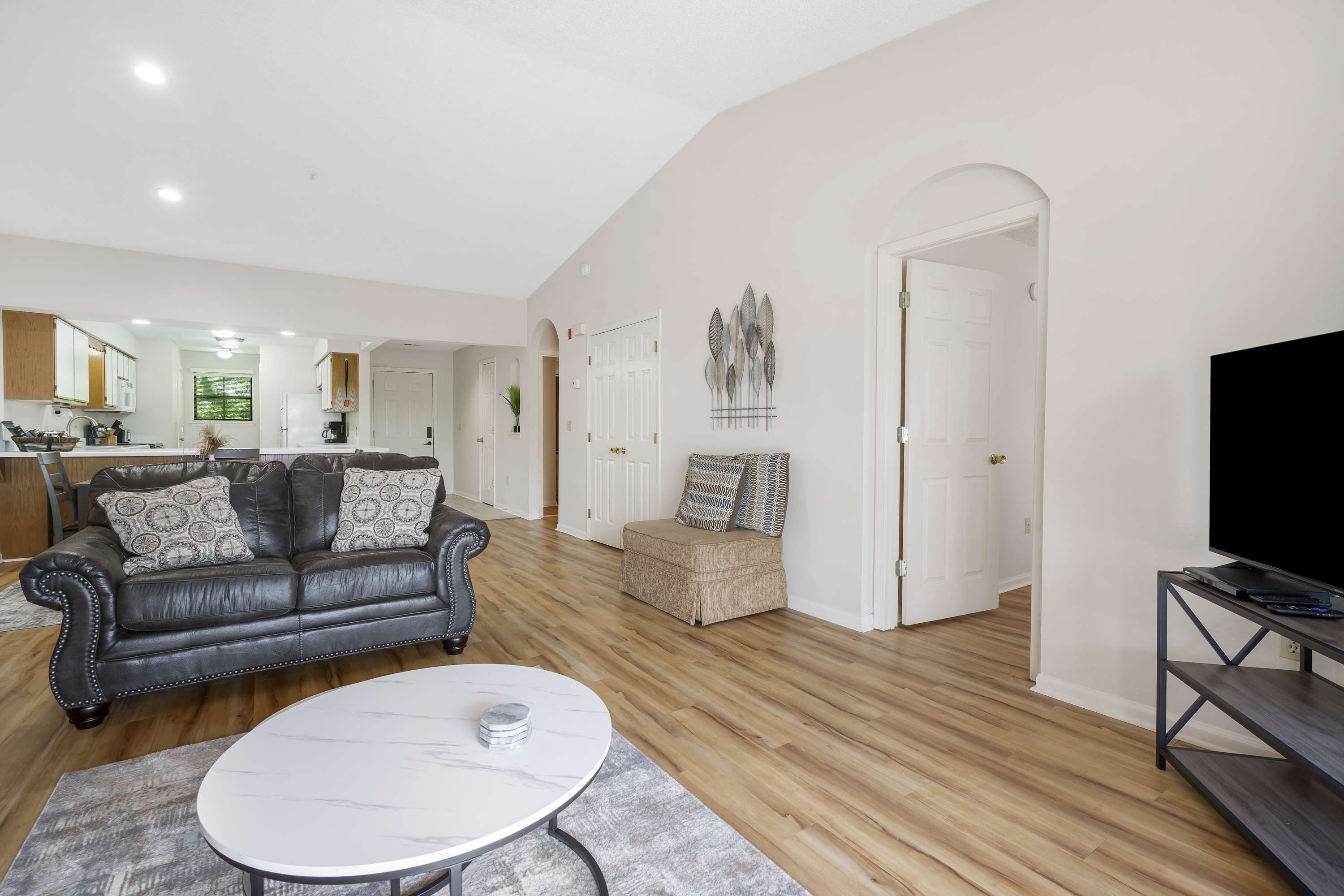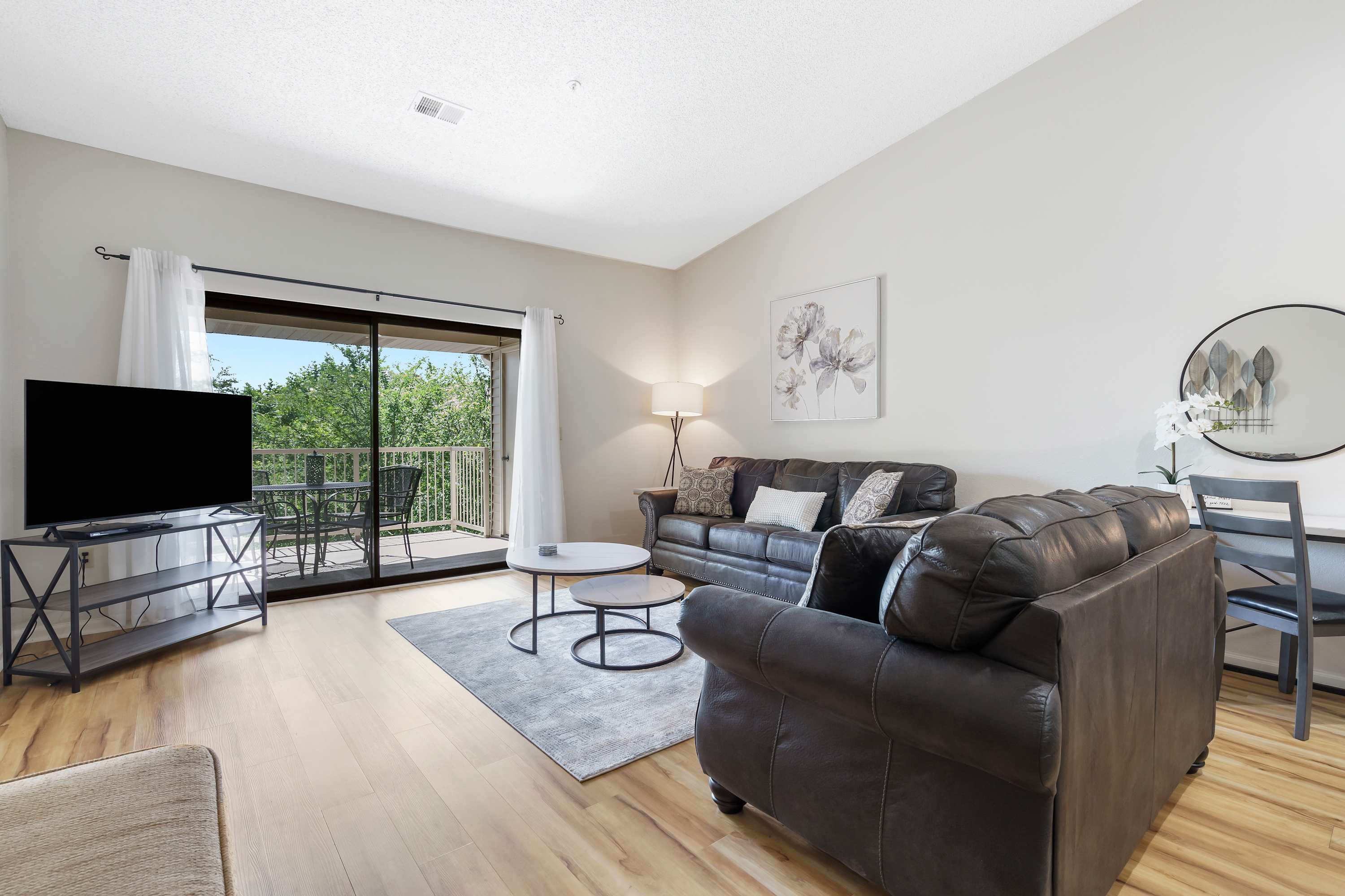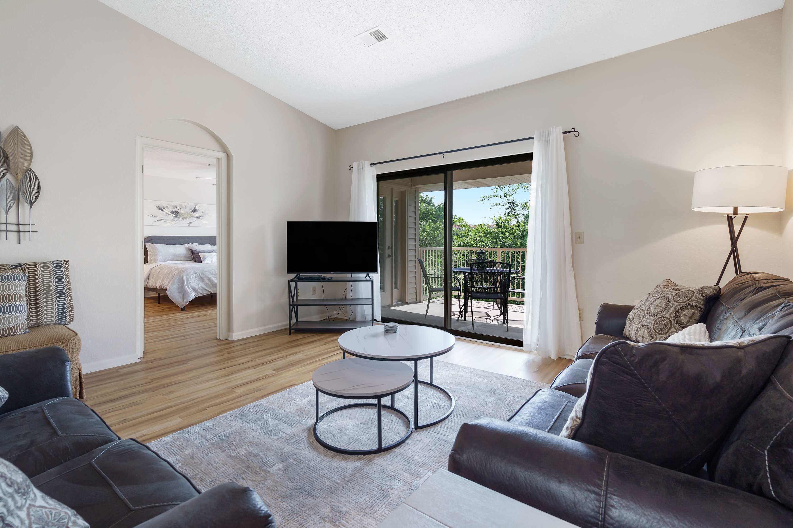 The open-concept design gives direct sightlines between the living room, dining area, and kitchen - optimal for enjoying each other's company. The living room offers ample seating with an oversized sofa and chair with ottoman. This room also features a TV and access to the outside patio. The covered patio offers furniture and is a great space to enjoy your morning coffee, or a nightcap.