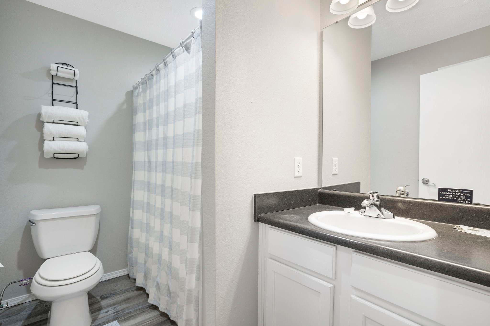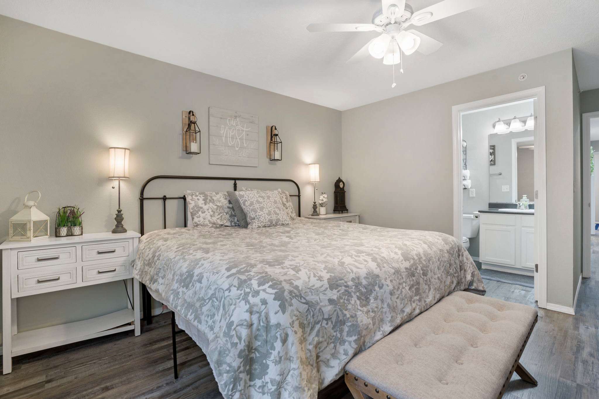 An additional full bathroom features a shower/tub combo and is stocked to serve guests.