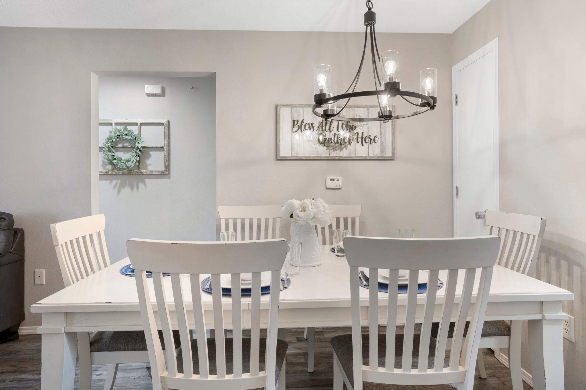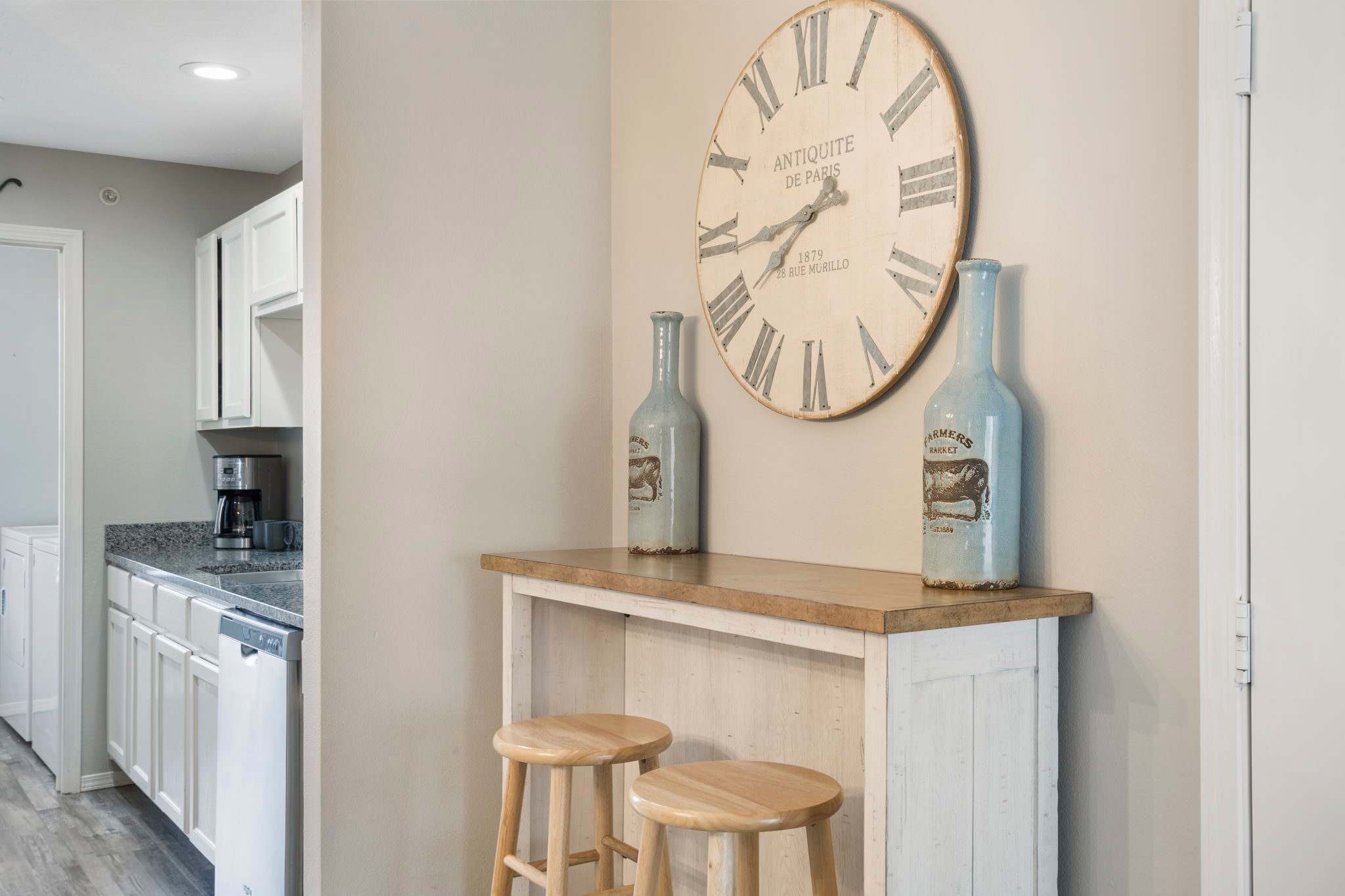 The kitchen is equipped with a full suite of stainless steel appliances and everything you need to whip up meals from home. A blender, toaster, and coffee maker are also available for your convenience. Steps from the kitchen, a beautiful farmhouse-style dining table seats 6. A high-top table and stools are adjacent to the dining area for more casual meals.
