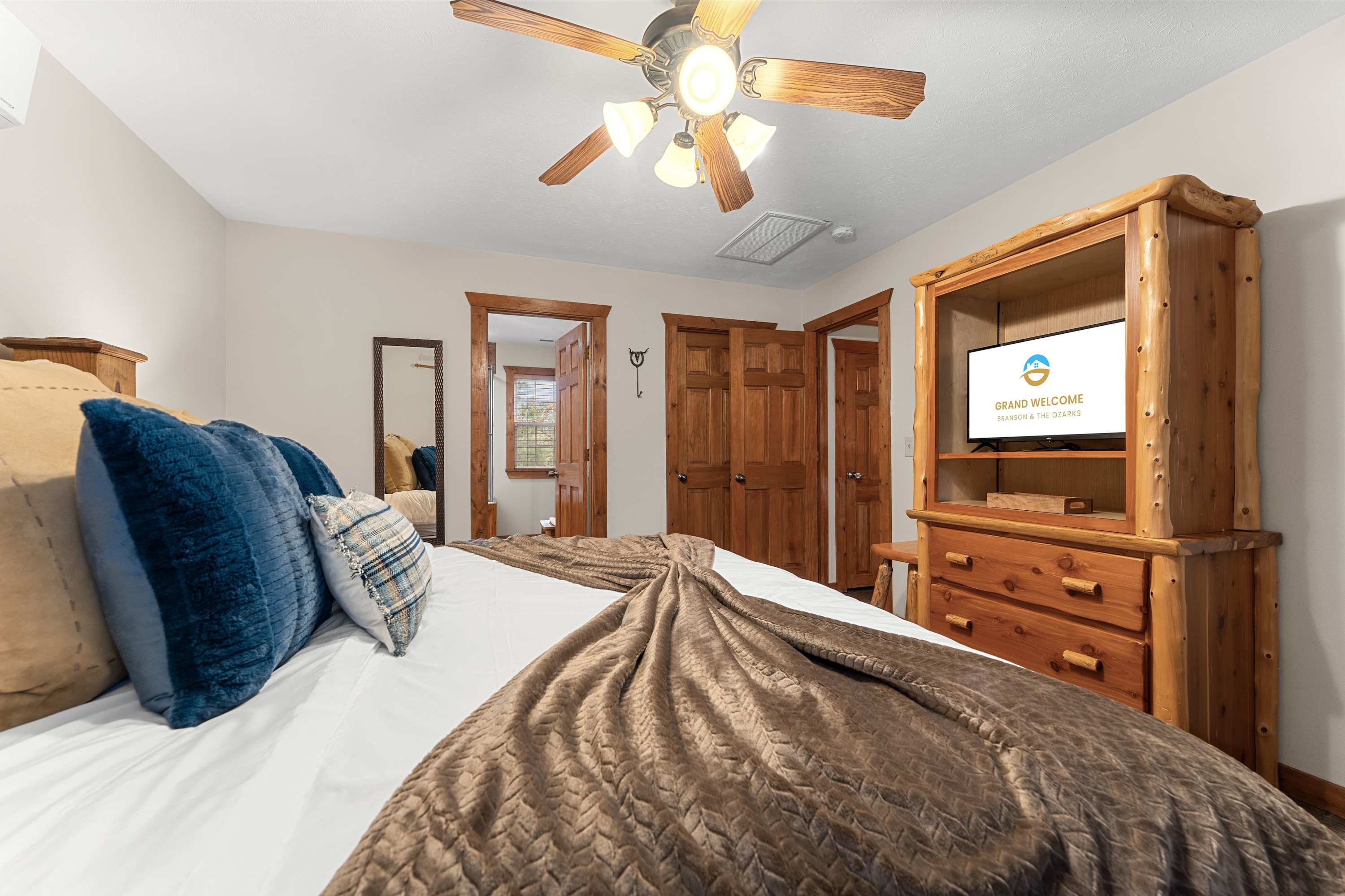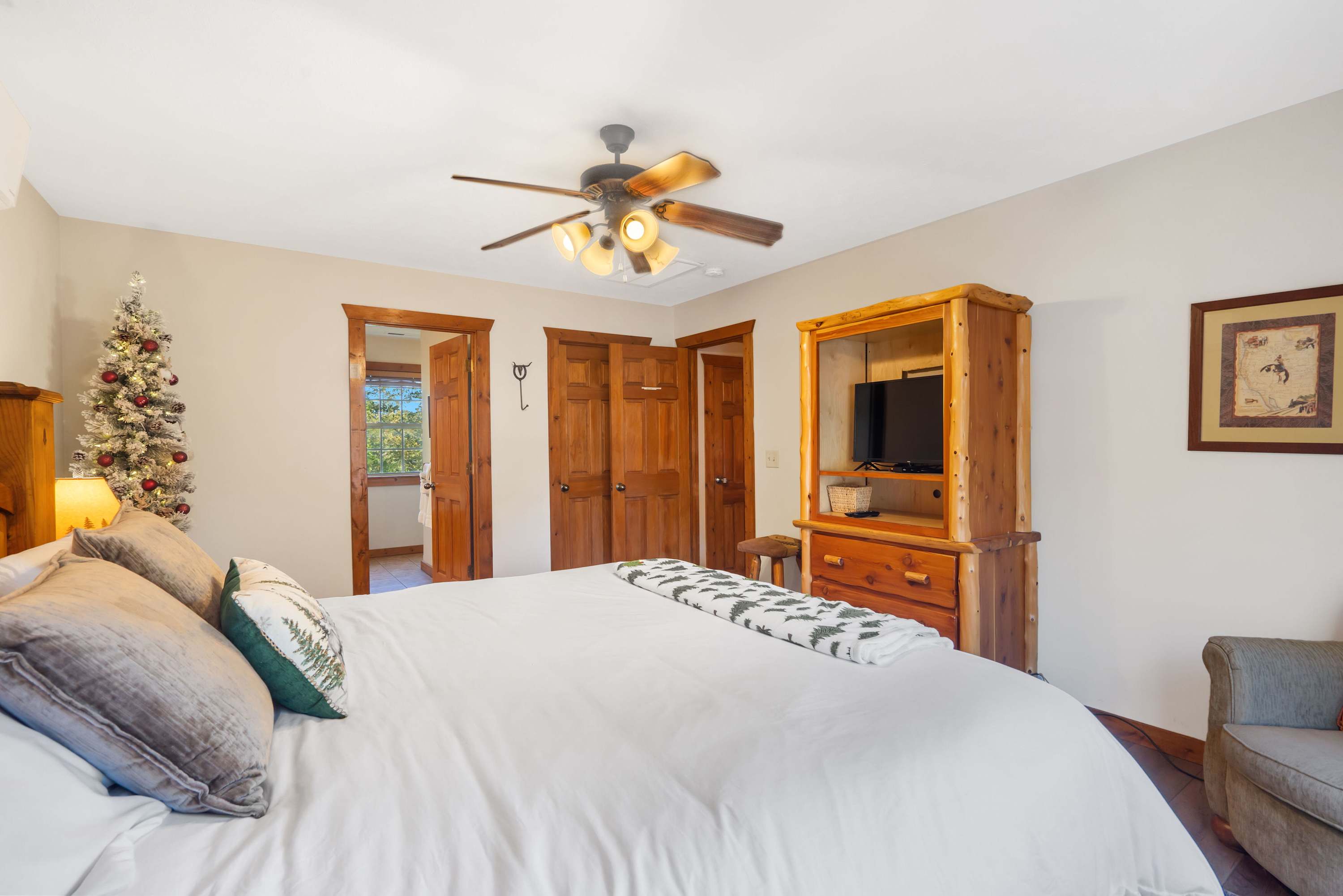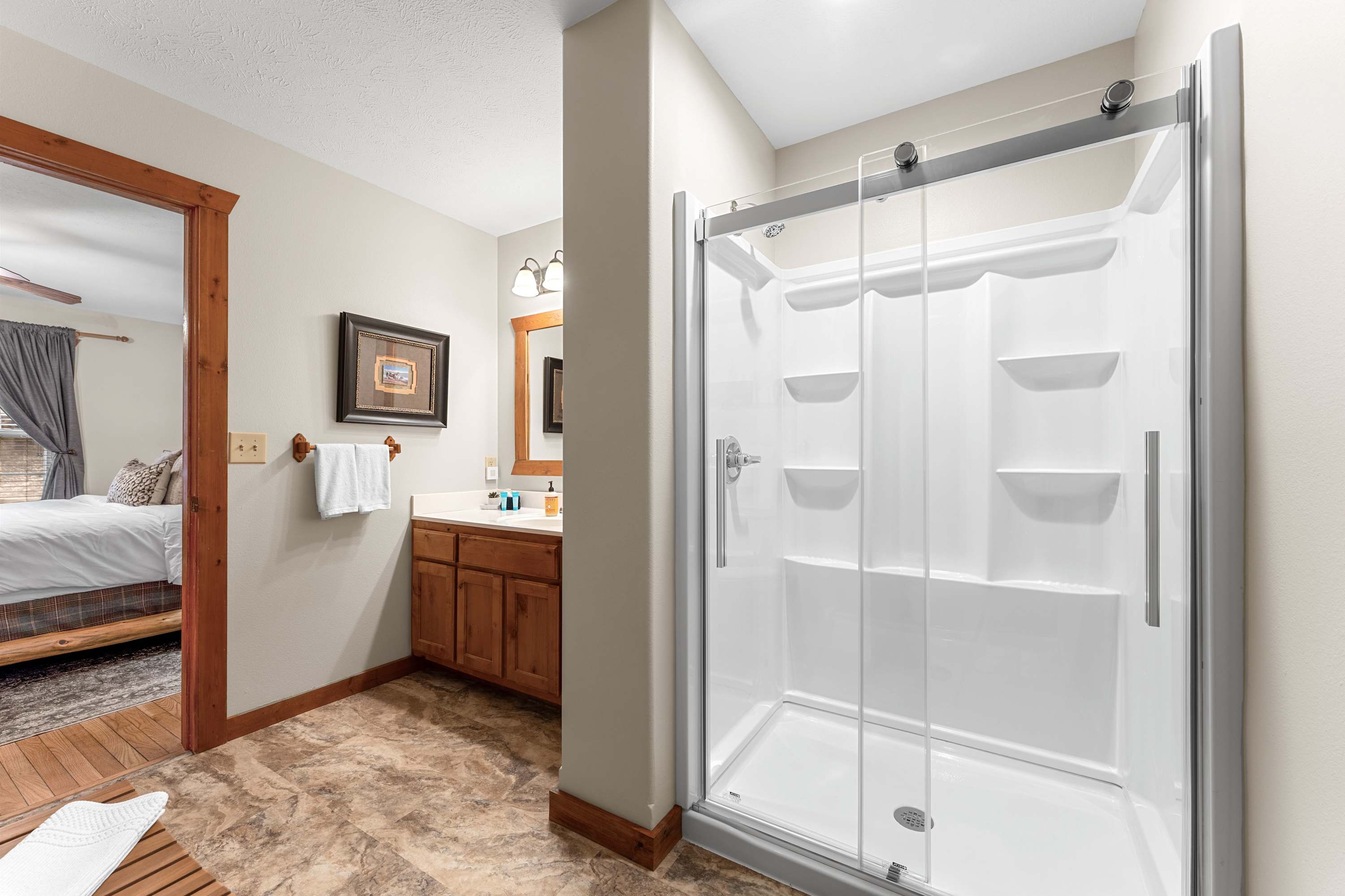 Bedroom #1 is outfitted with a King bed, Smart TV, and private en-suite. The en-suite offers an oversized jetted shower/tub combo.
