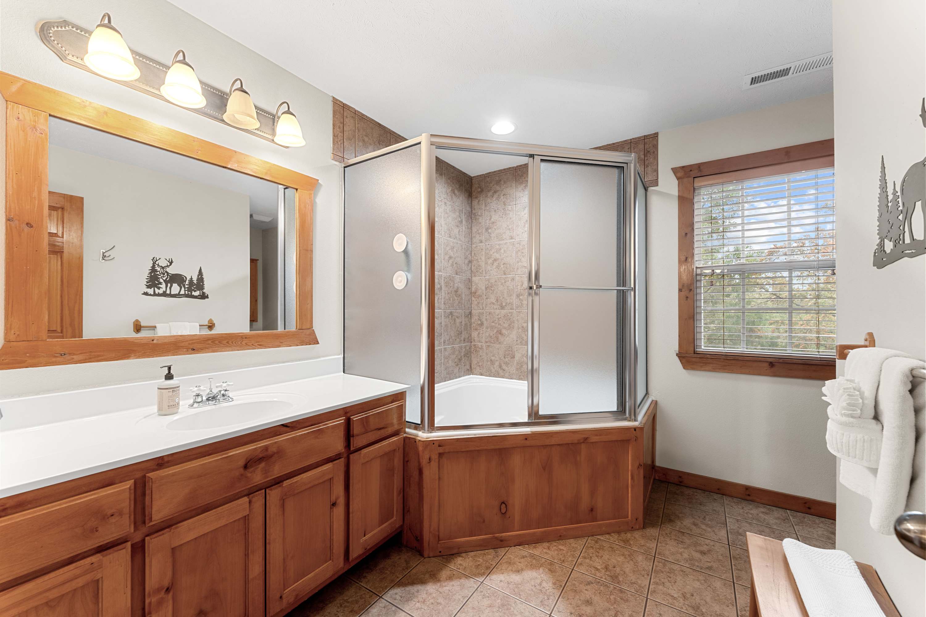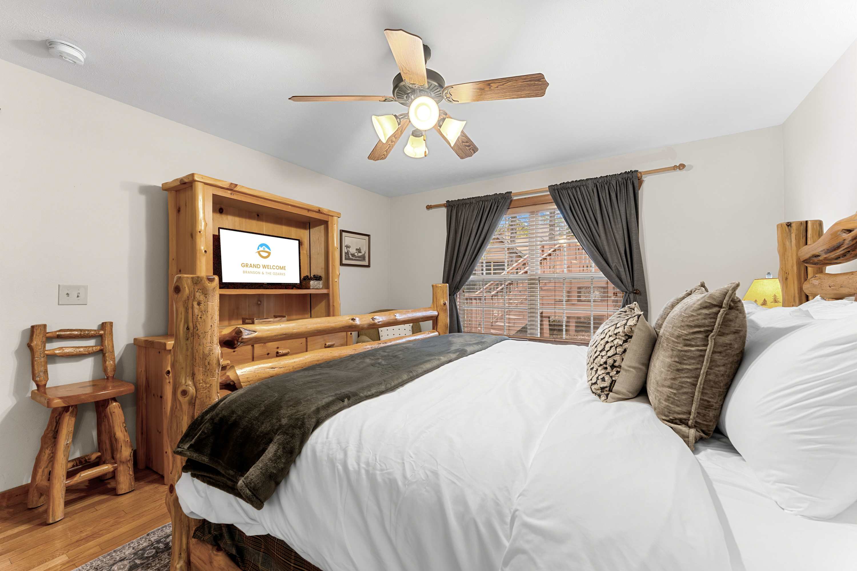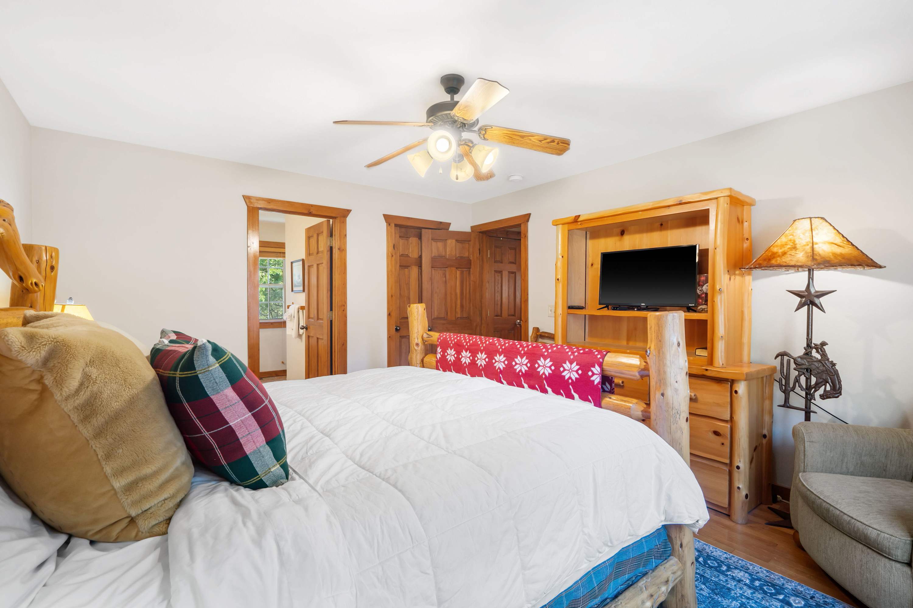 Bedroom #1 is outfitted with a King bed, Smart TV, and private en-suite. The en-suite offers an oversized jetted shower/tub combo.