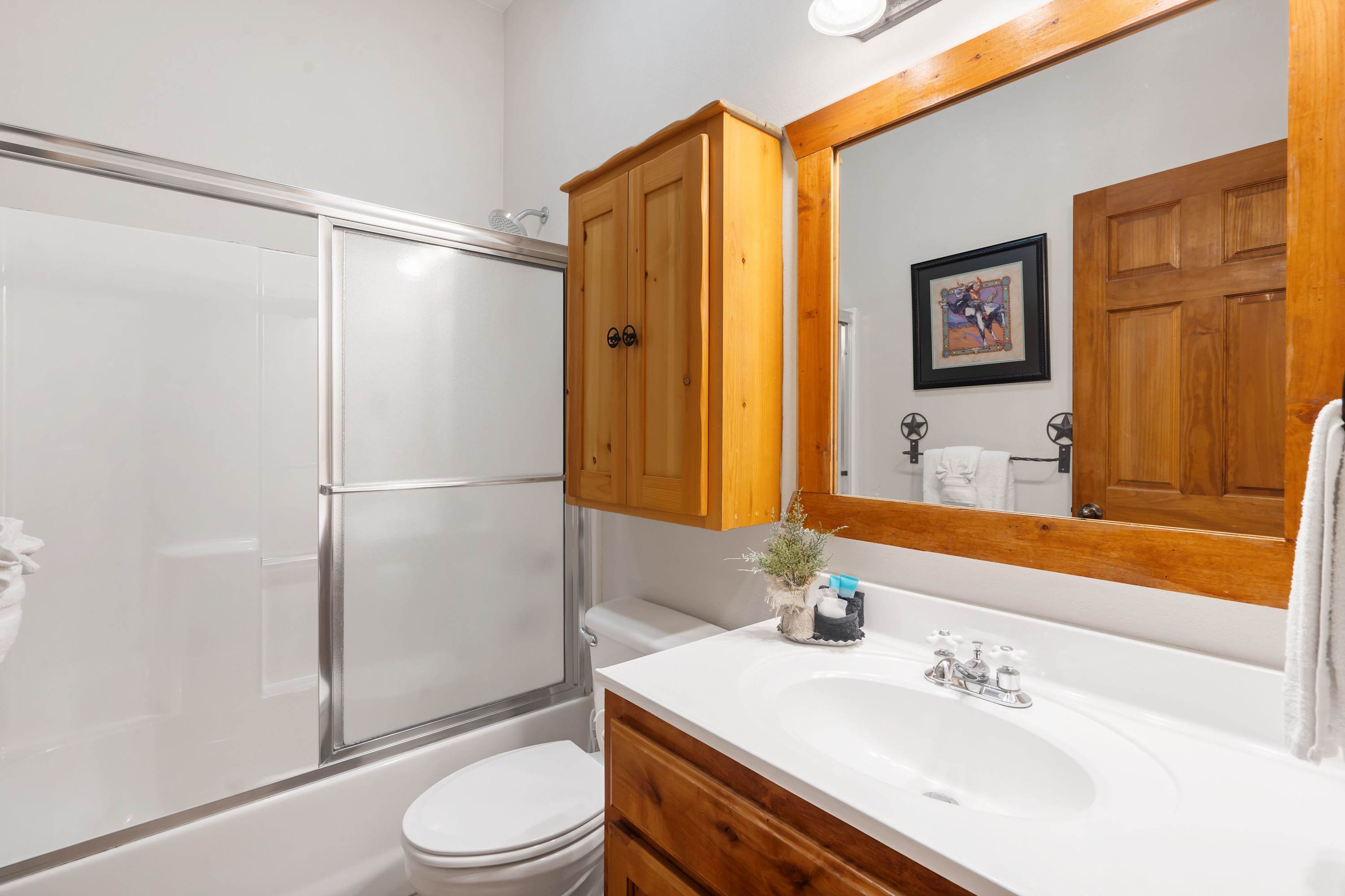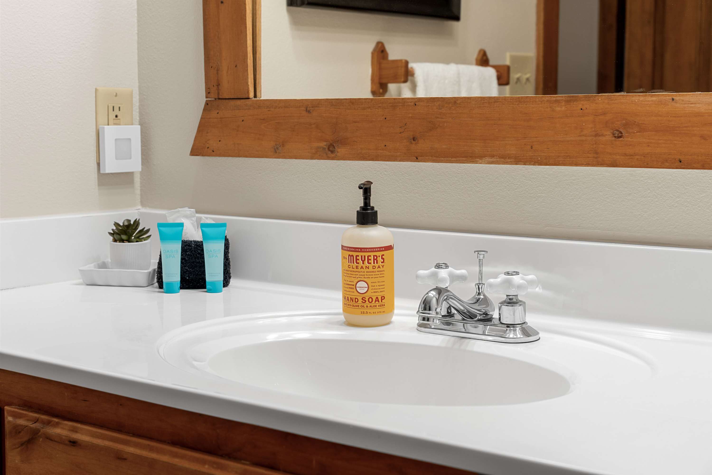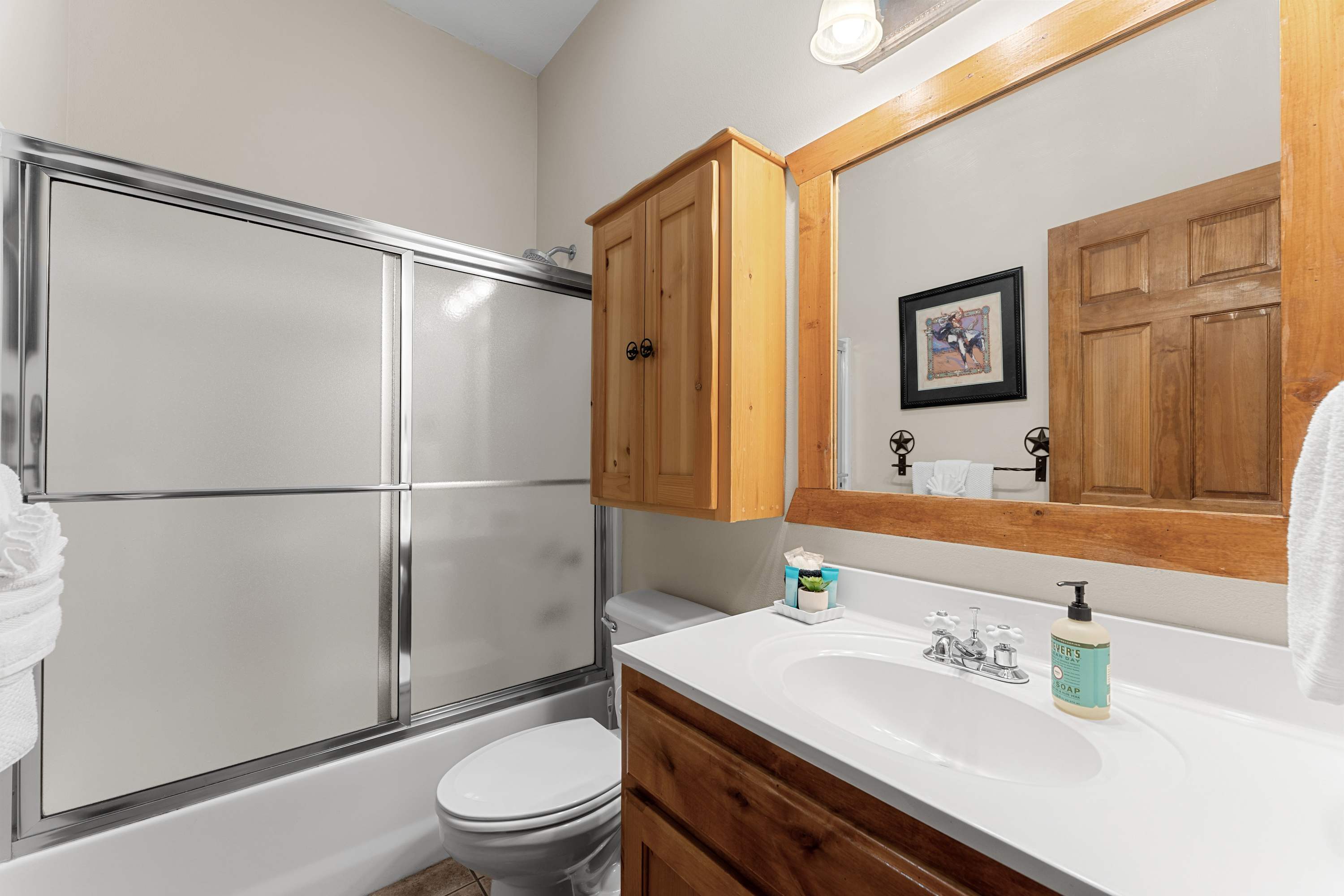 An additional full bathroom with a shower/tub combo is stocked to accommodate guests.
