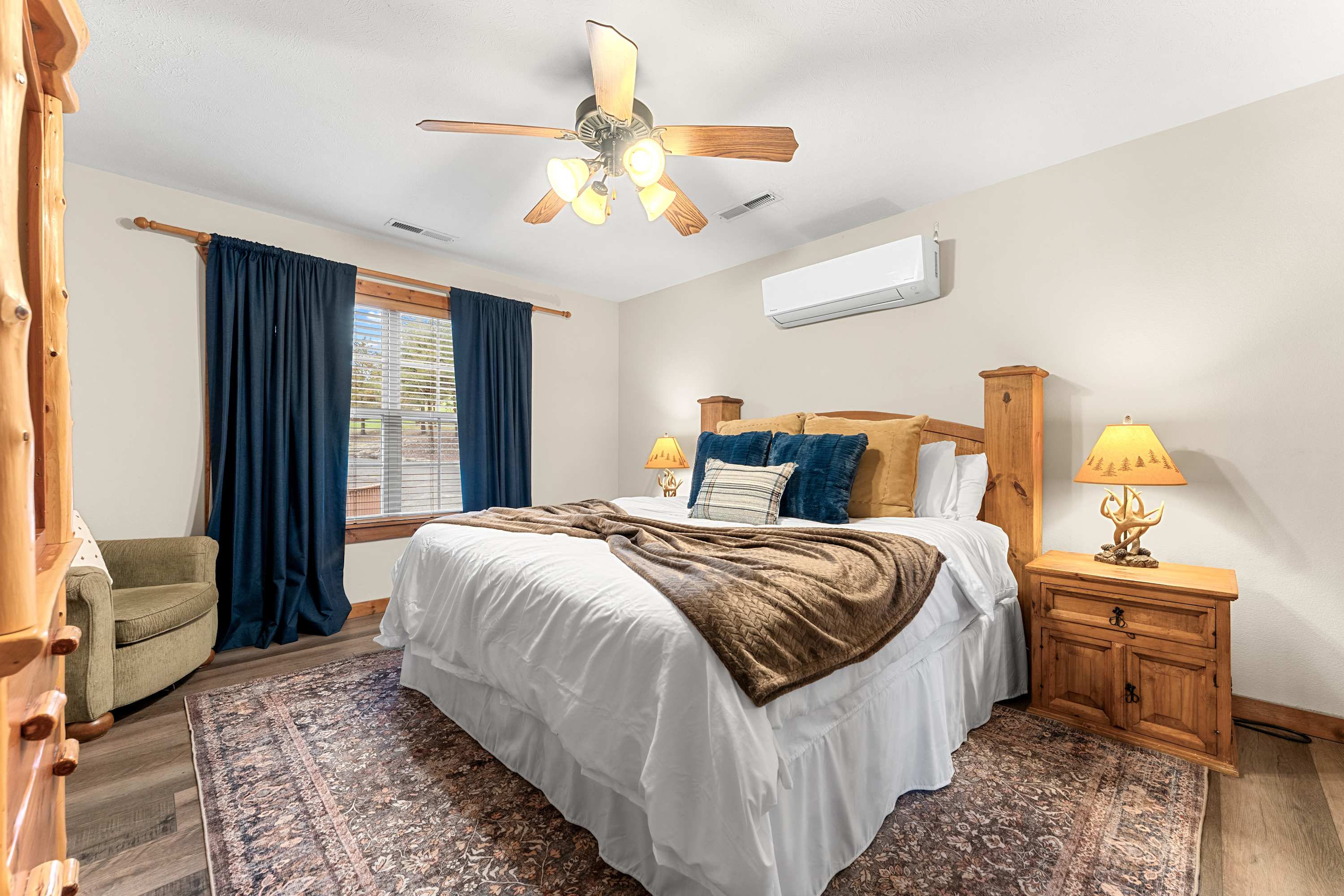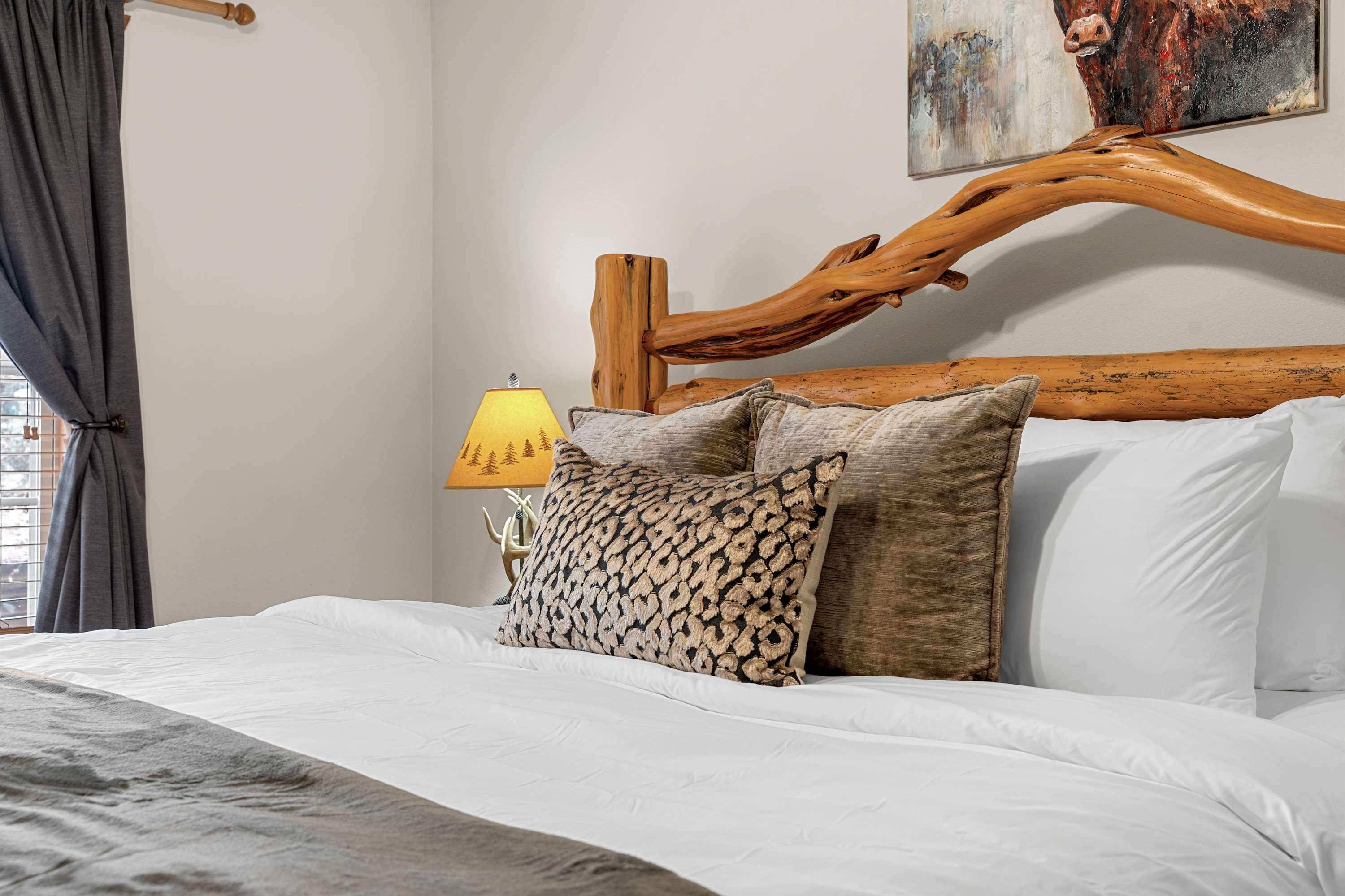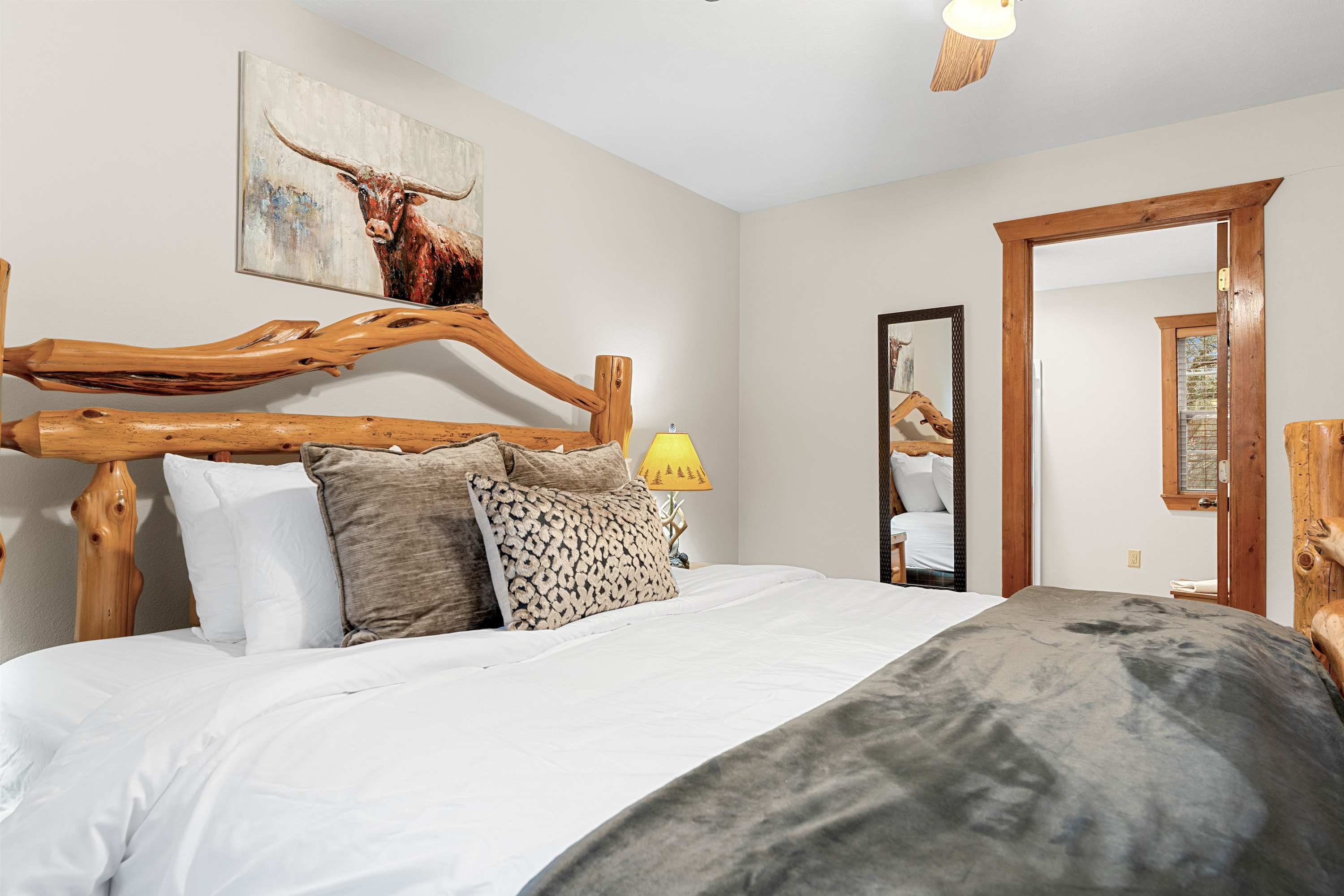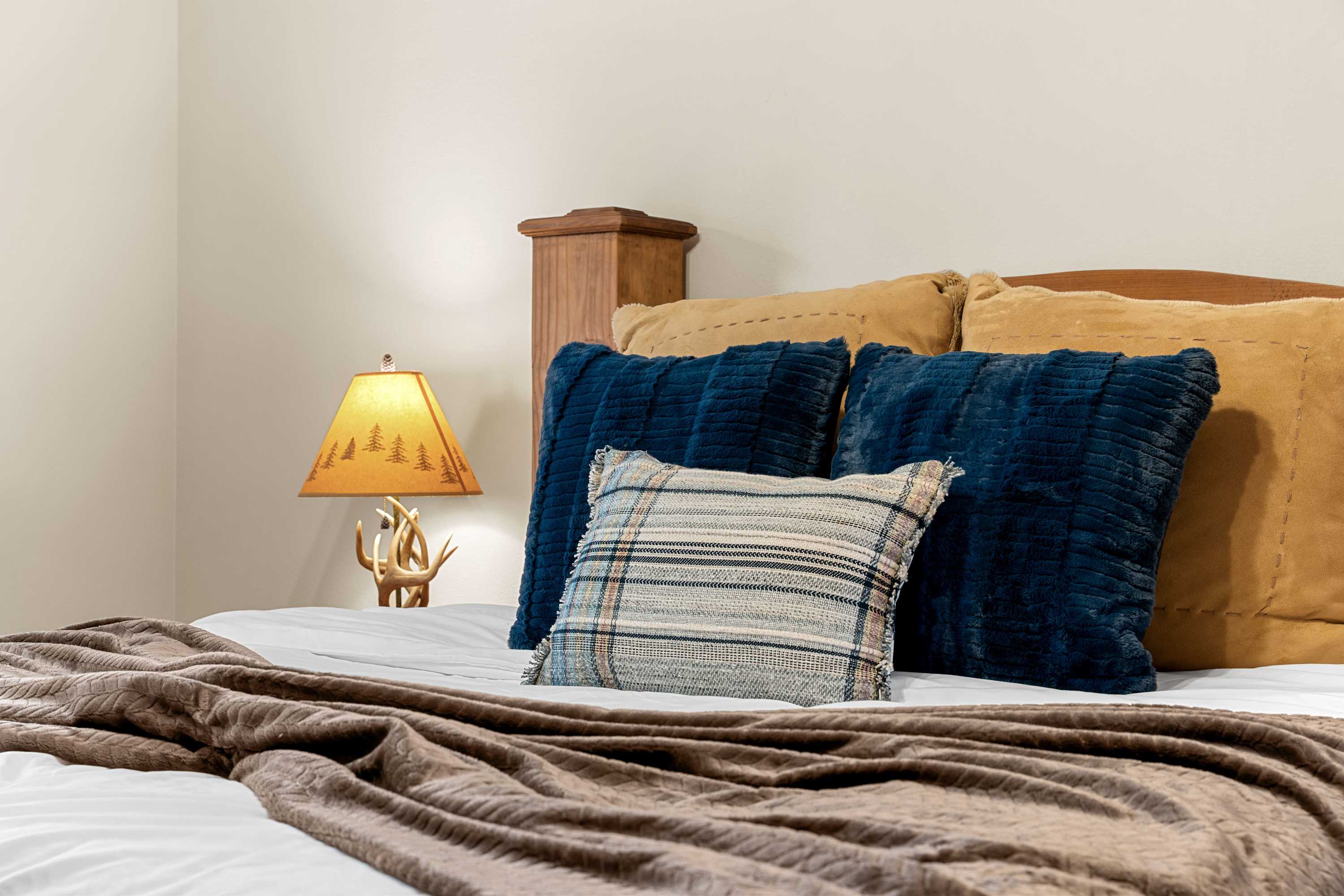 The home sleeps up to 10 guests comfortably between 3 private bedrooms, the lower-level living room, and the sofa sleeper on the main floor. Each space is furnished with one-of-a-kind custom beds and cozy linens to ensure everyone has a restful stay.