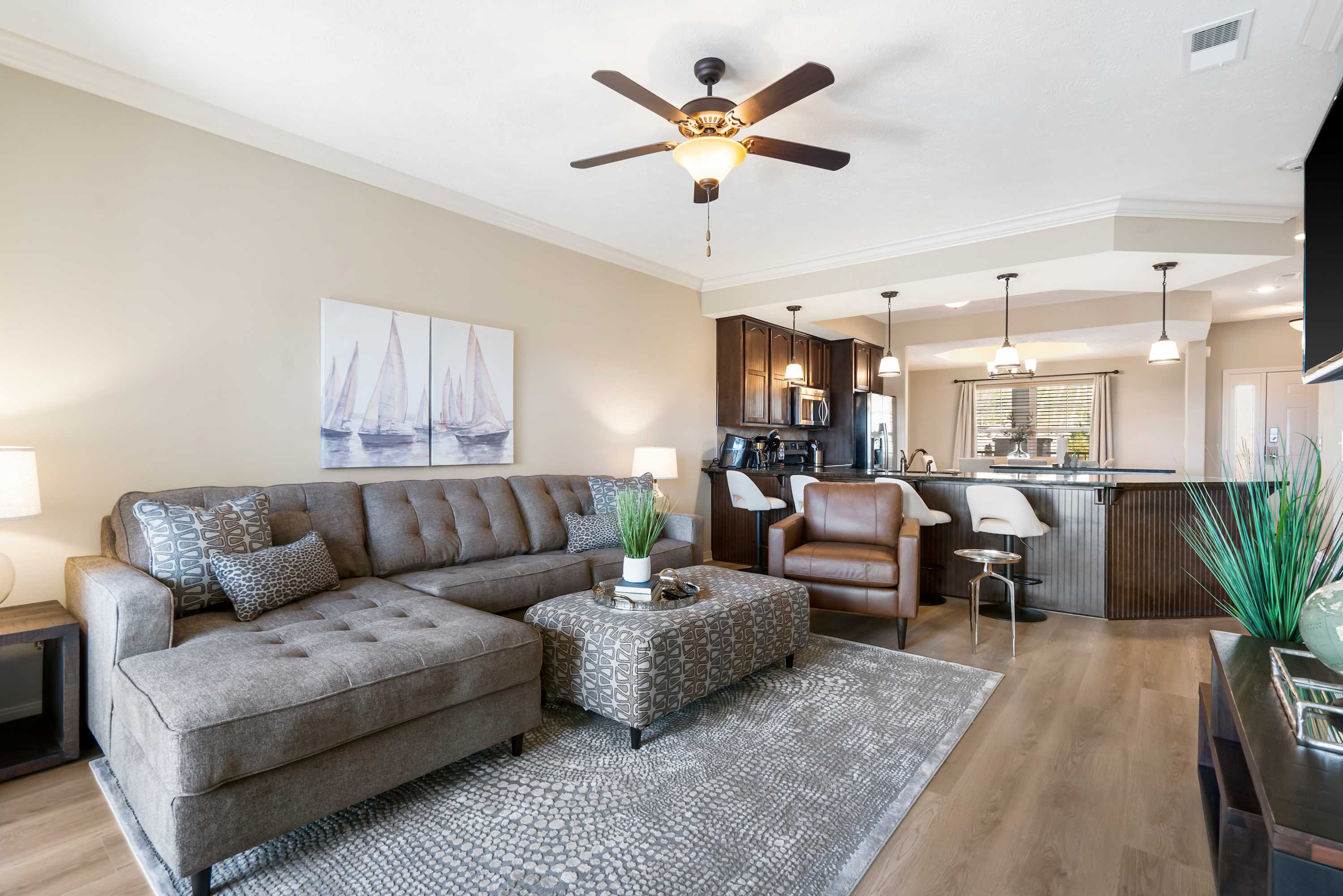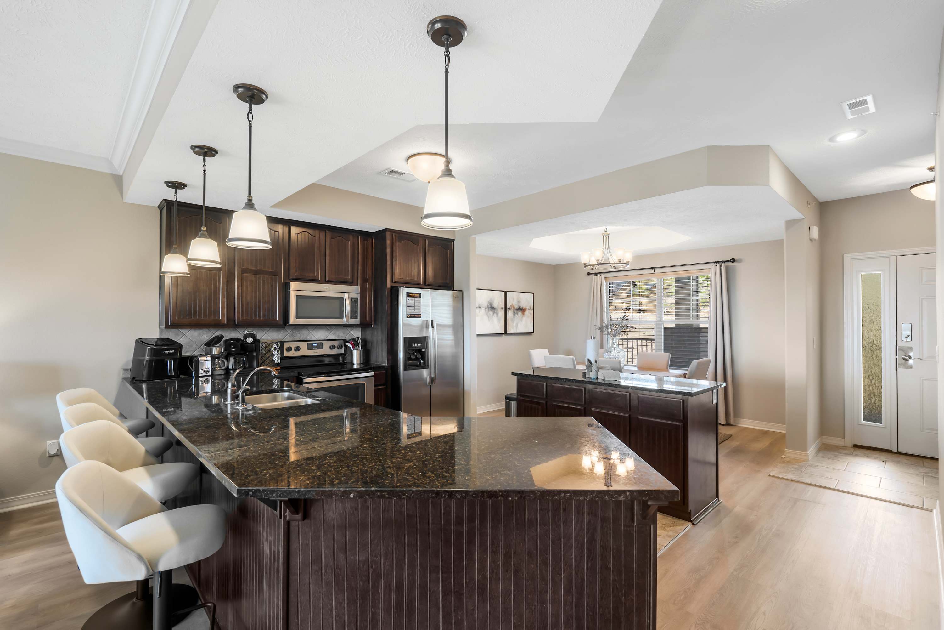 When you realize your daydream has turned into your reality, head back inside to check out the rest of the unit. The open living space offers ample seating and a TV. The kitchen comes equipped with stainless steel appliances and everything you may need to whip up delicious meals from home. Additional kitchenware such as a blender, toaster, and coffee maker are all available for your convenience. The extended counter is ideal for extra prep space and casual bites. For more formal dining, head to the table for 6.