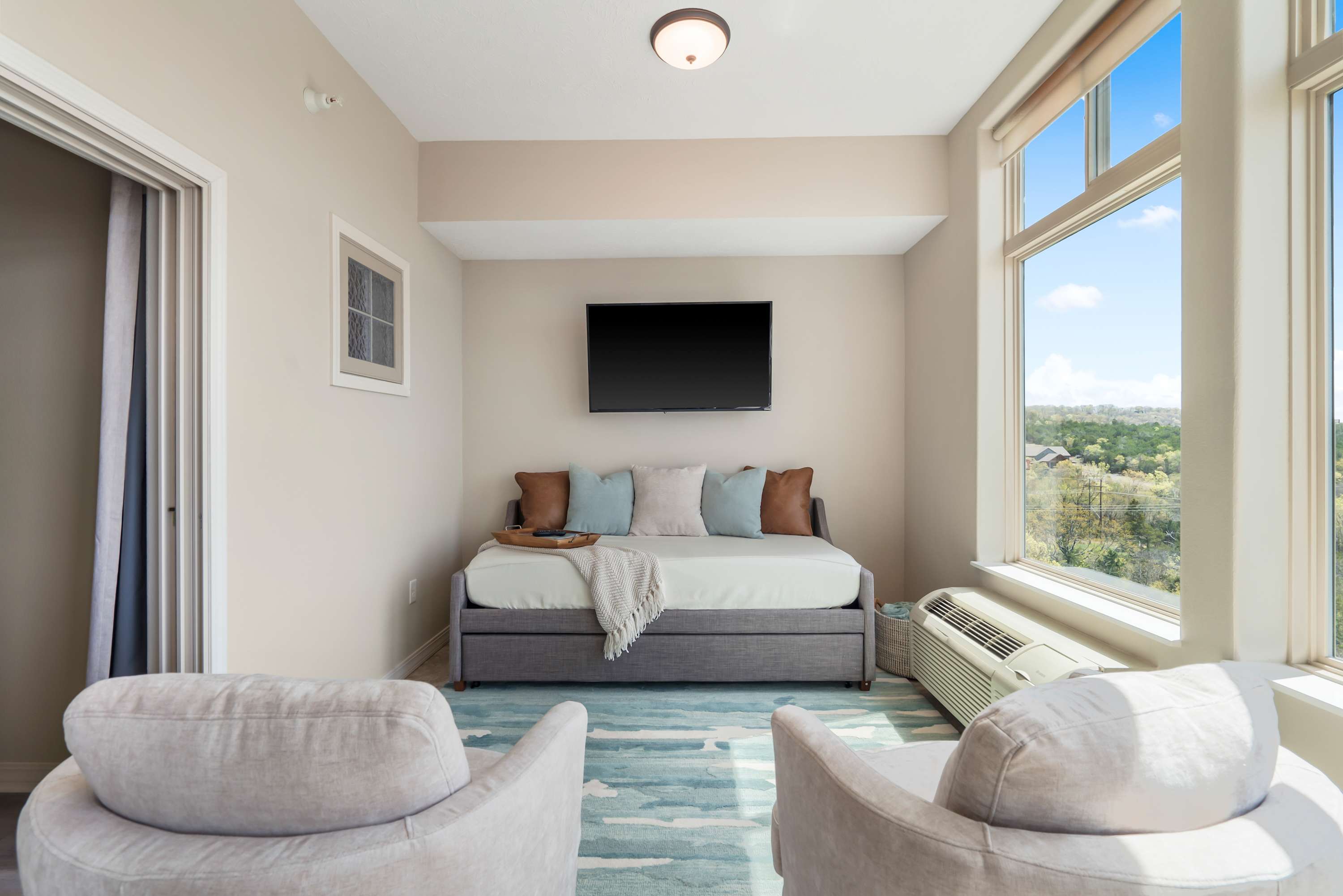 The four-season room is lovely with a jaw-dropping view of Table Rock Lake. The room is configured with a Full bed and Full-size sofa sleeper.