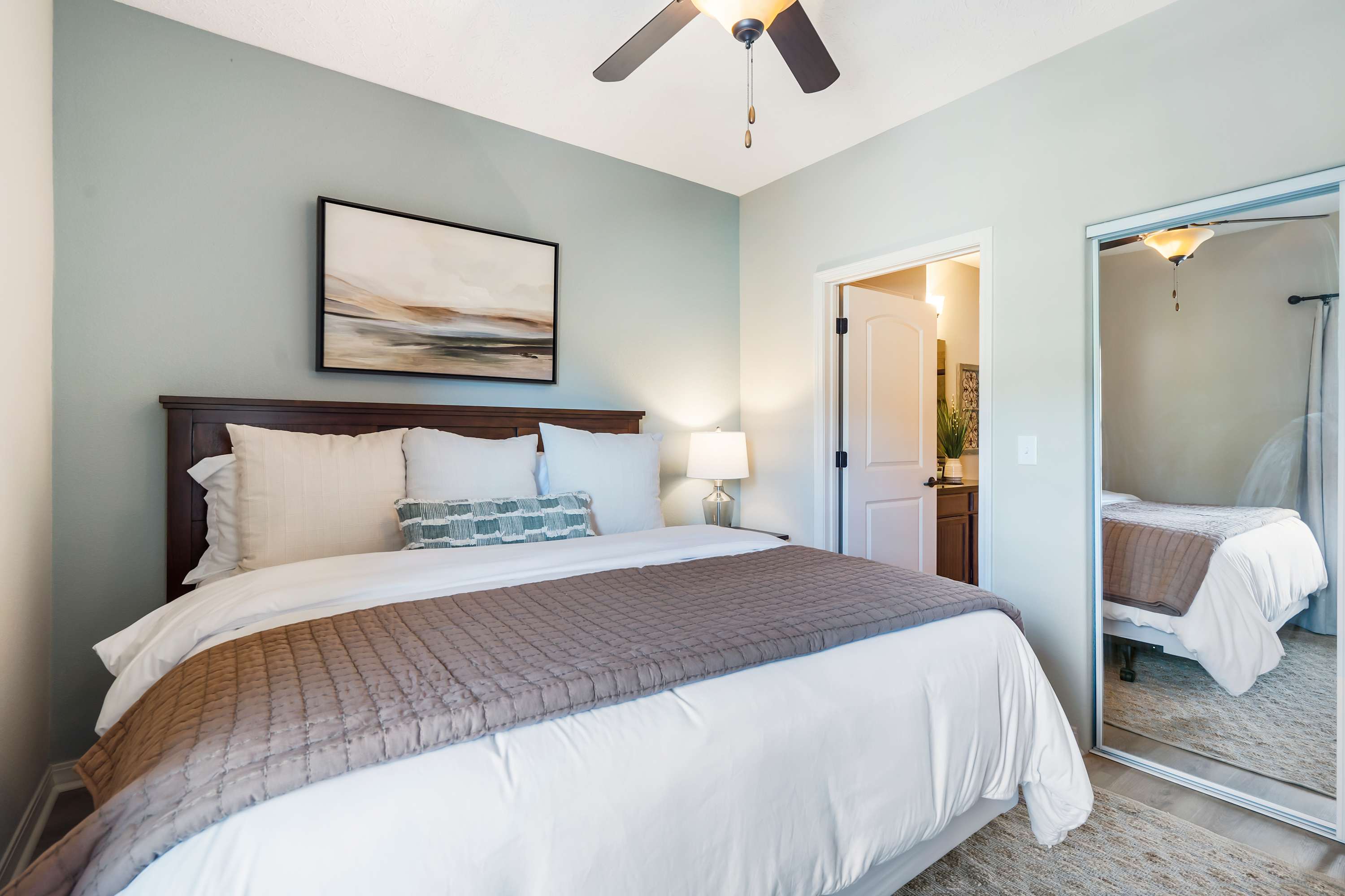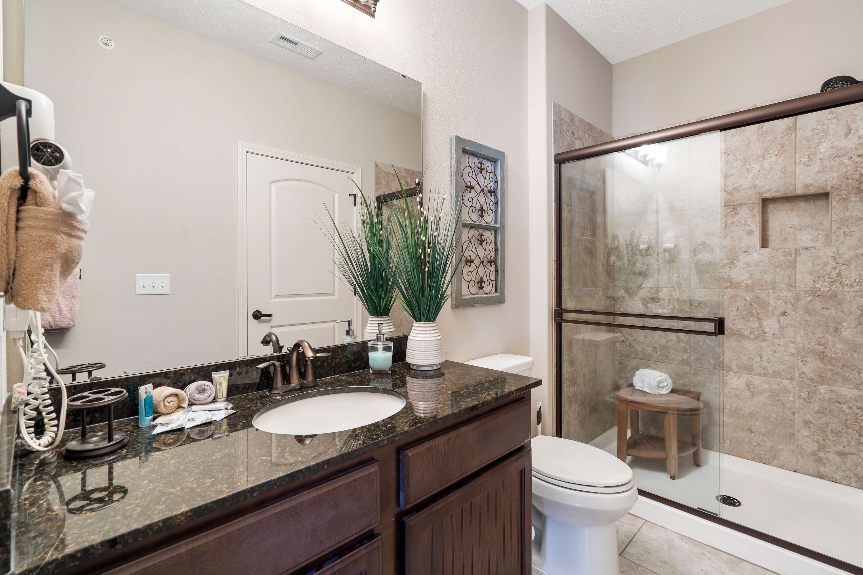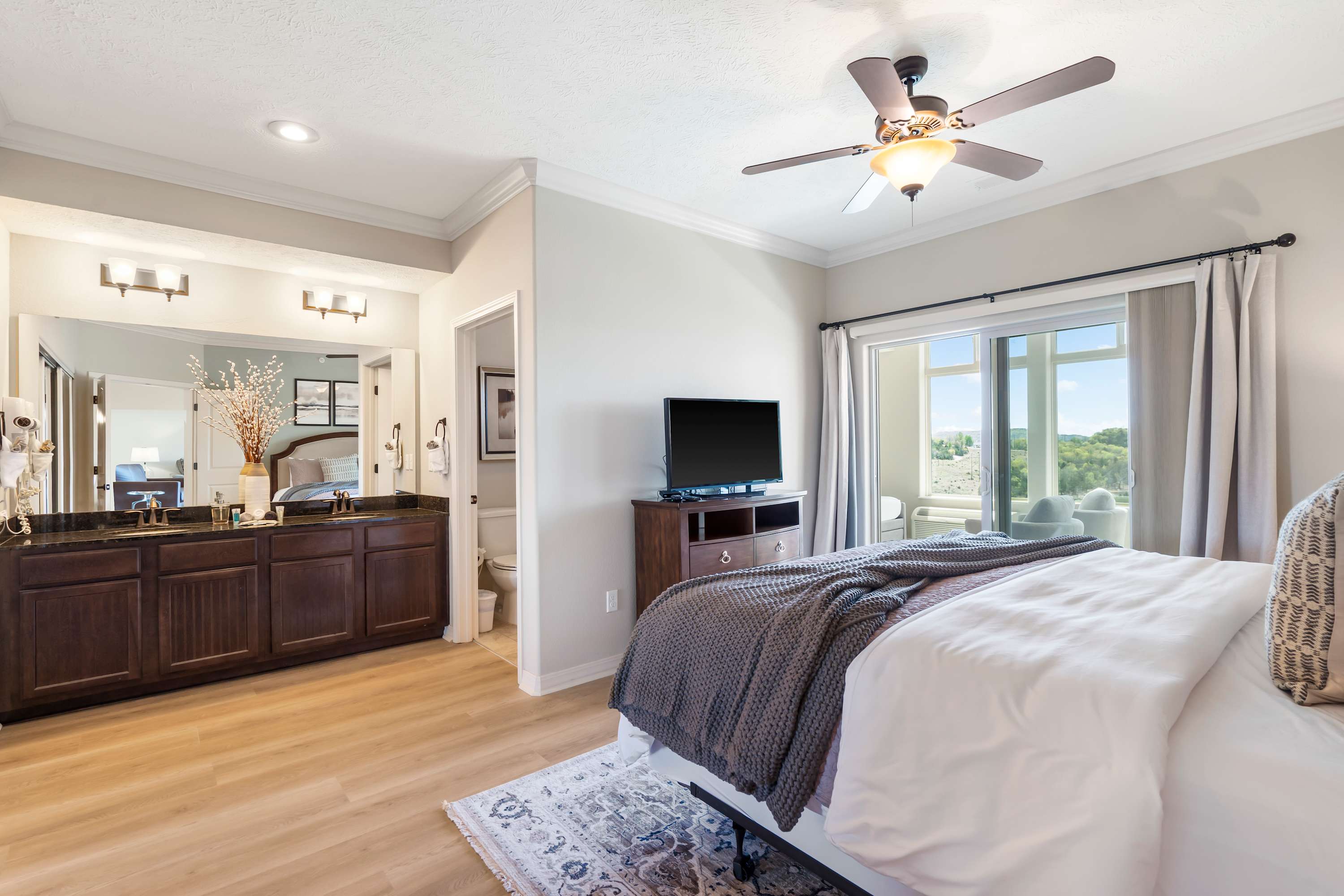 - Bedroom #2 is outfitted with a King bed, Smart TV, and shared en-suite. The shared en-suite has a large vanity and walk-in shower with custom tiling.
