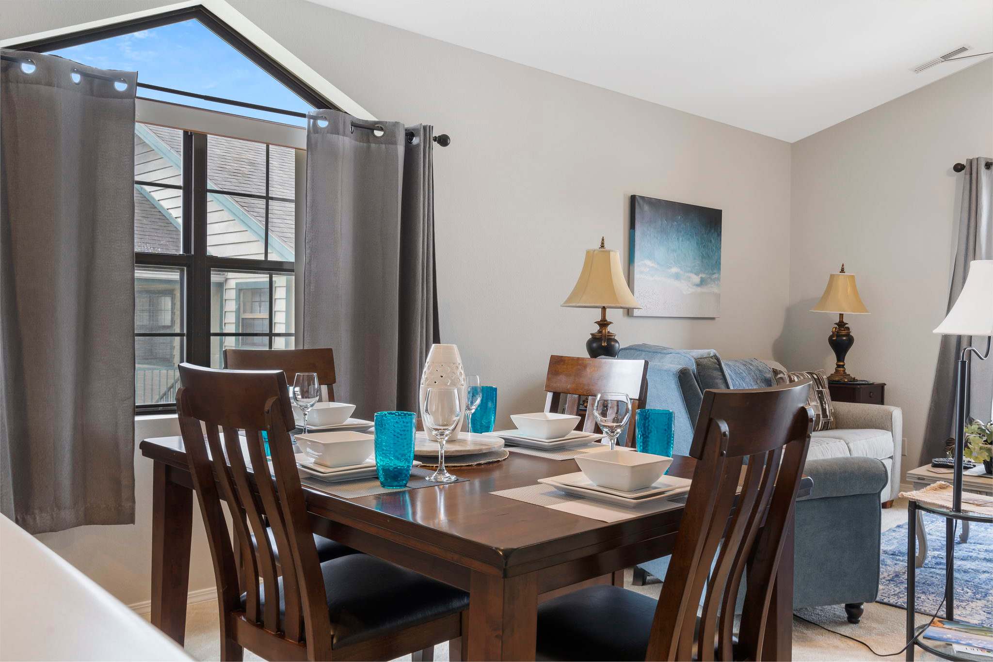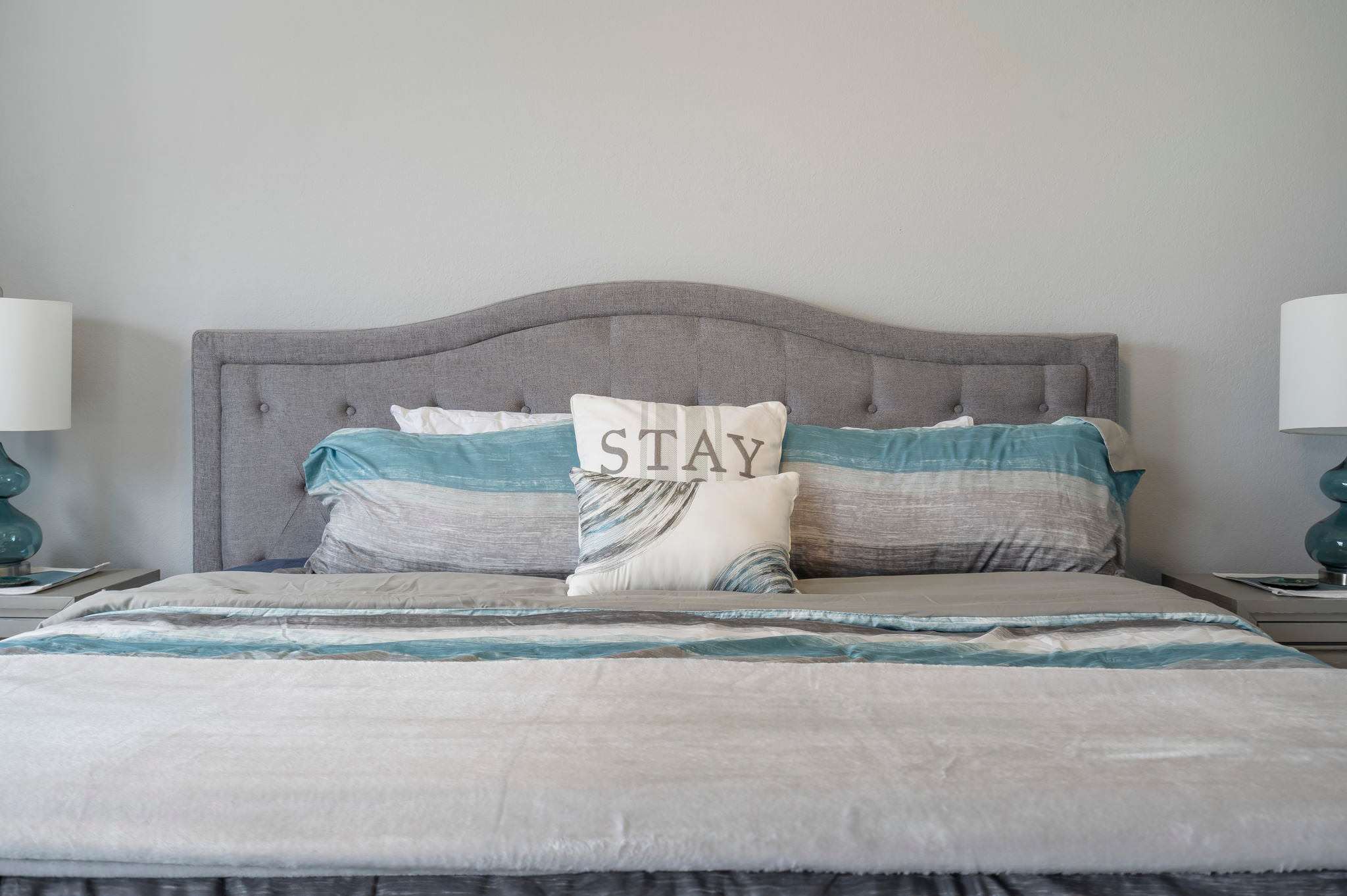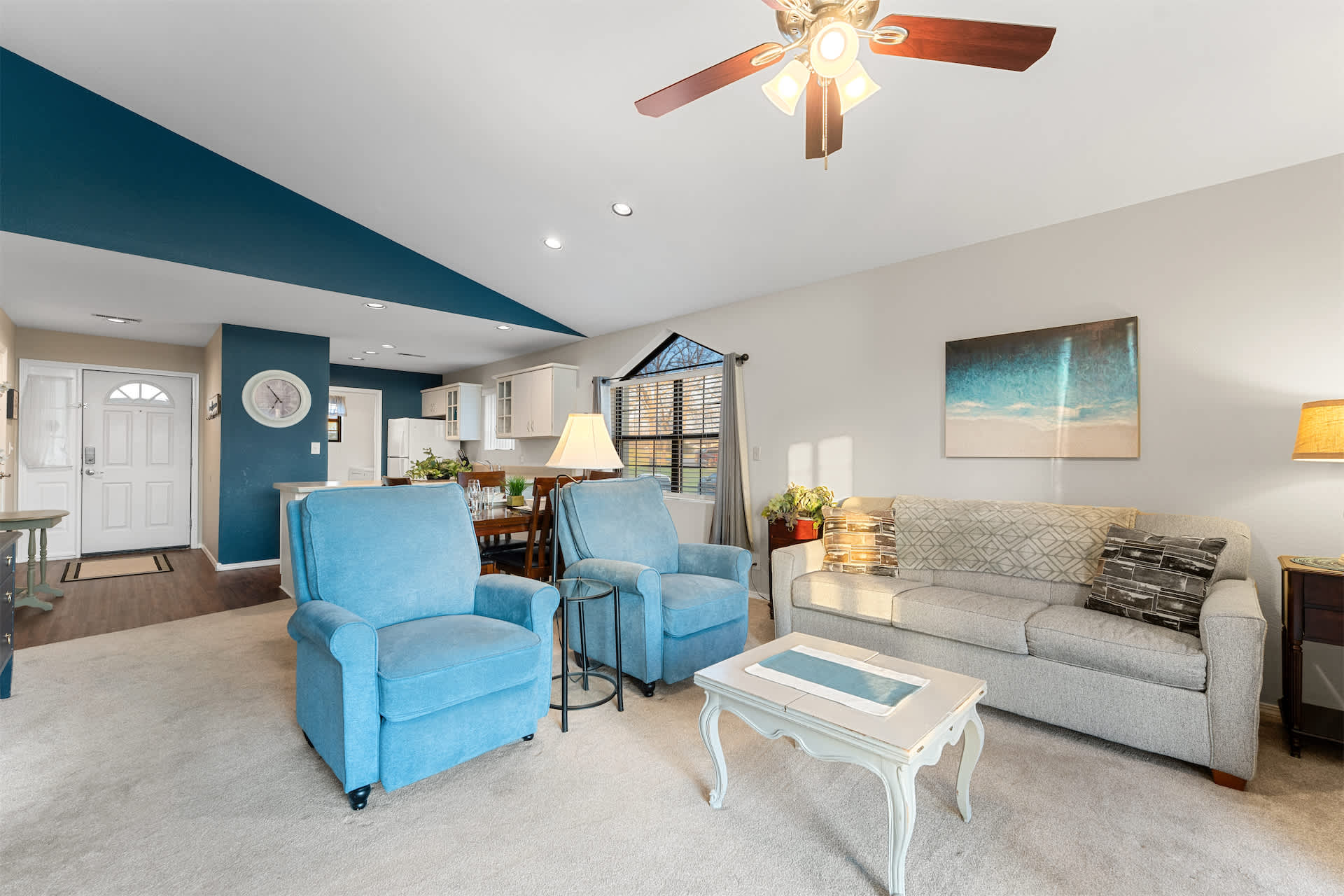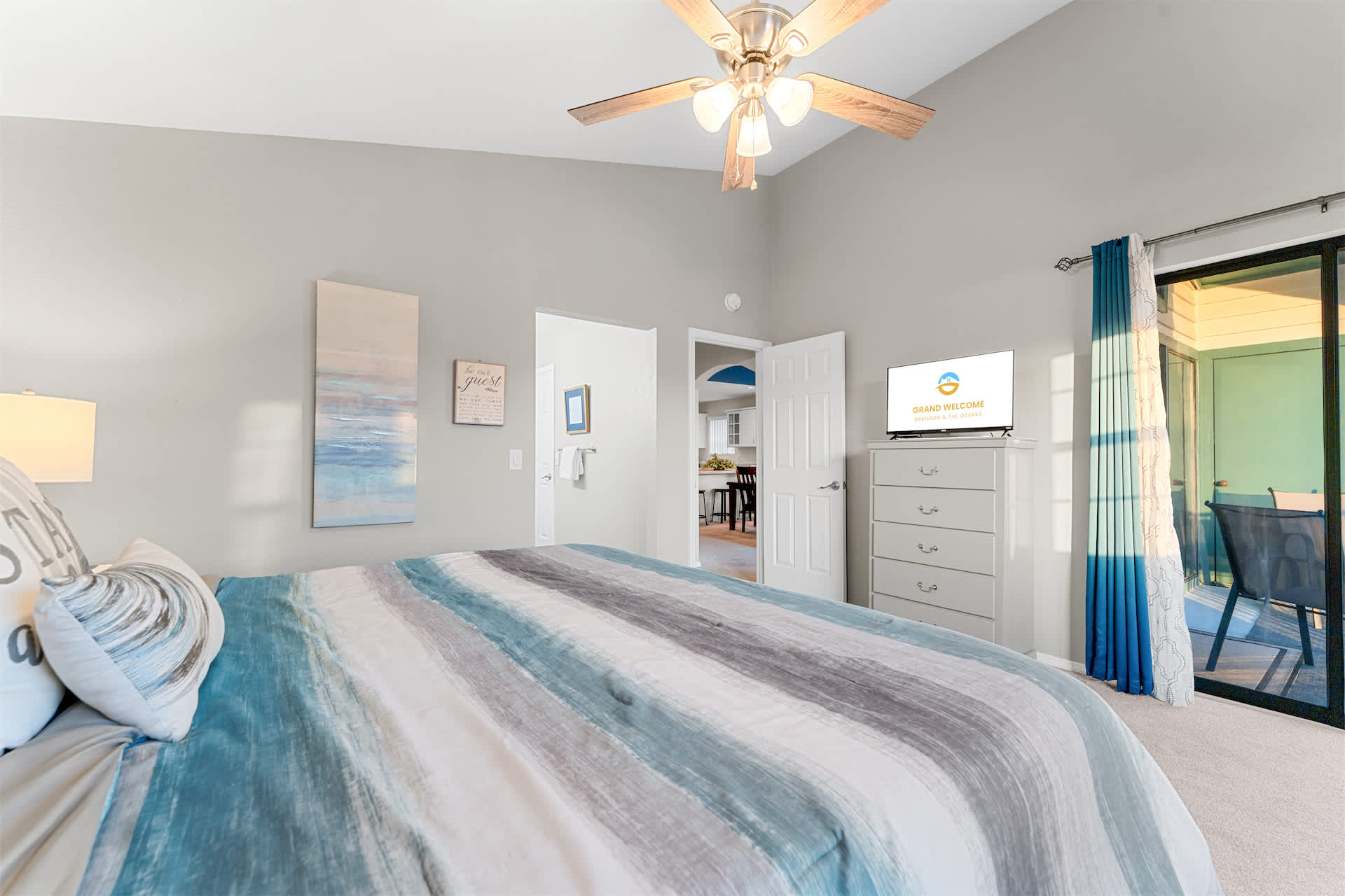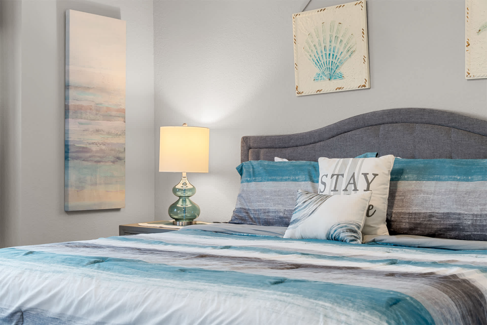 The unit is tastefully decorated with blue hues and pops of yellow promoting a calming and cohesive design throughout.