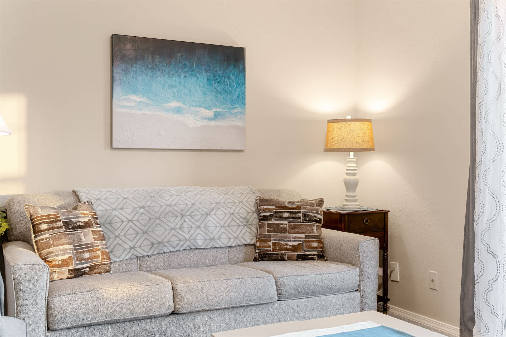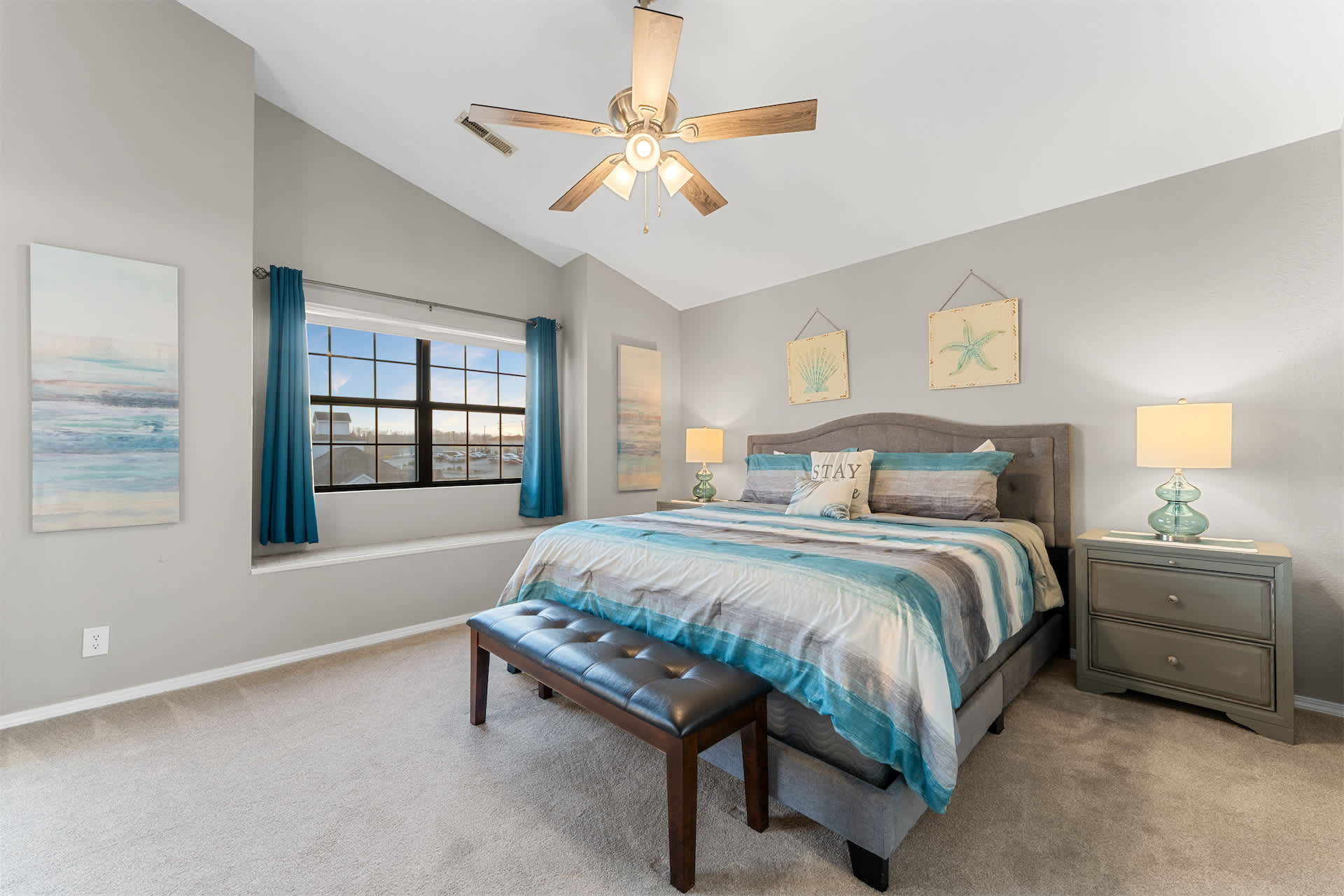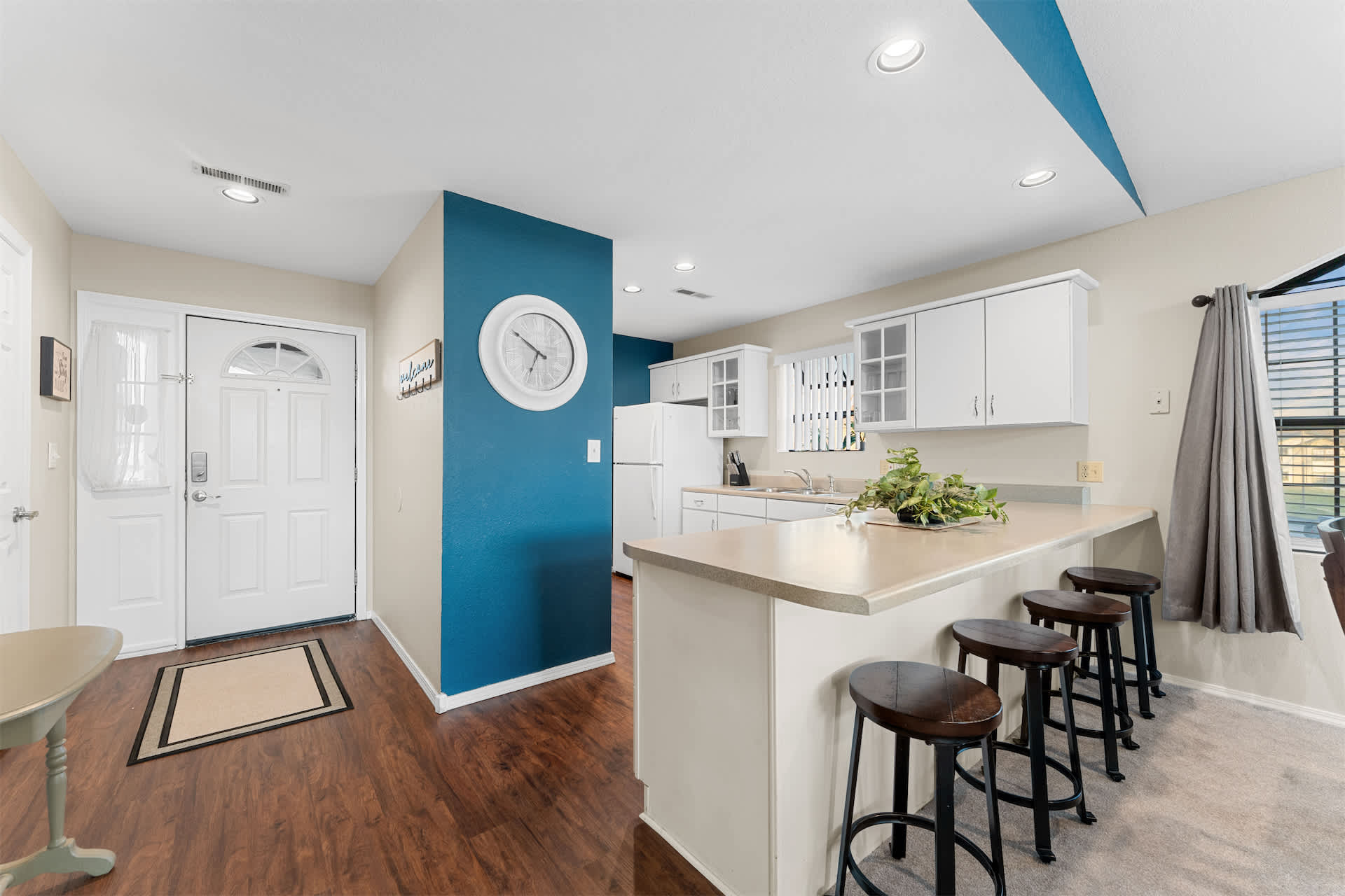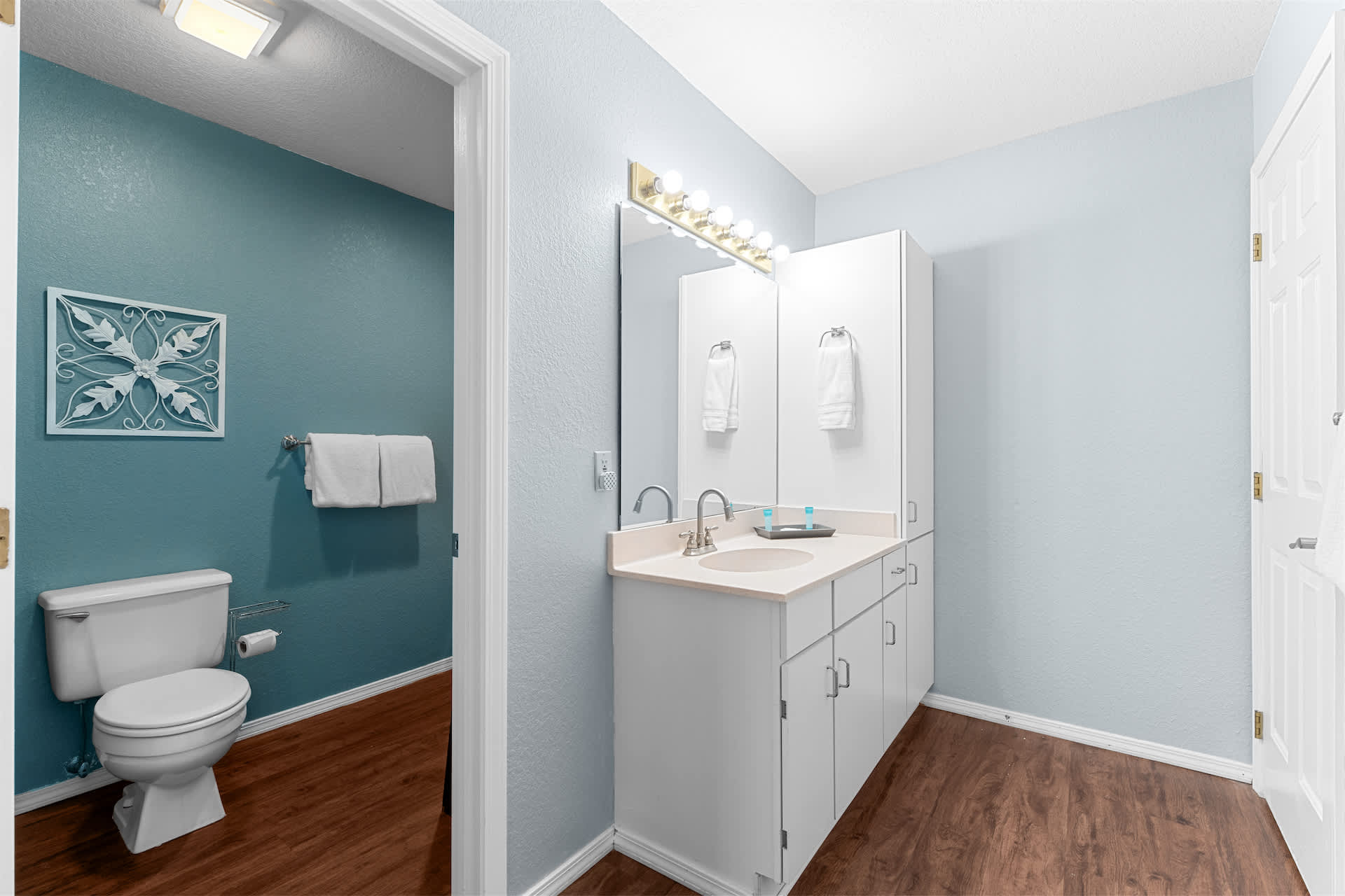 The unit is tastefully decorated with blue hues and pops of yellow promoting a calming and cohesive design throughout.