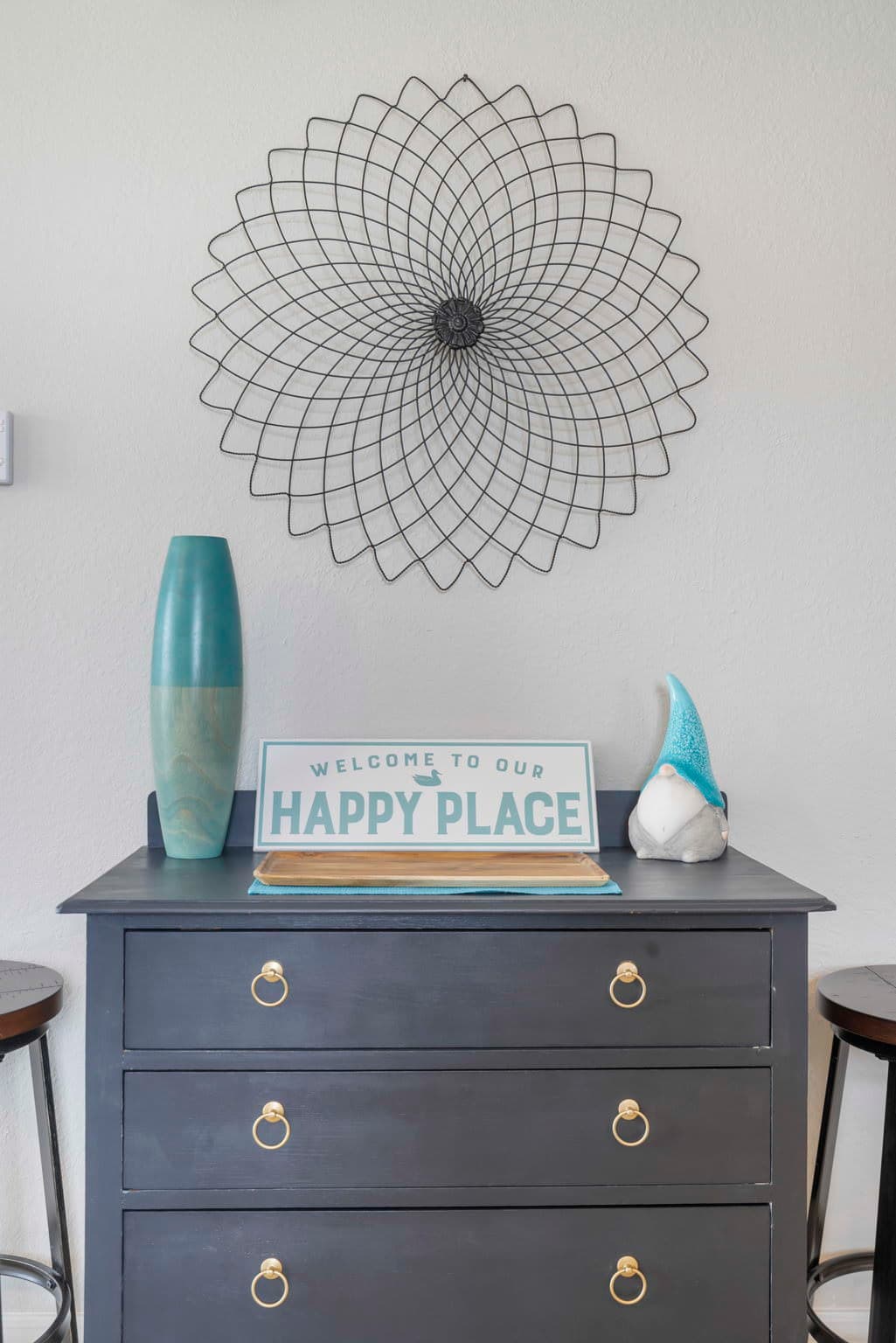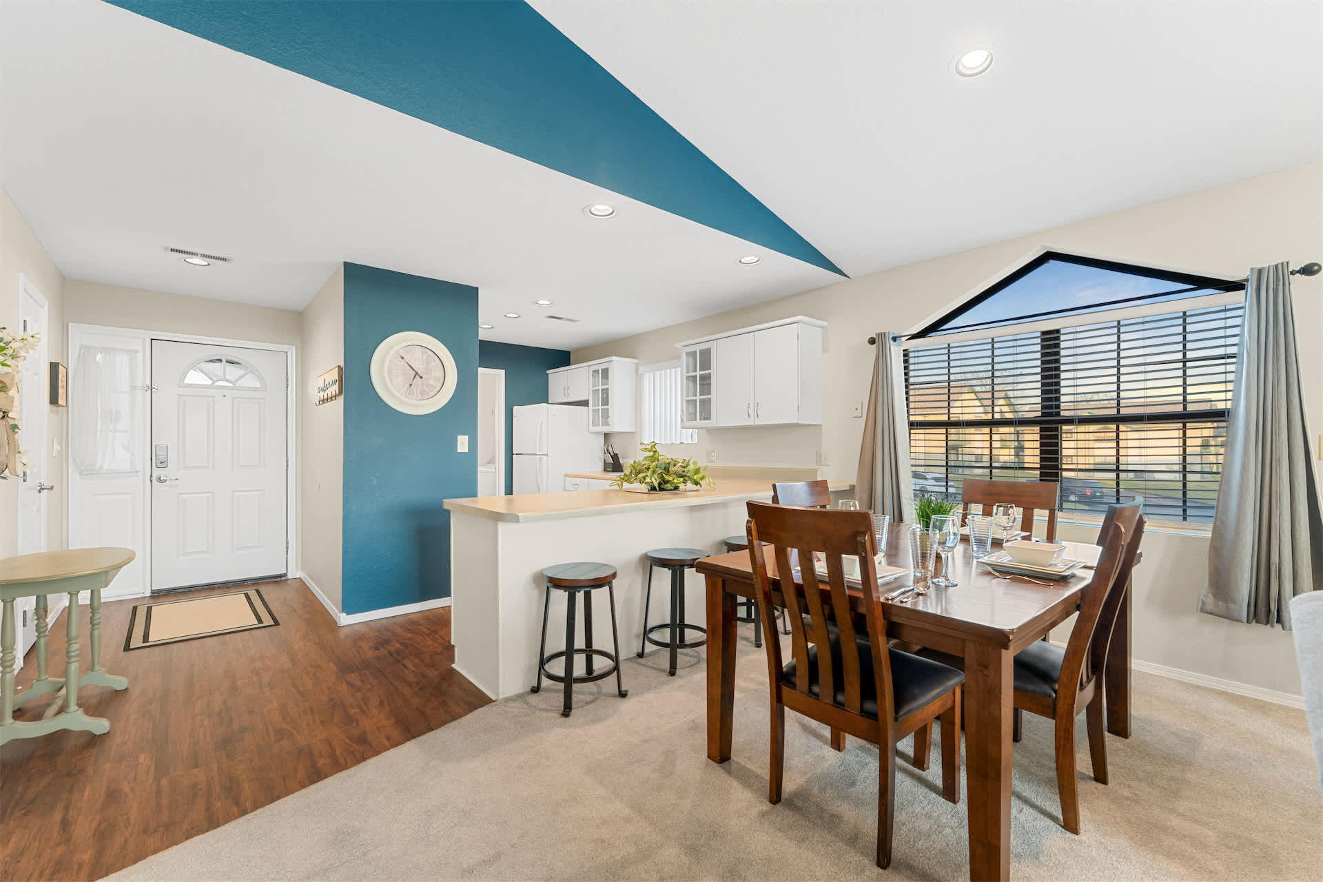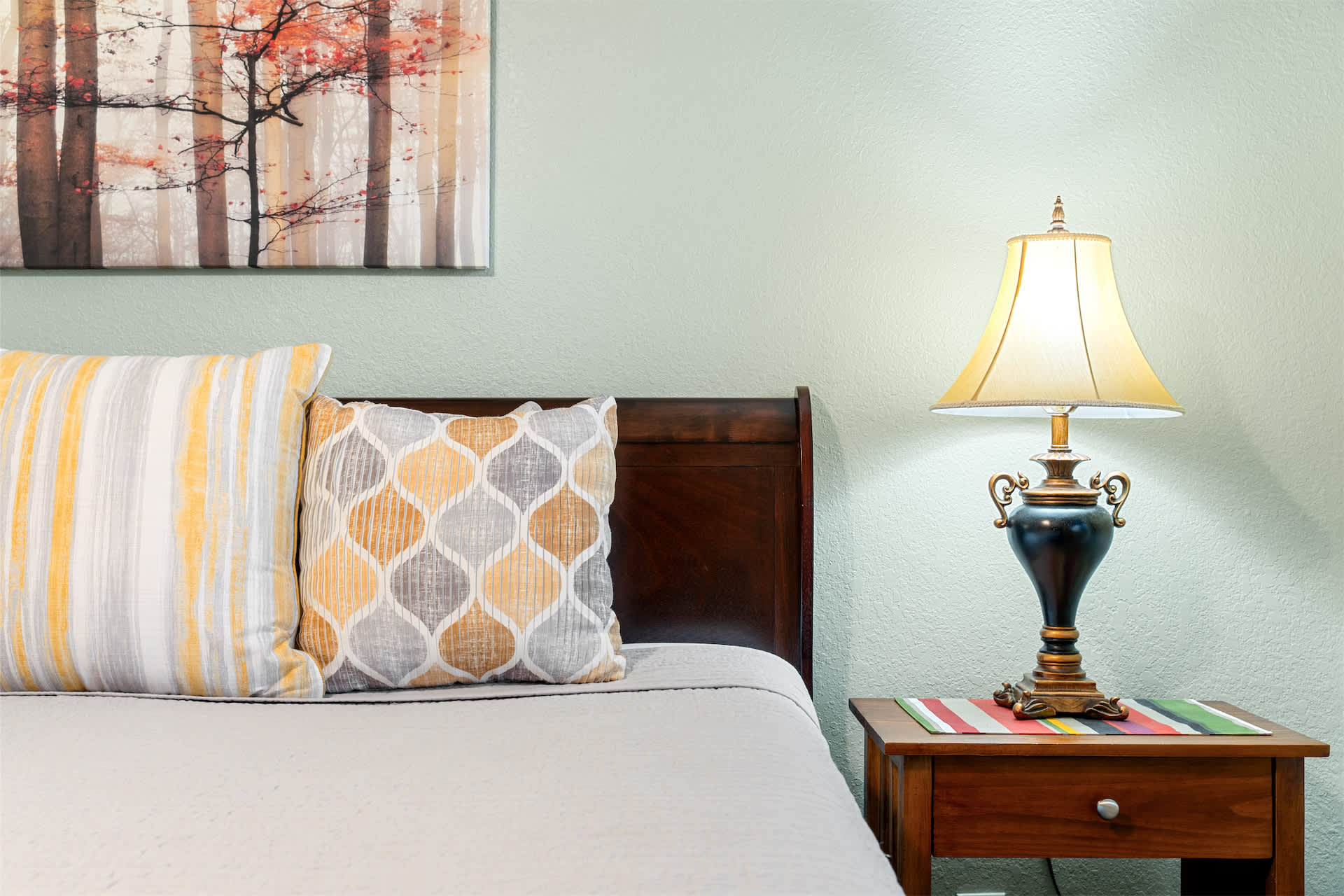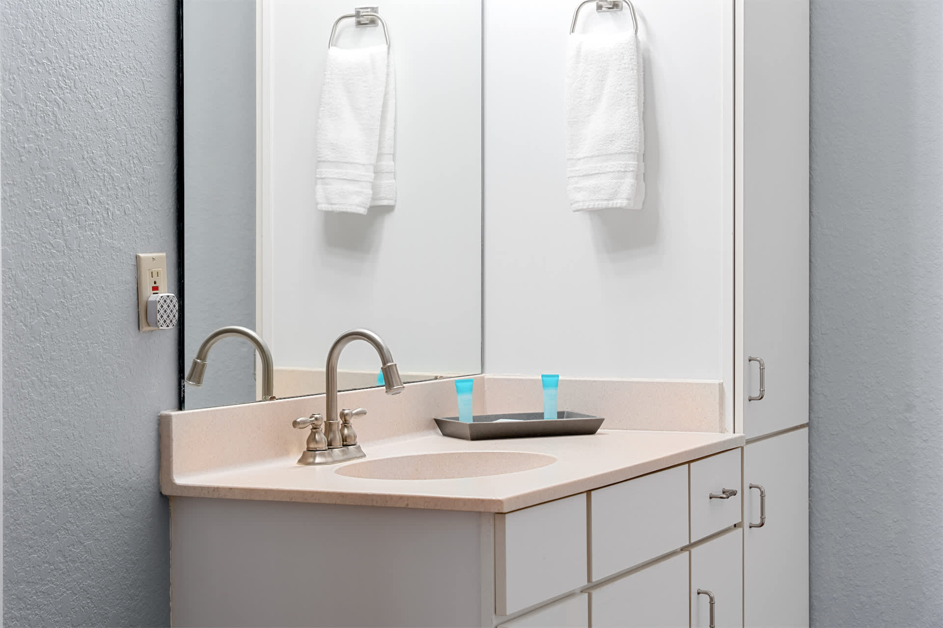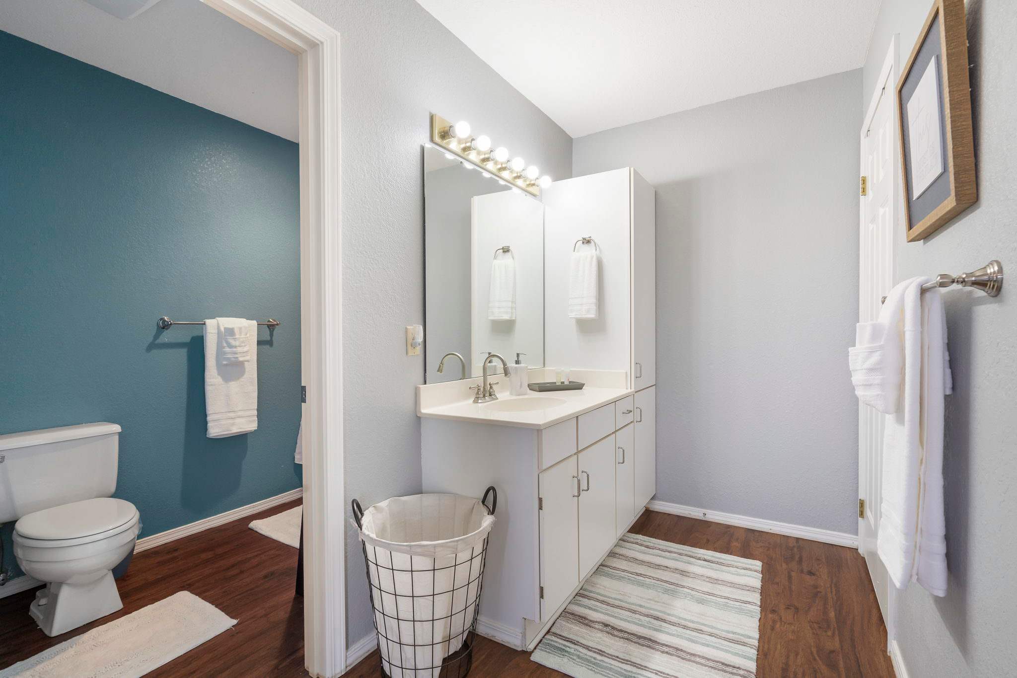 The unit is tastefully decorated with blue hues and pops of yellow promoting a calming and cohesive design throughout.