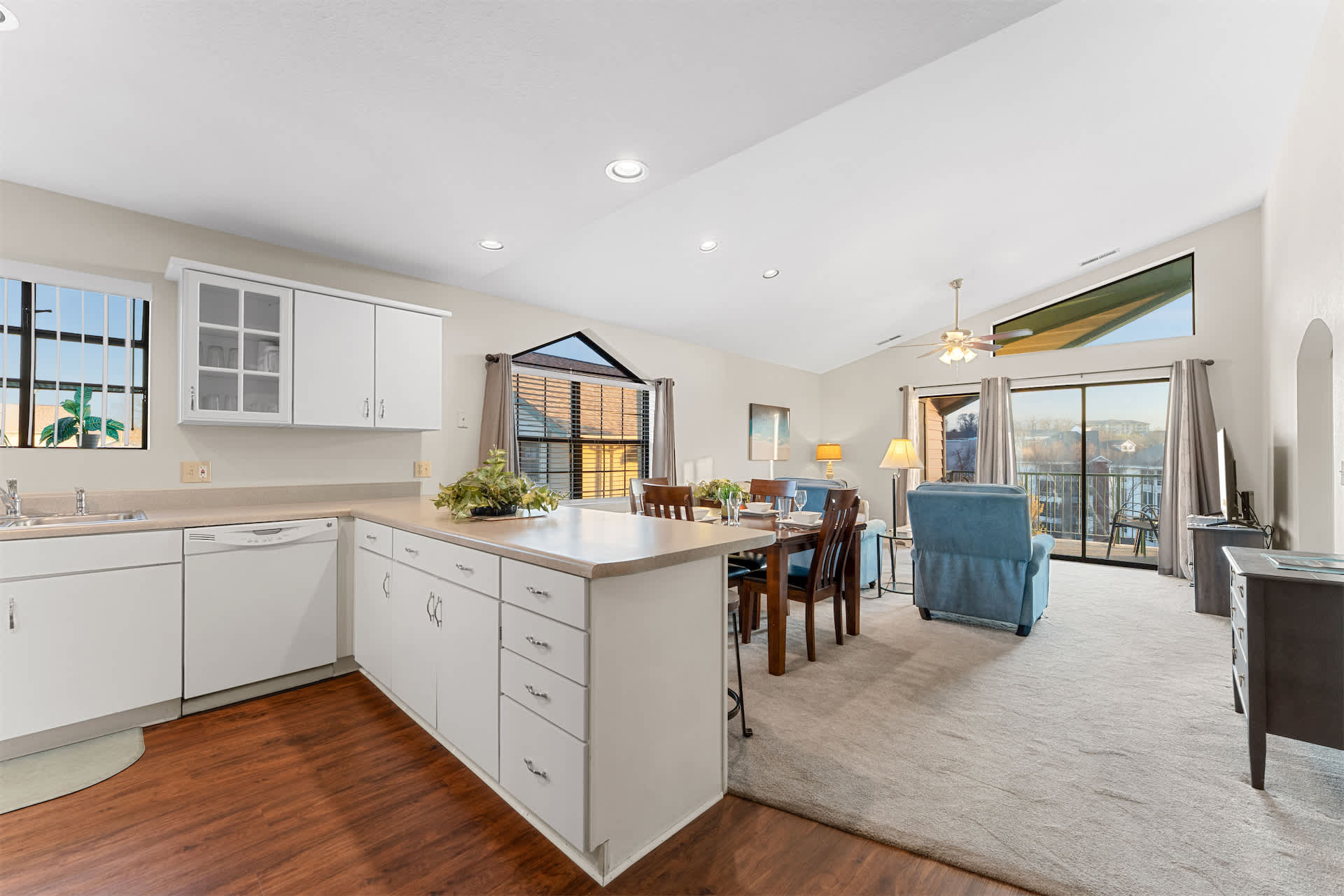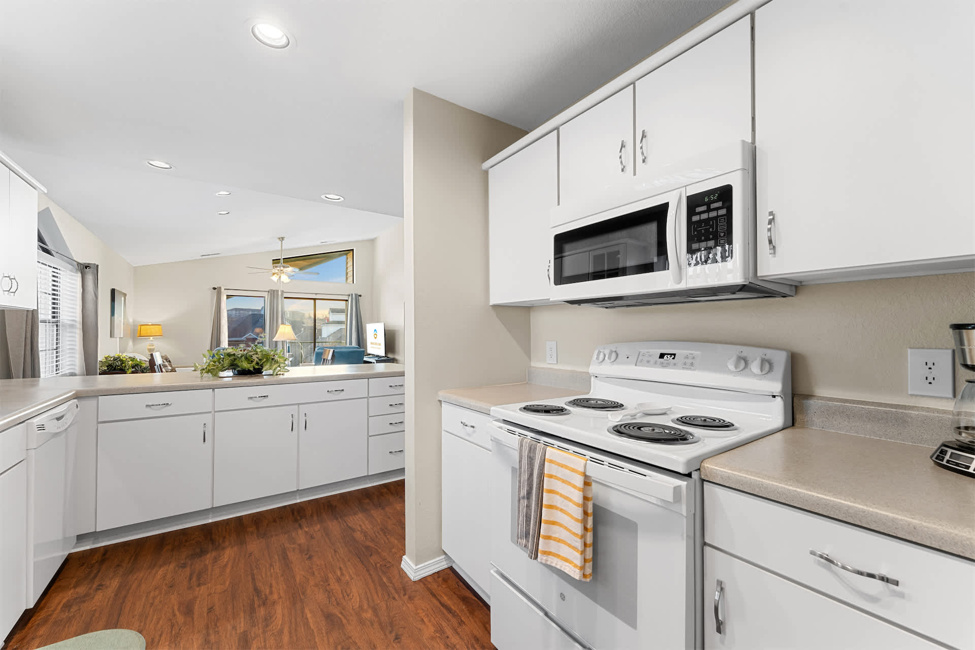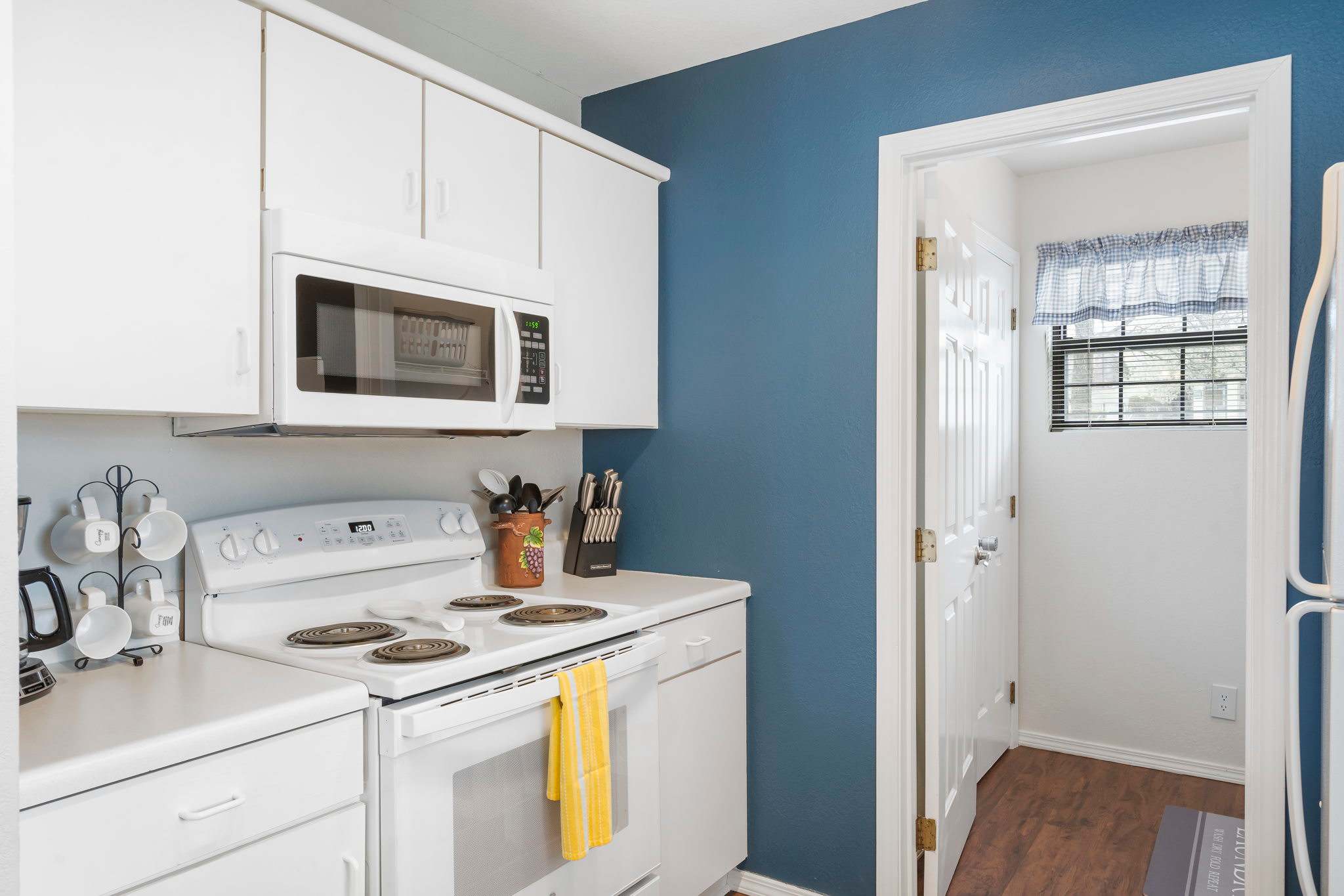 Back inside, the kitchen is well equipped to cook any meal from home. Additional appliances such as a blender, toaster, and coffee maker are available for your convenience. An extended counter is ideal for extra prep space or casual dining. Steps away, enjoy more formal meals together at the dining table for 4 to 6.
