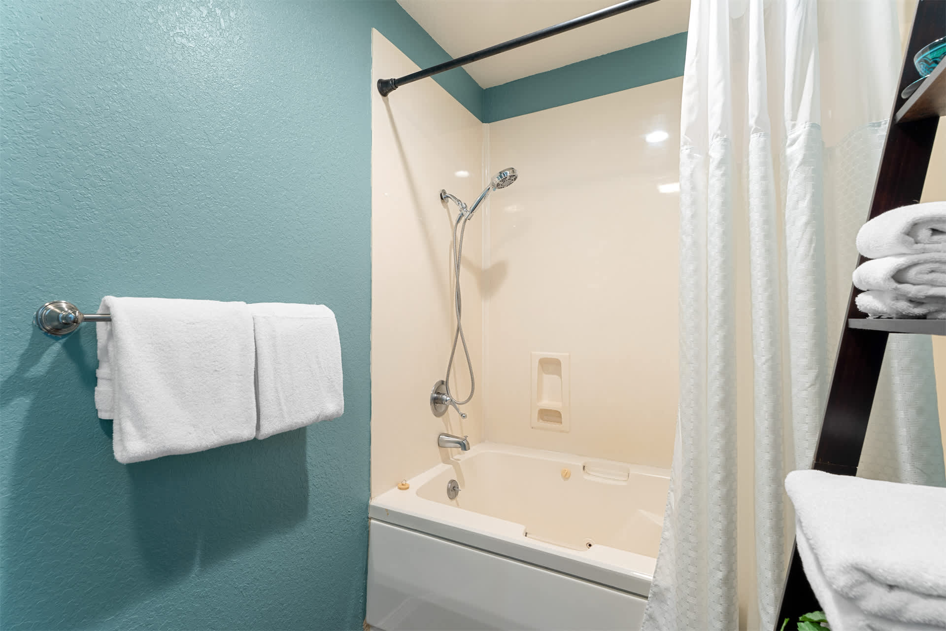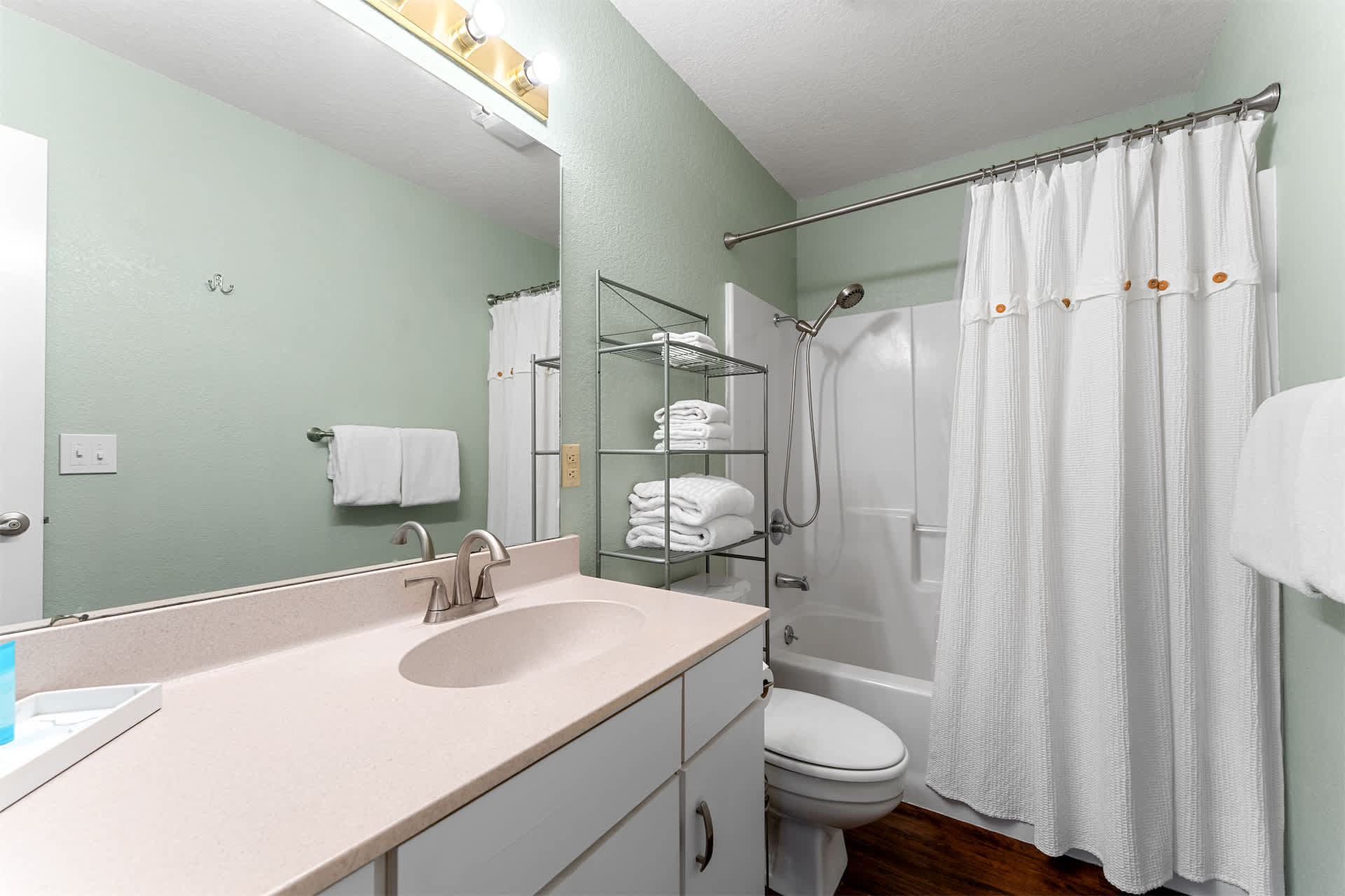 An additional full bathroom with a shower/tub combo is stocked to accommodate guests.