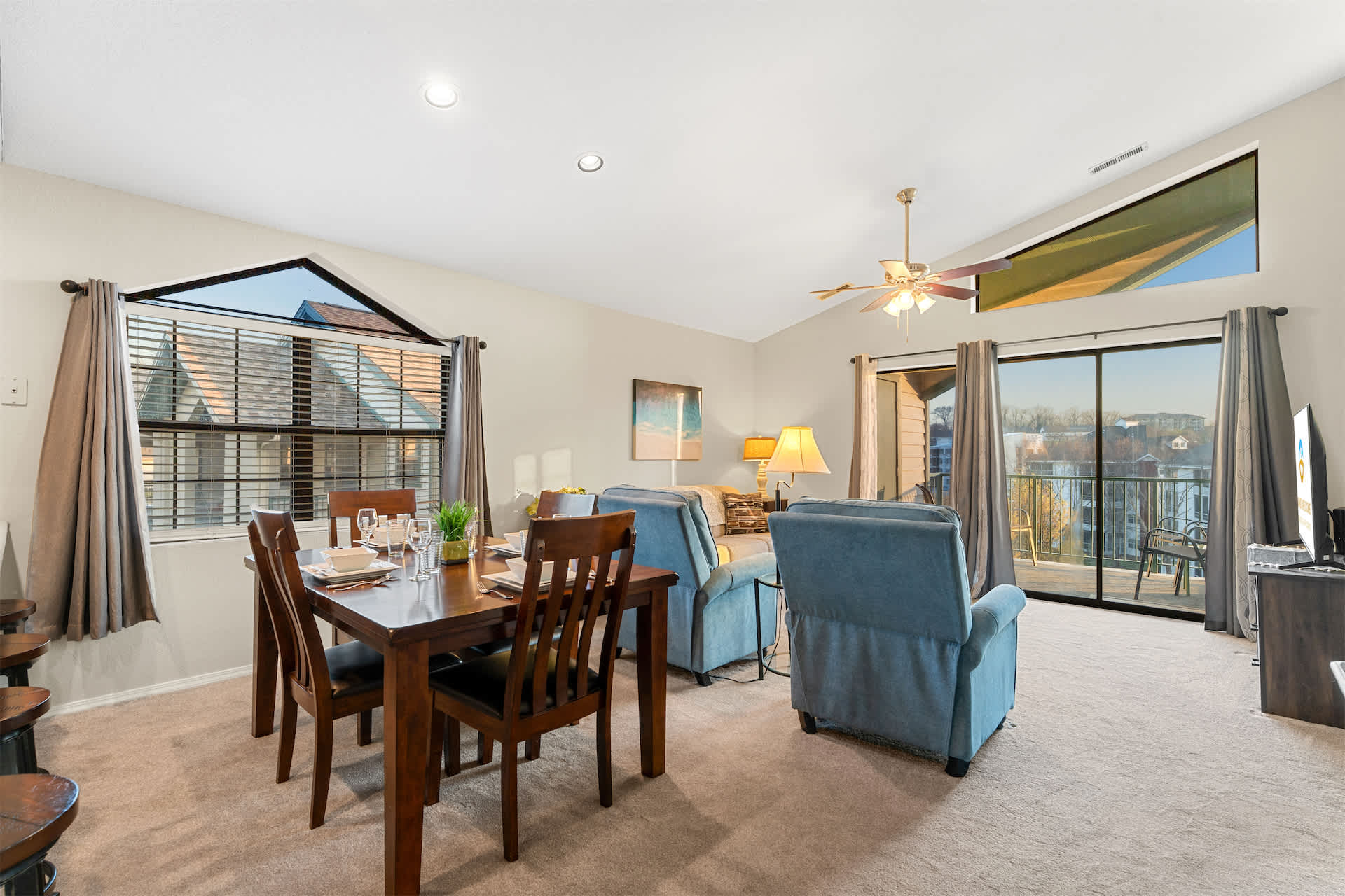 The open living space welcomes beams of natural light from the floor-to-ceiling windows on the exterior wall. The space also features a Queen-size sofa sleeper, TV, and access to the outside balcony. The balcony with a partial view of the golf course offers patio furniture to enjoy the fresh breeze - a perfect space for a morning brew.
