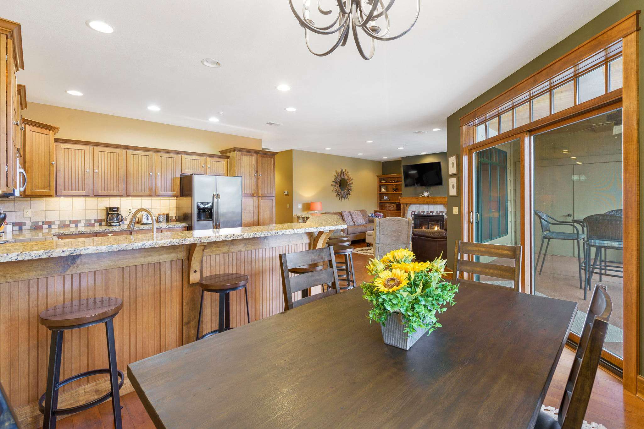 Curl up in front of the fireplace or relax on the deck to enjoy stunning lake views with family and friends. Inside, the living room boasts a TV equipped with cable, and deck access. A cozy bay window with bench seating overlooks the peaceful lake.