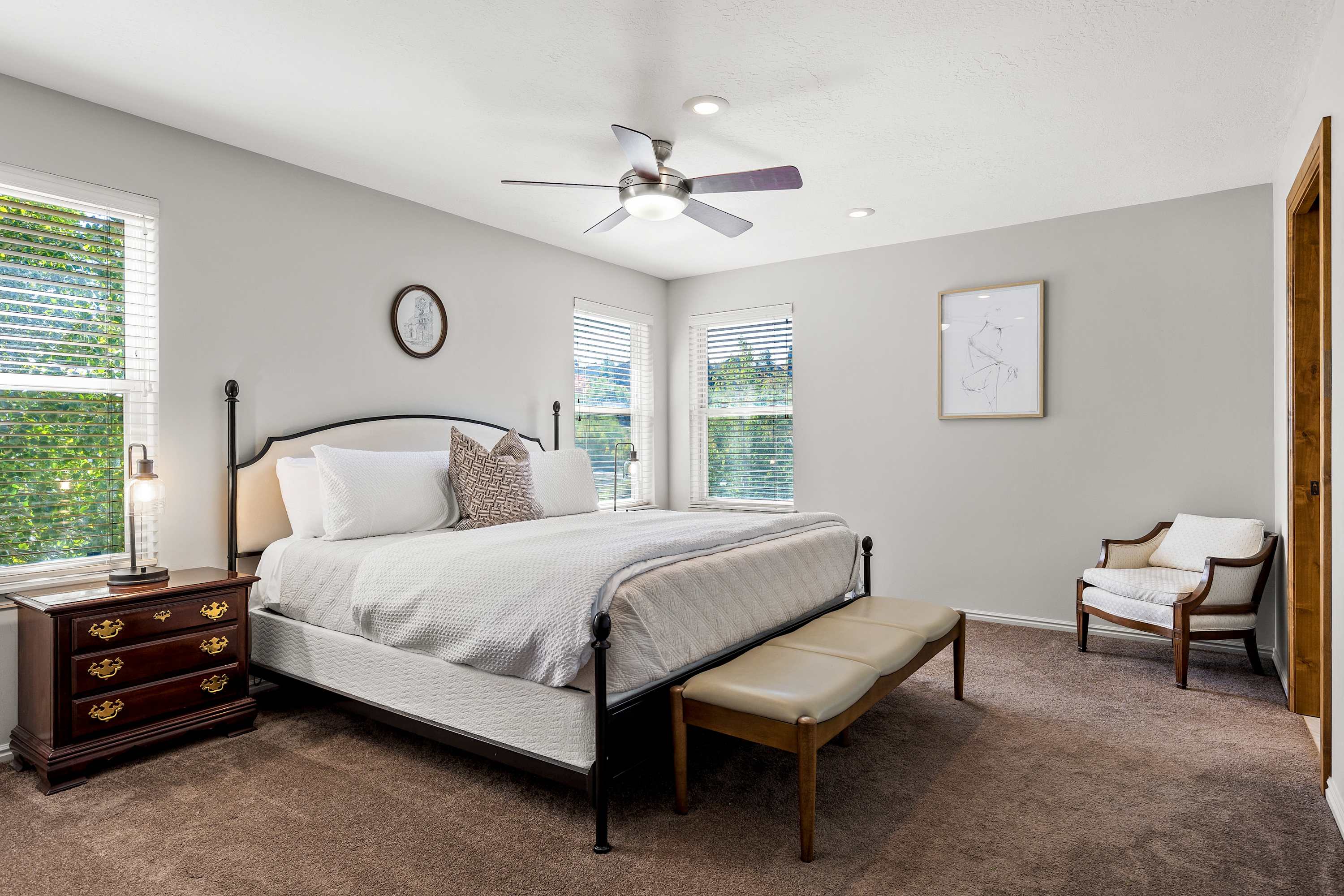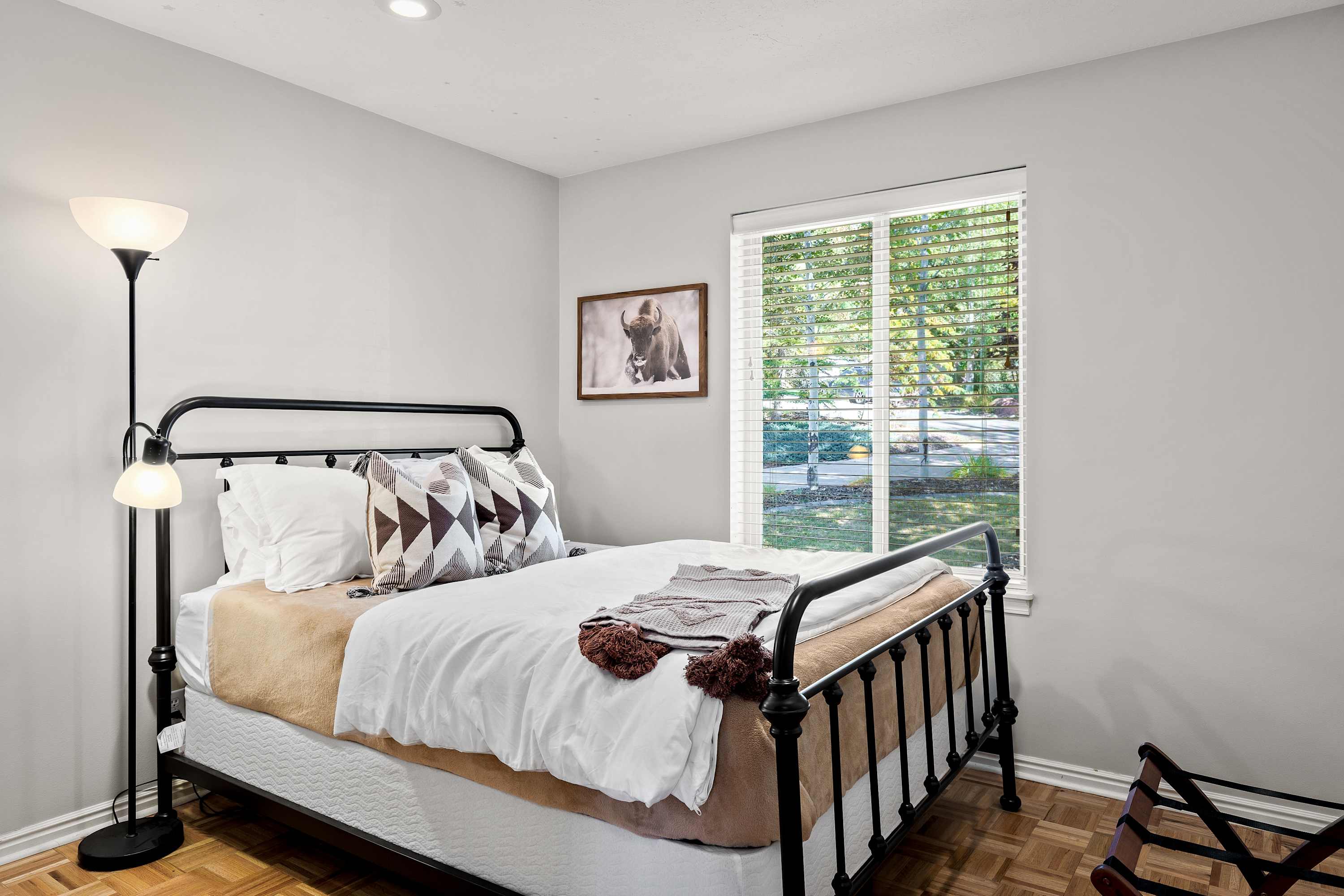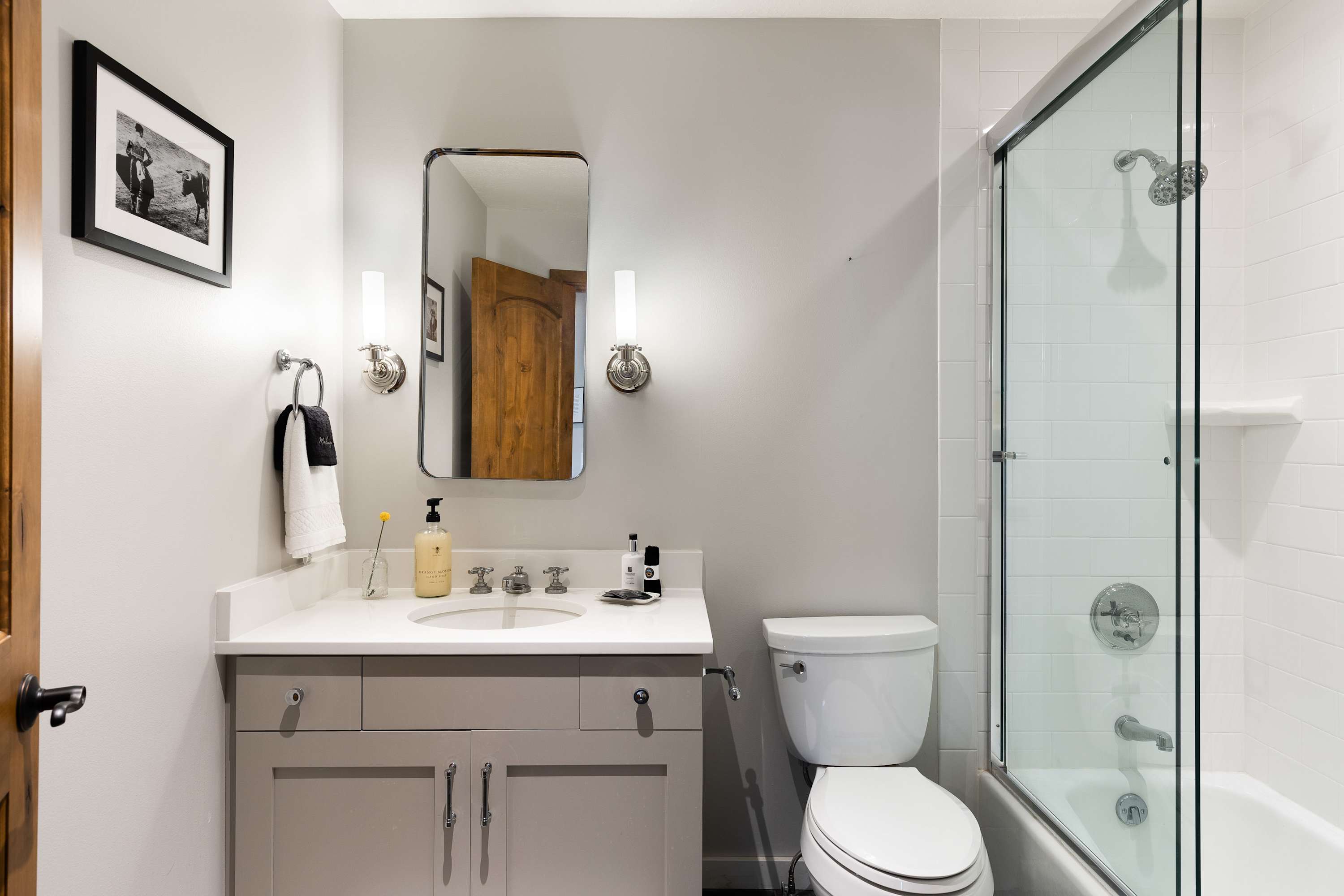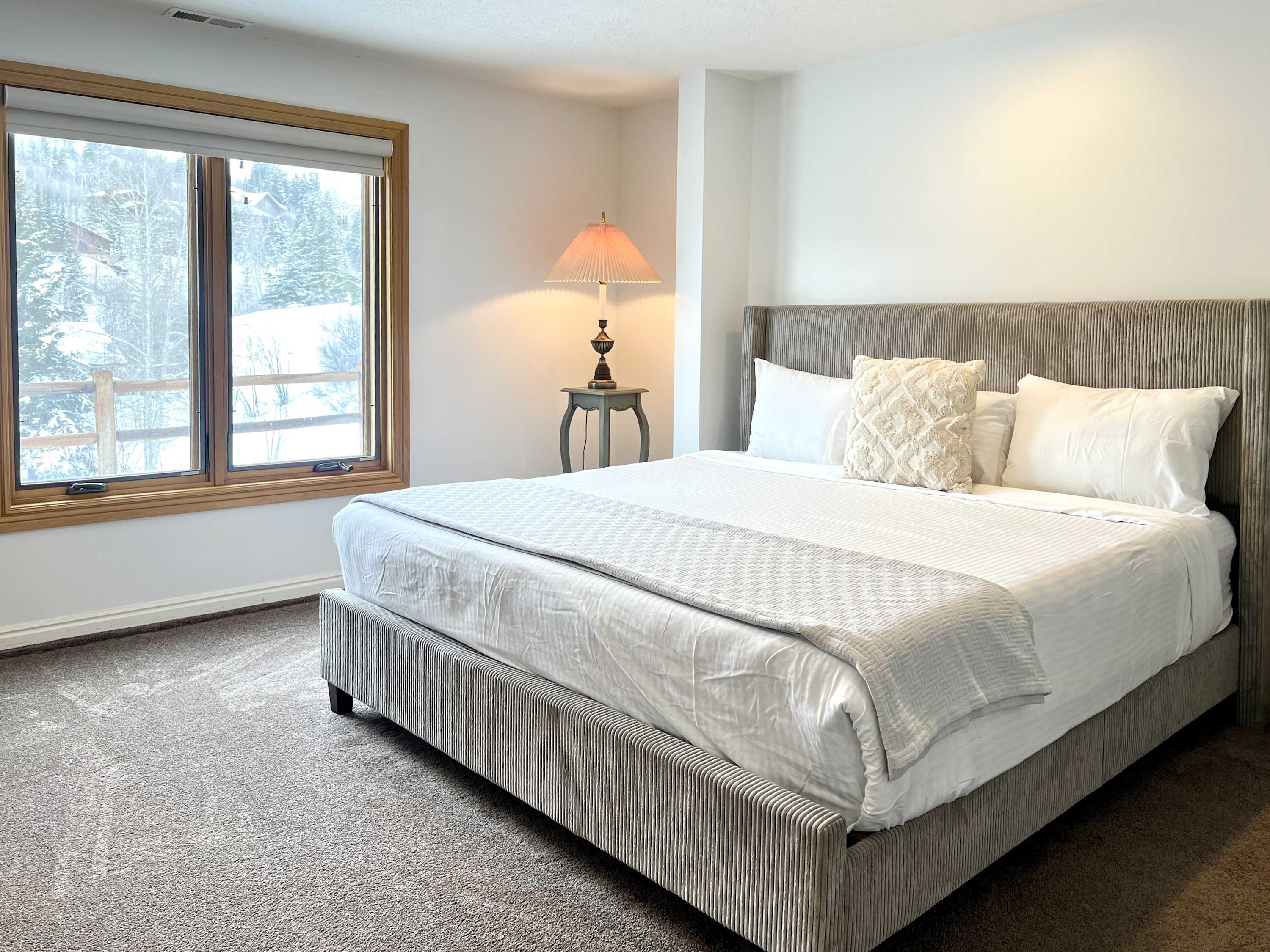 Back upstairs you finally get a chance to check out the Master bedroom with its comfy king bed and flooded with natural light. The Master boasts a magnificent En-suite Bathroom featuring tasteful rusting finishes, double-sinks, and a stunning oversized walk-in shower with bright subway tiles. On the main level there are two more cozy Queen Bedrooms across from another full bathroom with shower tub combo.