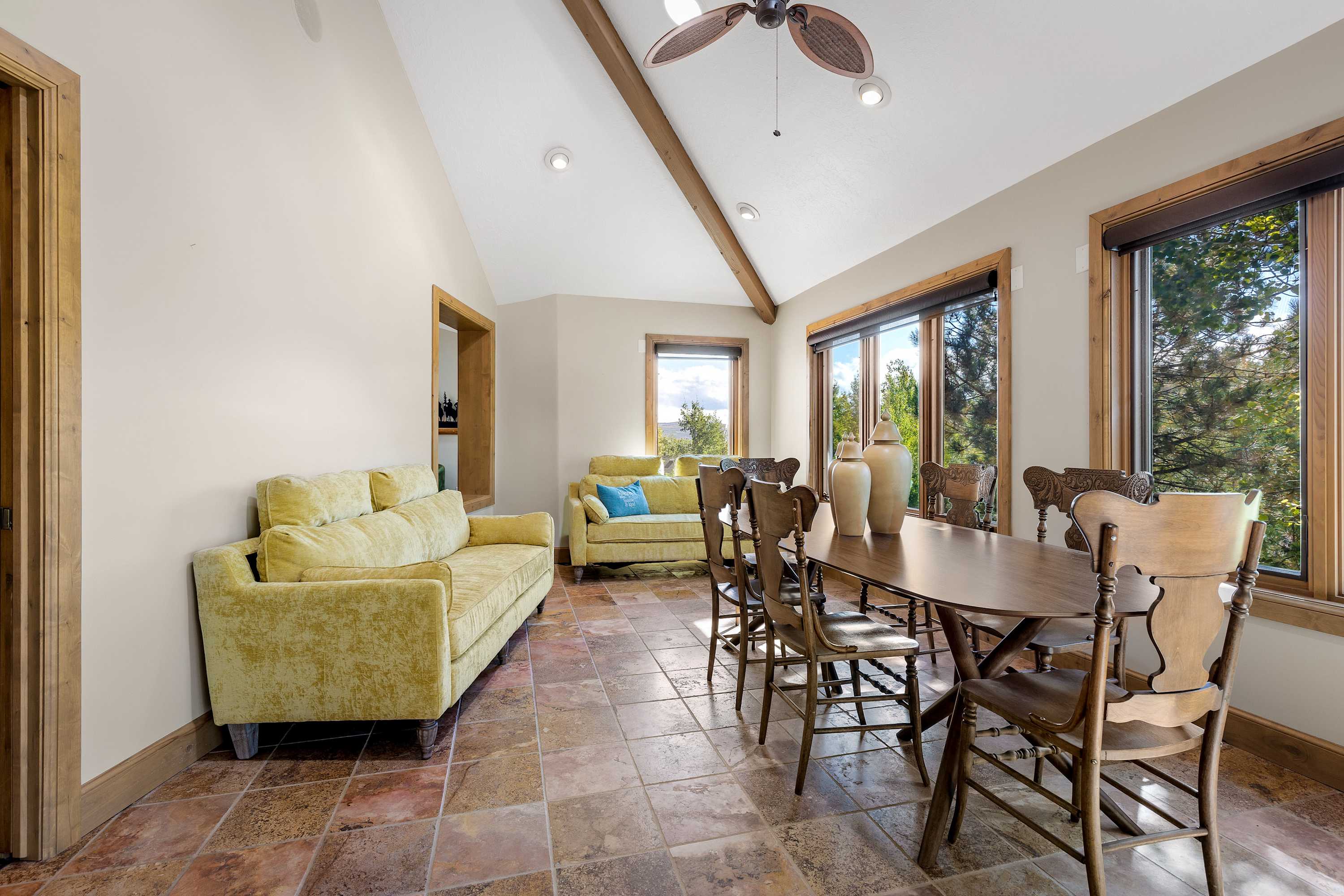 If collapsing on a comfy couch in front of the fire with a movie book or beverage is more your style, we got you covered. There is a large living room with a see-through fireplace, TV, and lots of windows. On the other side of the fireplace is the dining room where the warm morning light welcomes you to a new day while sipping on your morning coffee at the oversized dining table, with enough space to feed the whole crew before hitting the slopes!