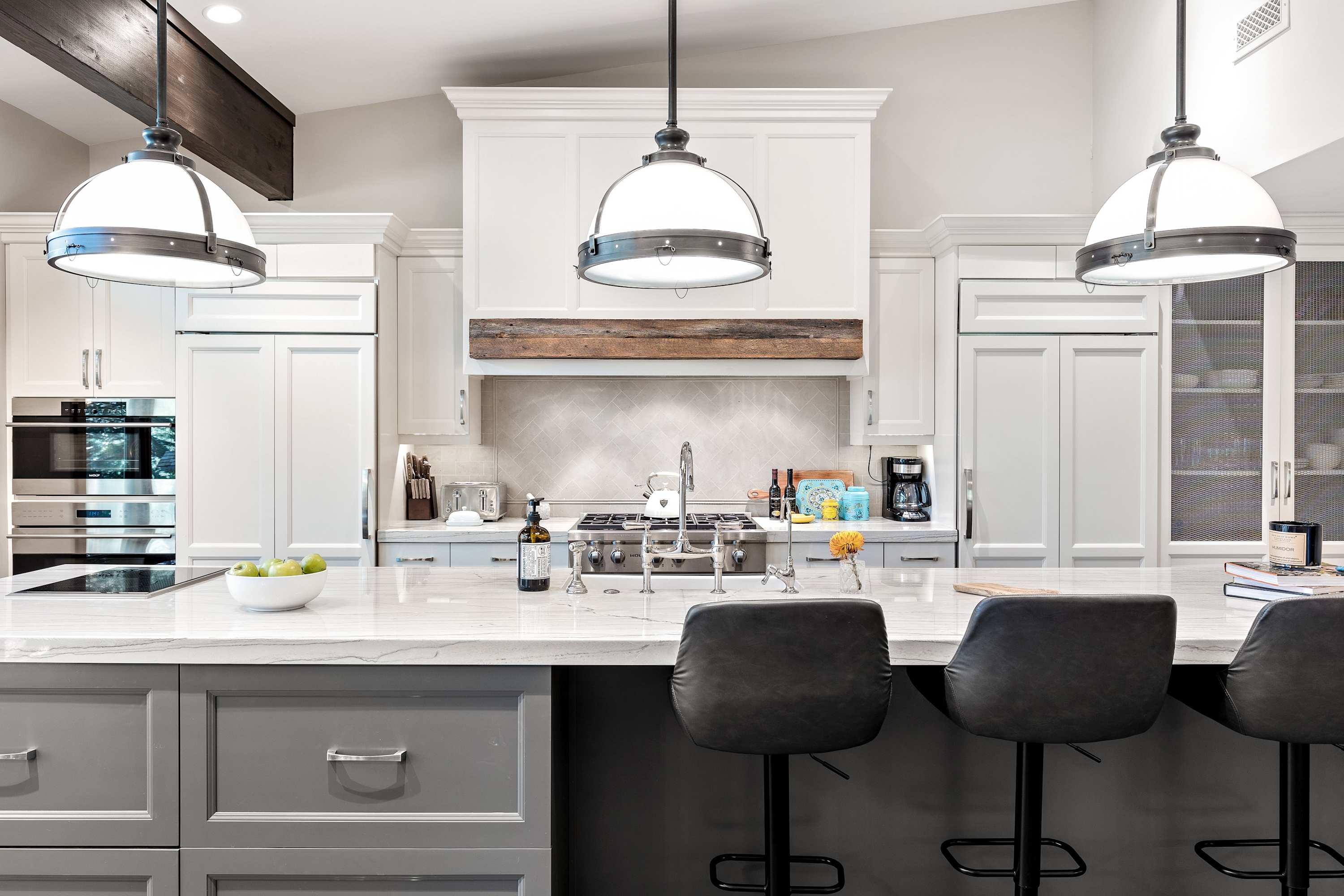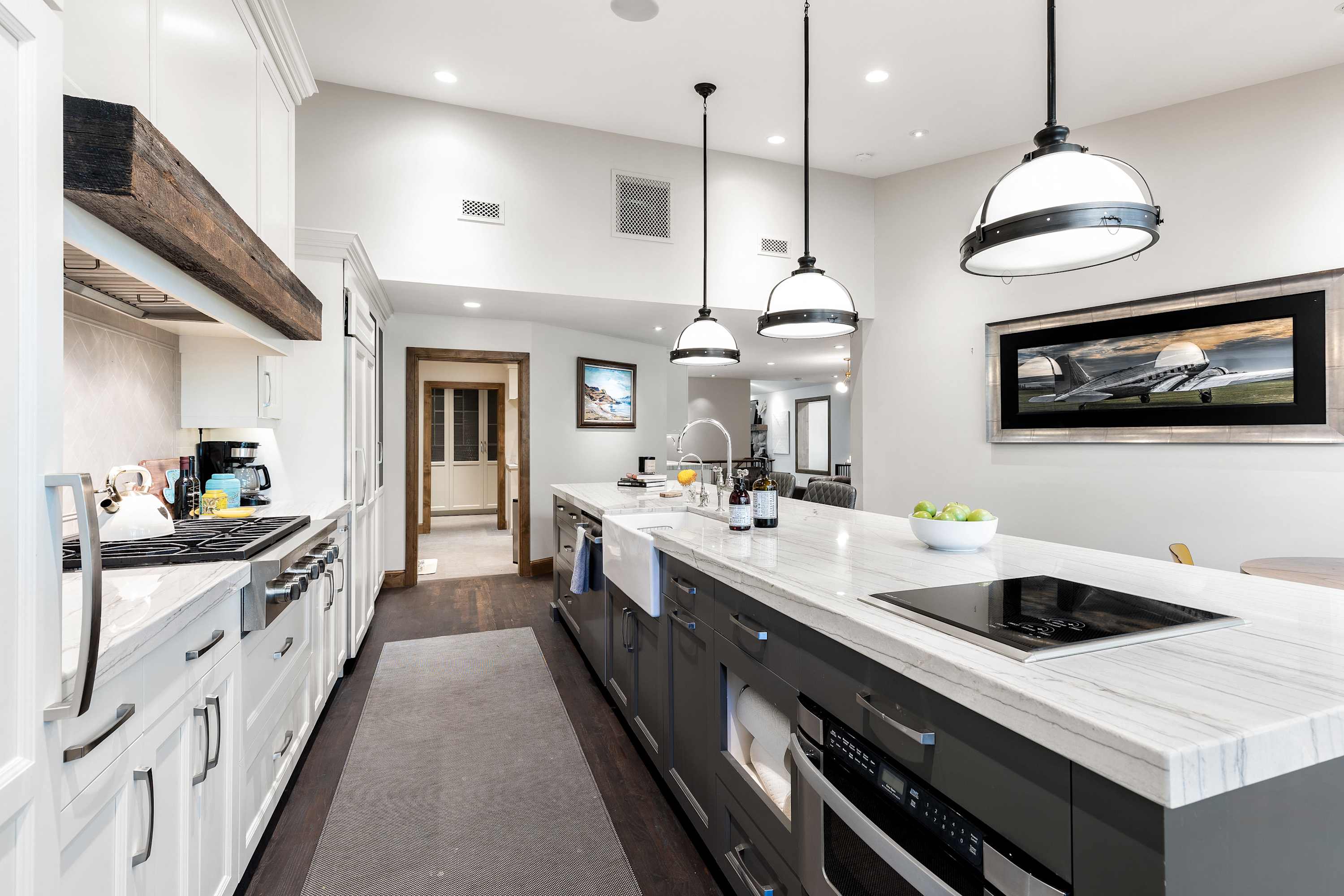 You decide to take a right and check out the ultra-convenient mudroom leading from the garage, with ample storage and seating to store, and change in-and-out of that snow gear. As you keep going you discover the magnificent chef’s kitchen, fully loaded, and featuring a lovely breakfast nook with large windows, flooding the area in natural light as you grab a front seat to the snow falling outside.