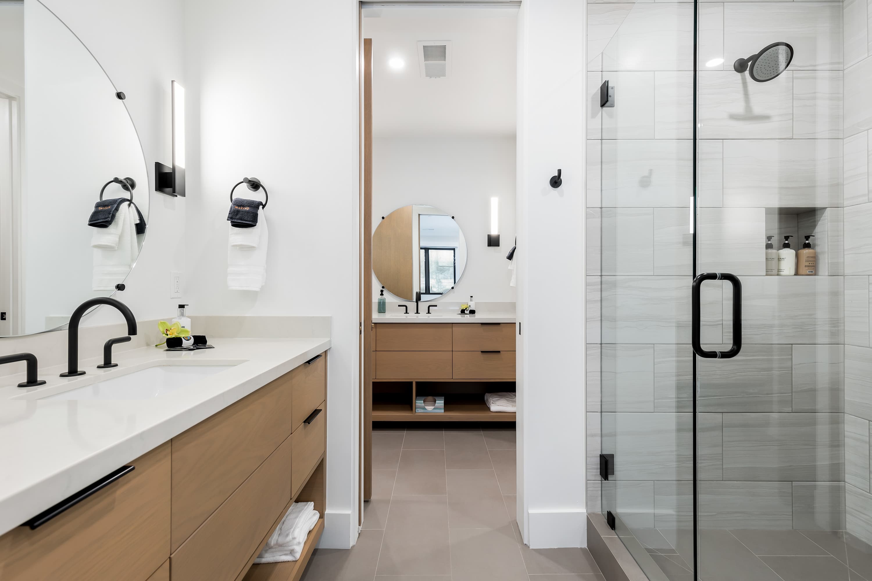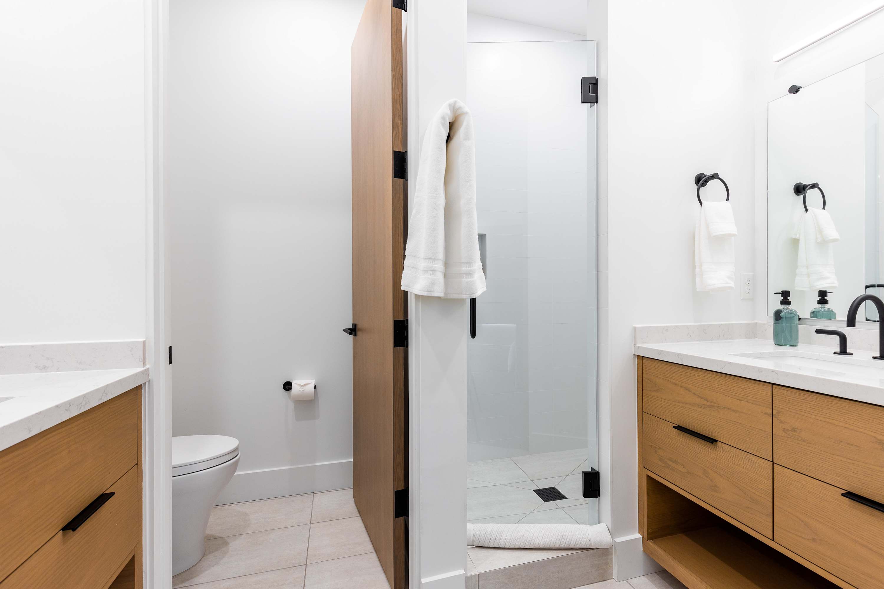 Main Level: Bedroom 4 features a full-size day bed and a large ensuite bathroom with two vanities and a glass shower. A half bath and a mudroom for gear storage are also on this level.