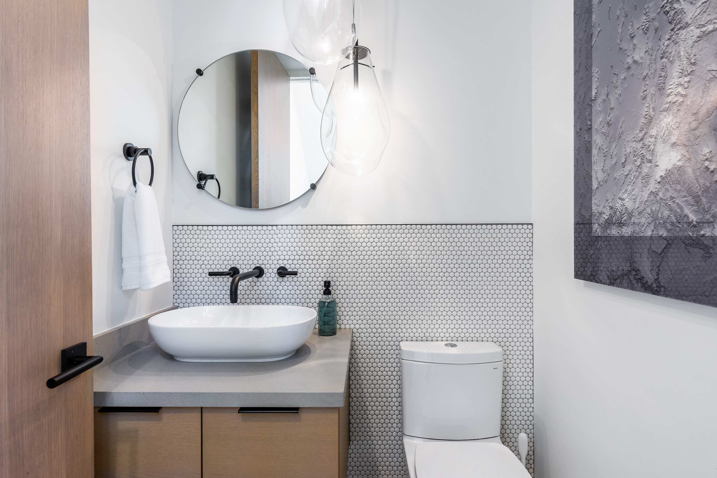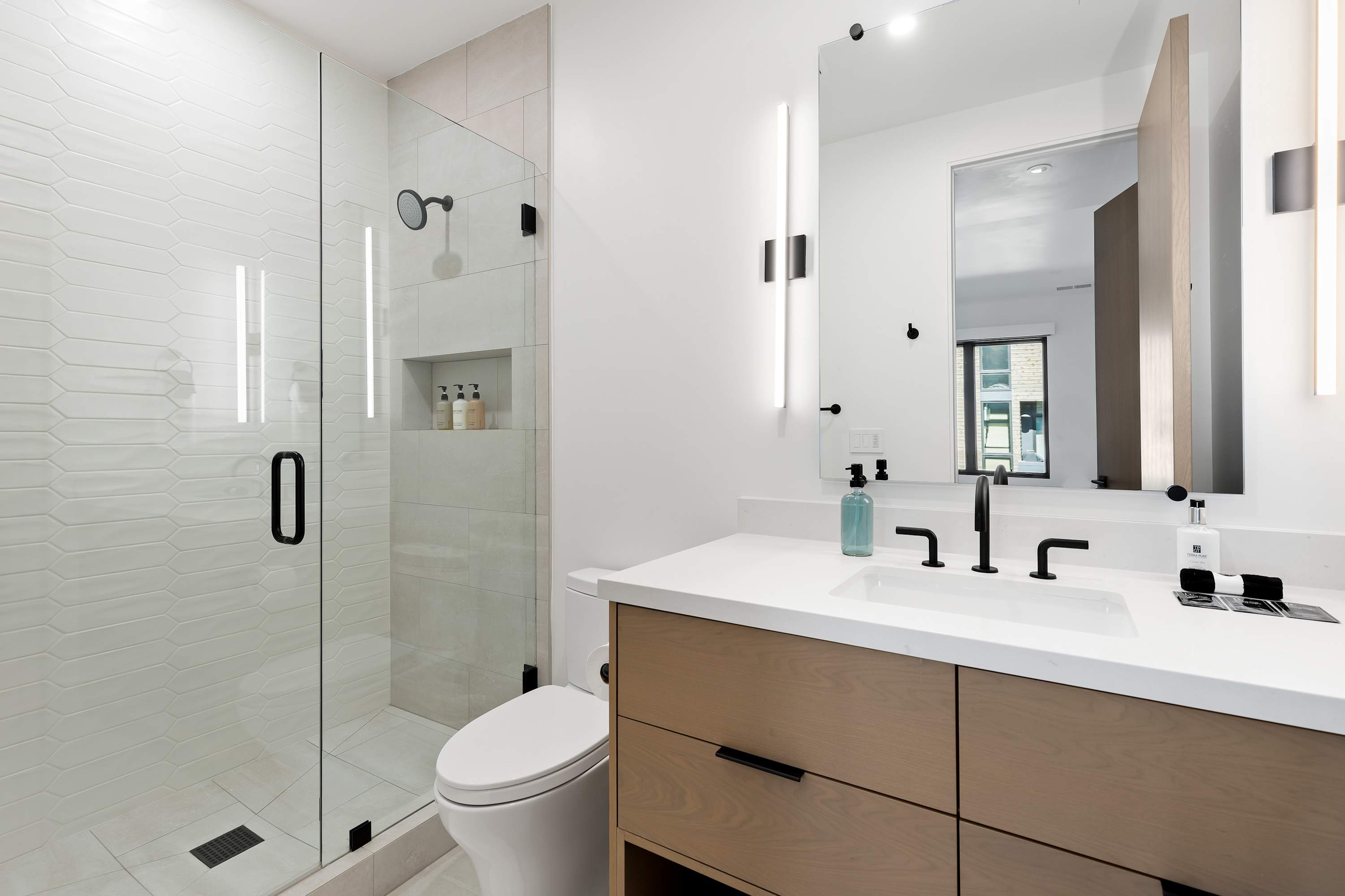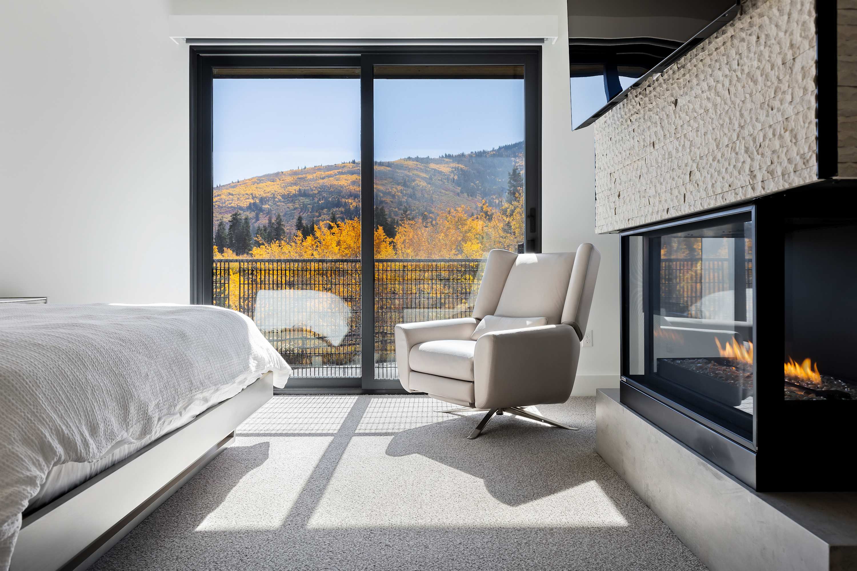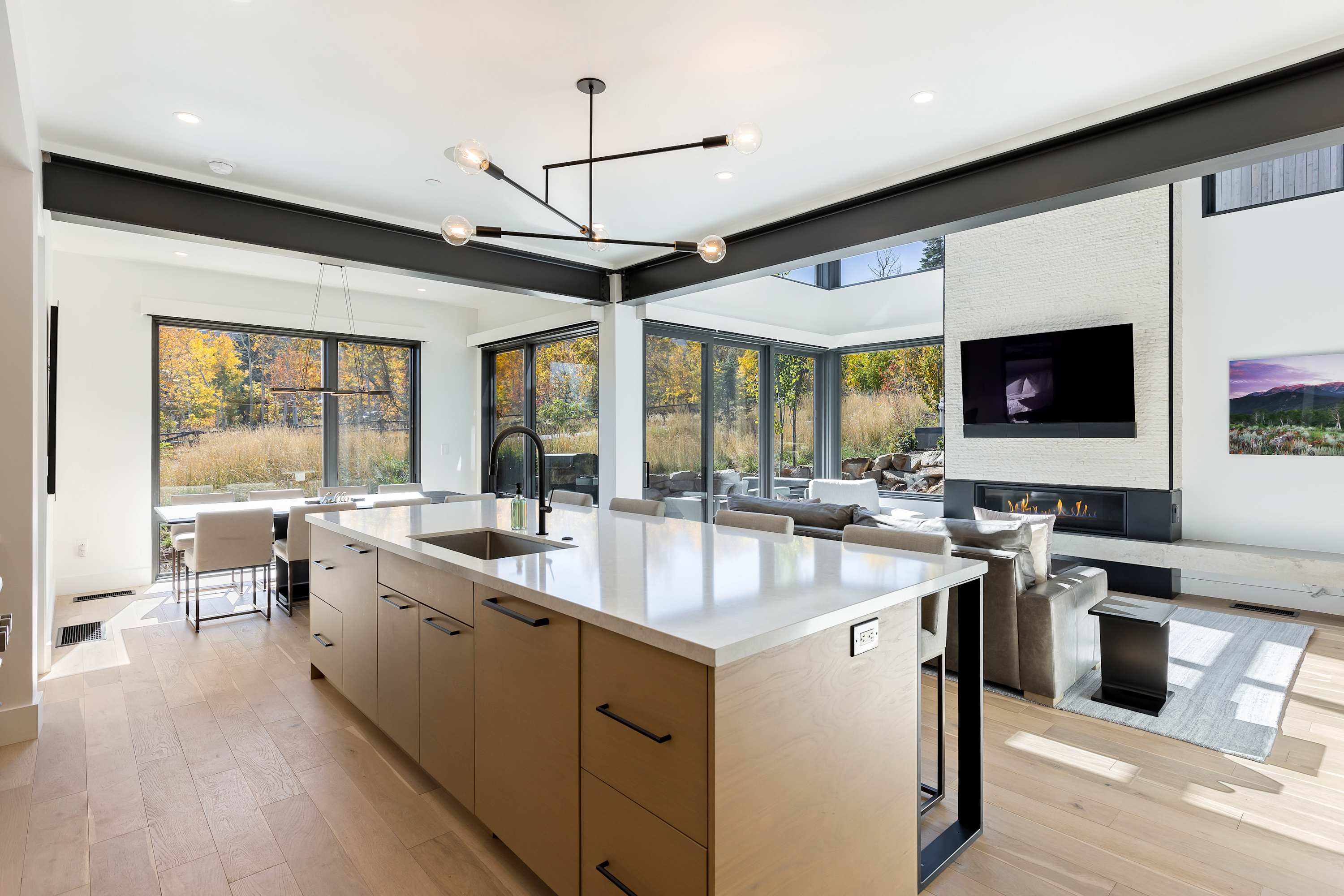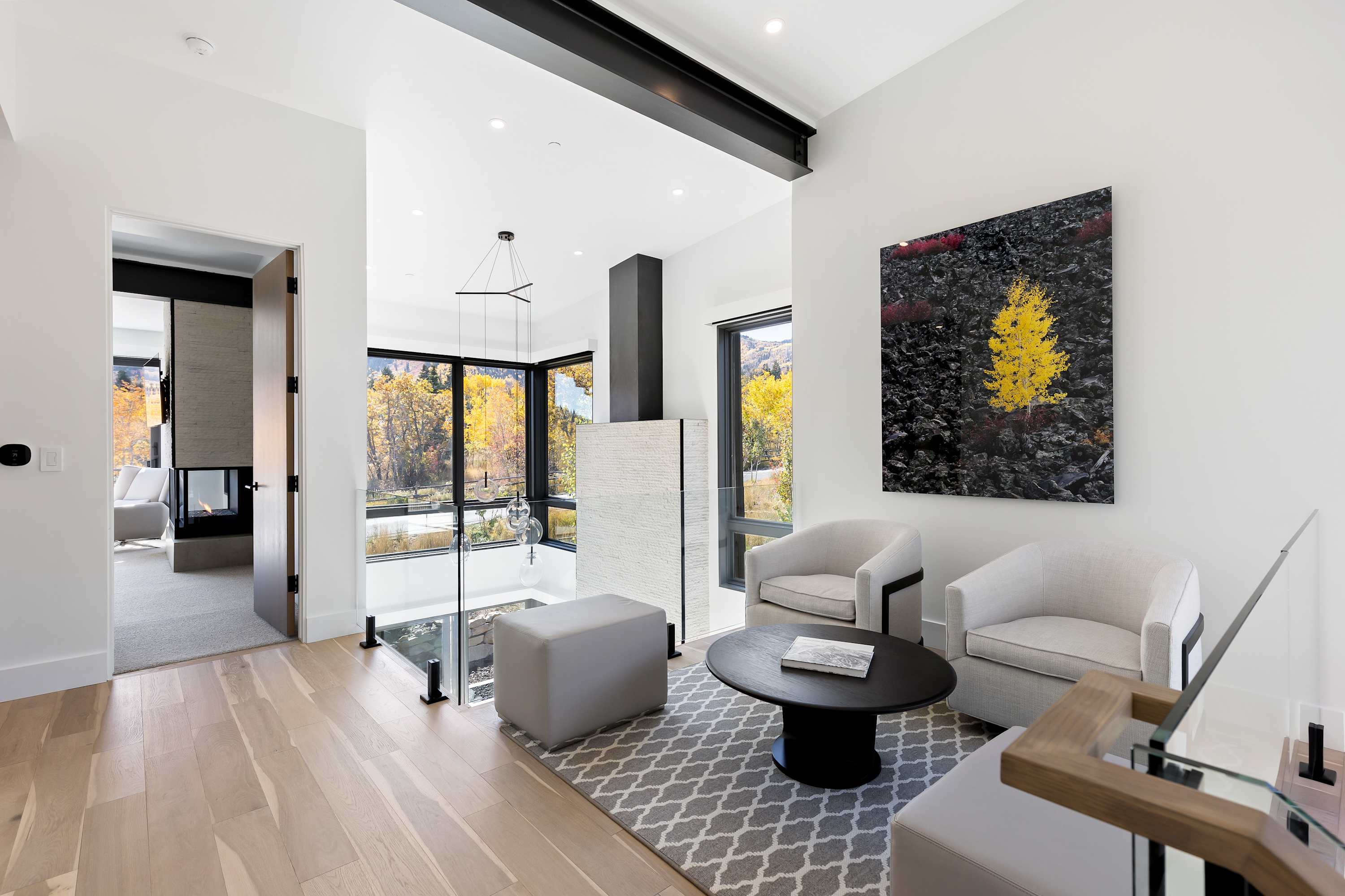 The main level's spectacular living room features contemporary RH furnishings, an inviting gas fireplace, vaulted ceiling and a wall of windows that bring in stunning views and natural light.