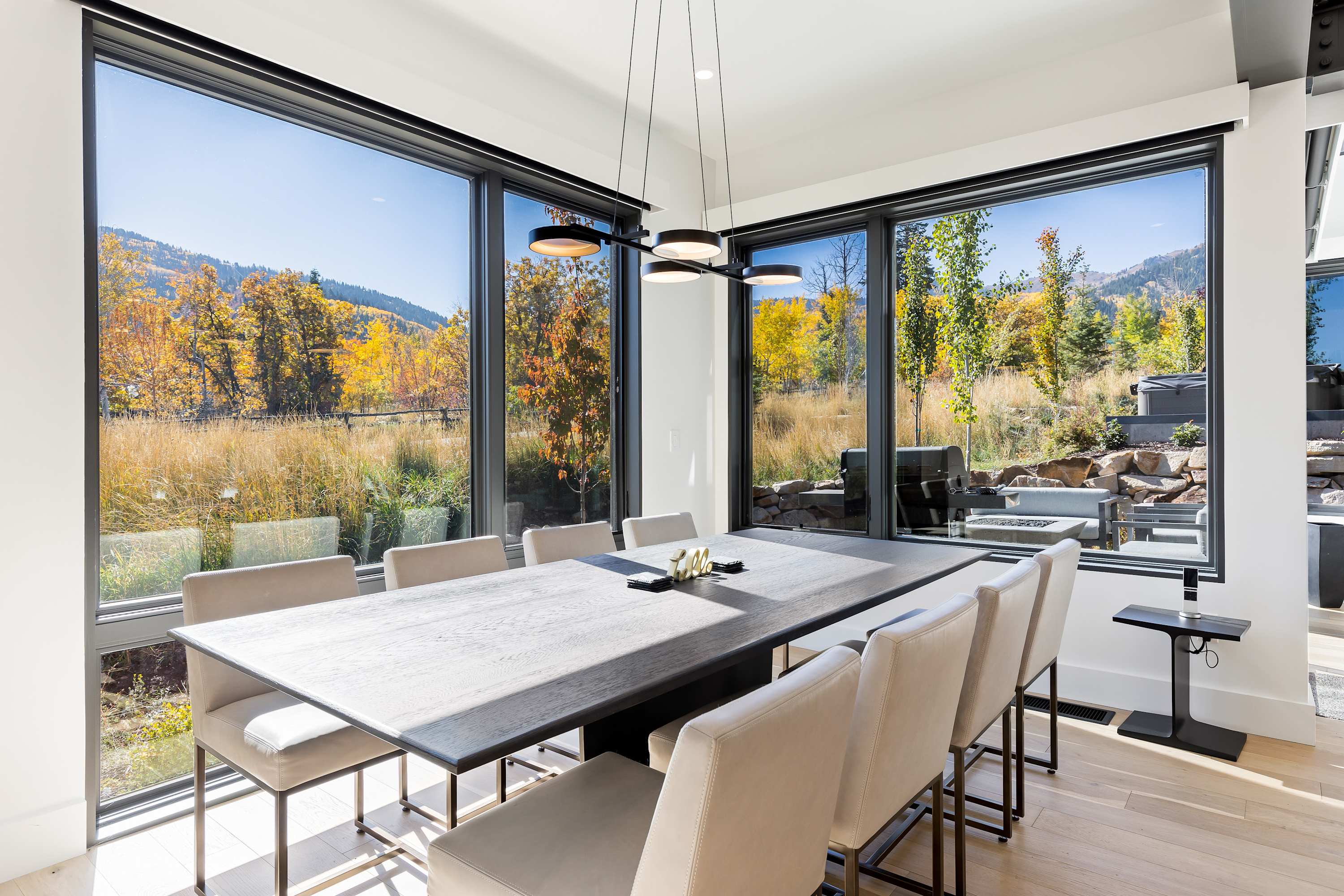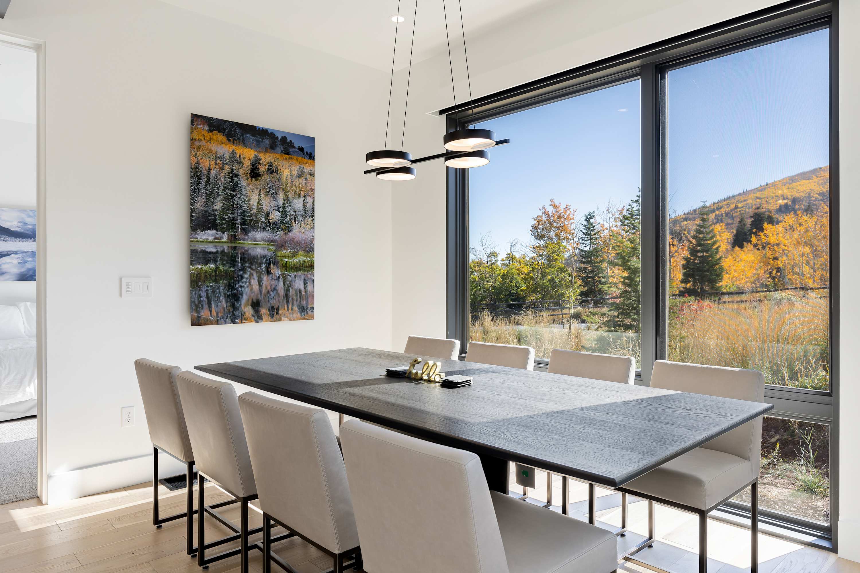 The Space: Welcome to your luxurious, three-level mountain getaway. This home features a gourmet kitchen with high-end stainless steel Thermador and Bosch appliances and a lovely kitchen island with bar seating for four. The dining area offers a modern RH table with seating for eight.
