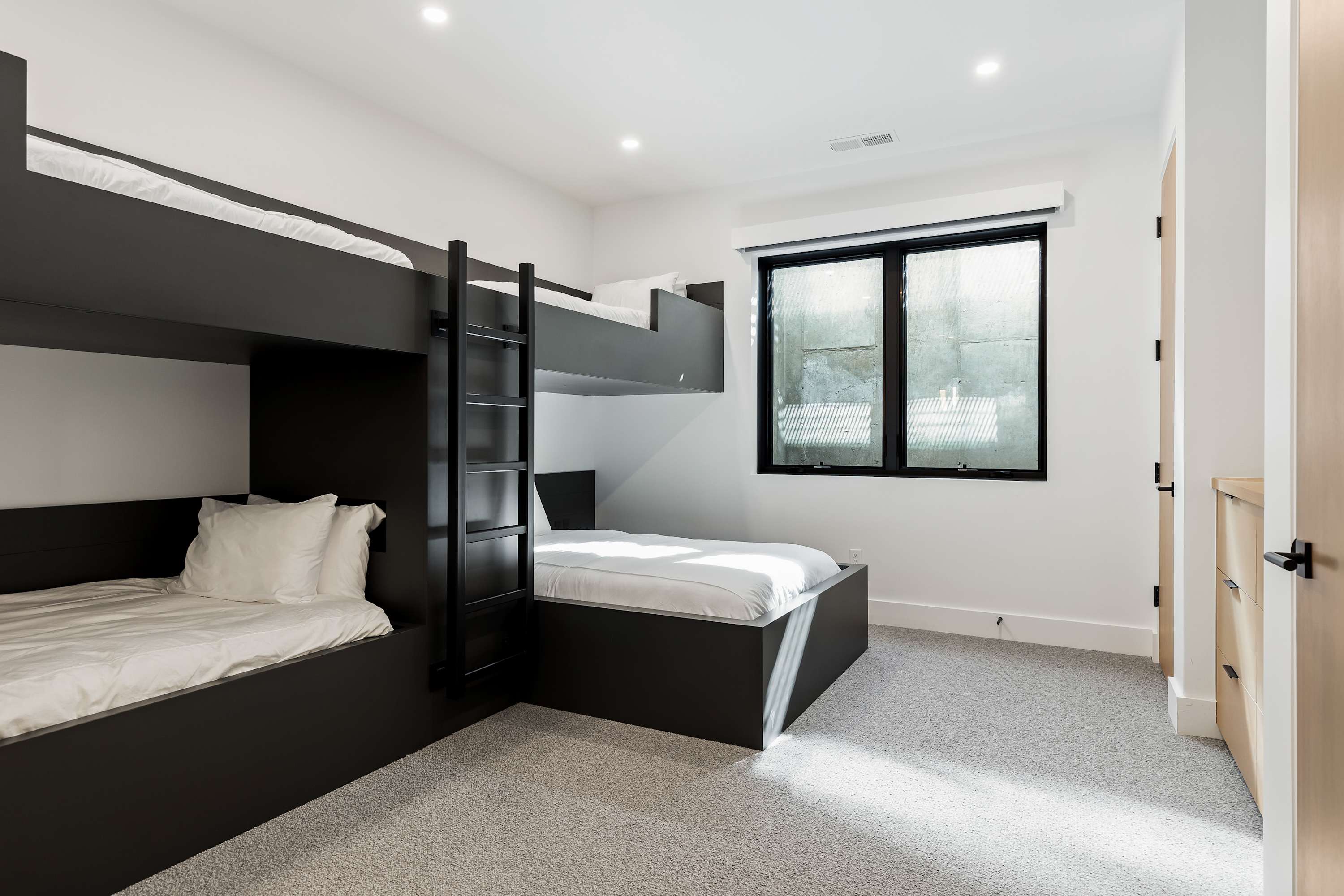 Lower Level: Bedroom 5 (bunk room) has two twin XL beds over a full XL and a twin XL bed, a 55” Smart TV, and private access to a shared bathroom with two vanities and a large walk-in shower.